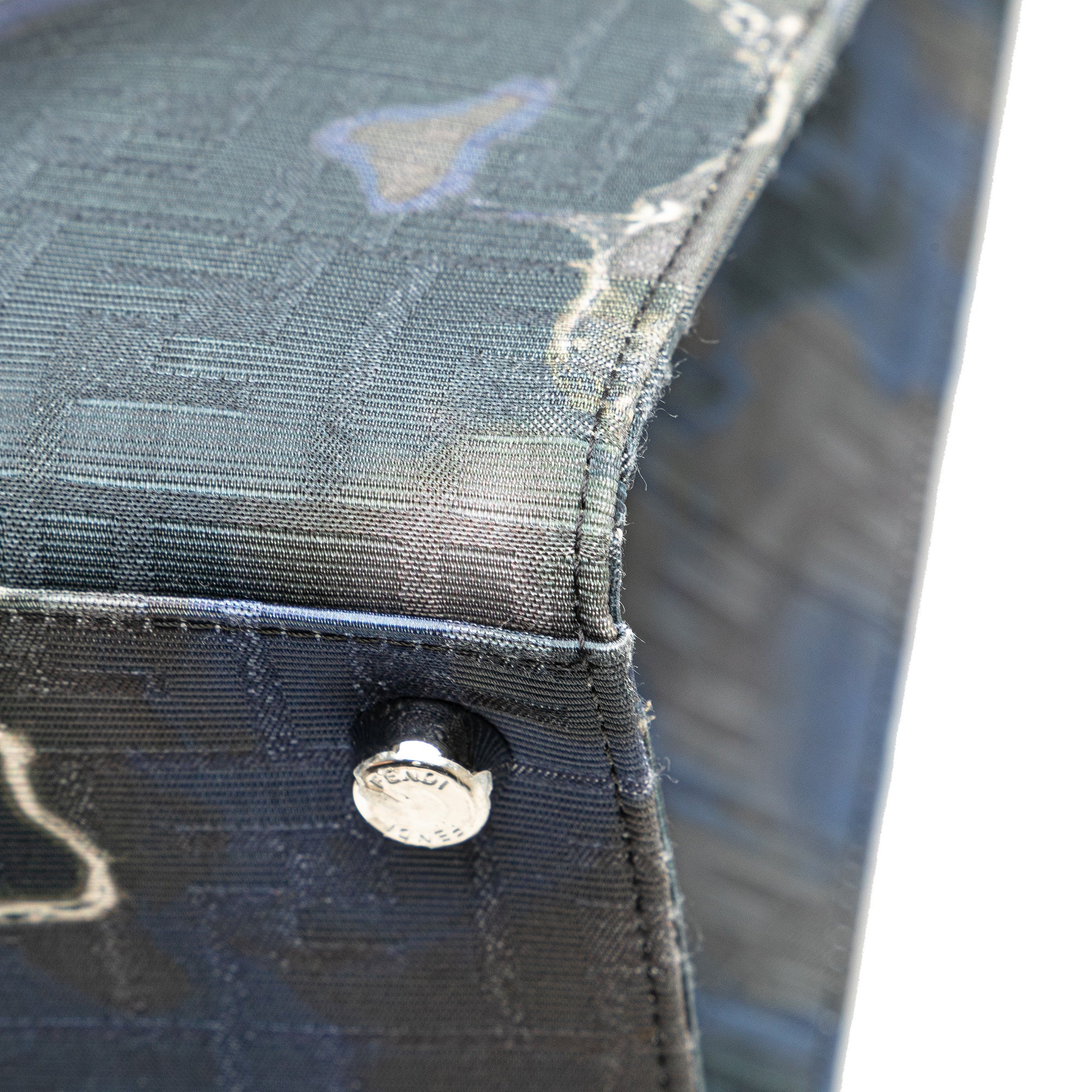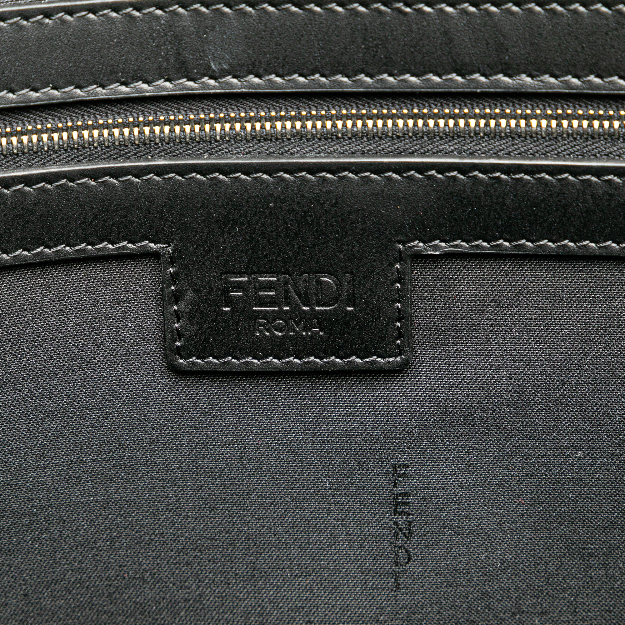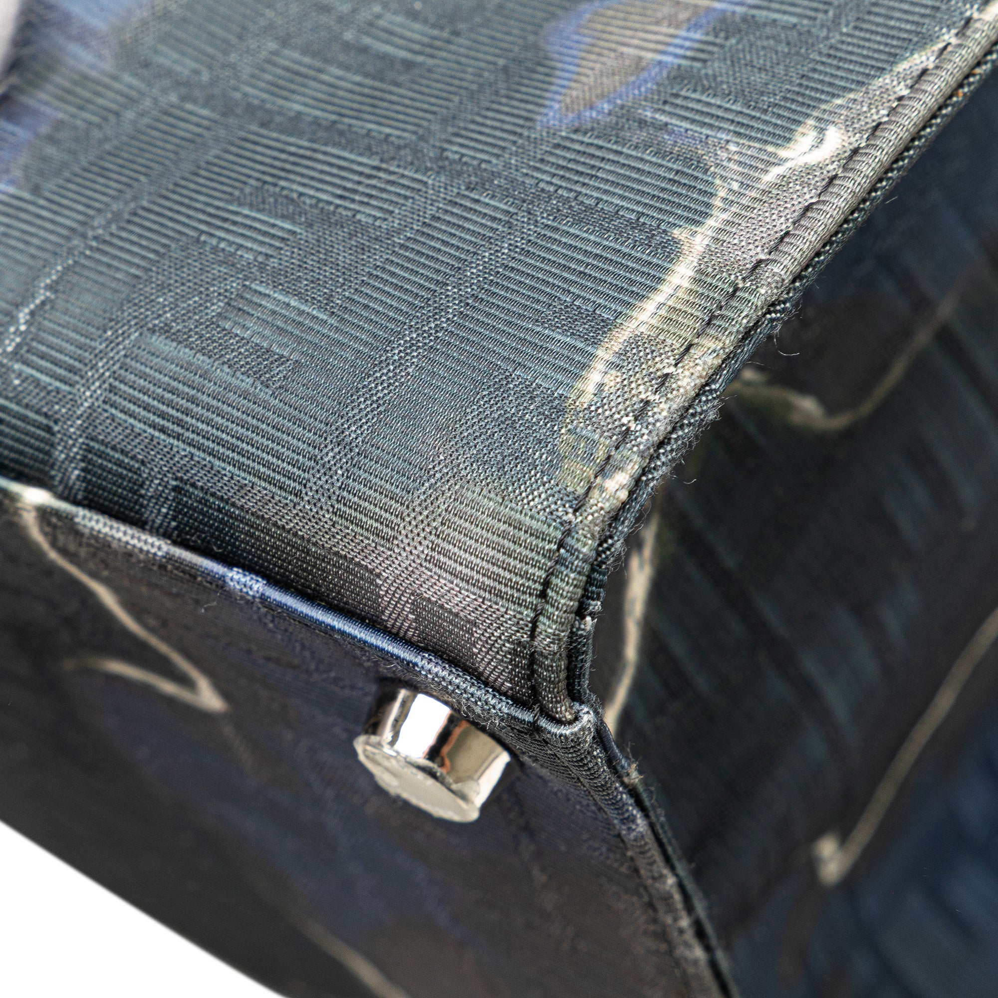 This satchel features a jacquard body with leather trim, flat leather handles, an adjustable and detachable flat leather strap, an open top, and an interior zip pocket. Retail Price: 2150.00