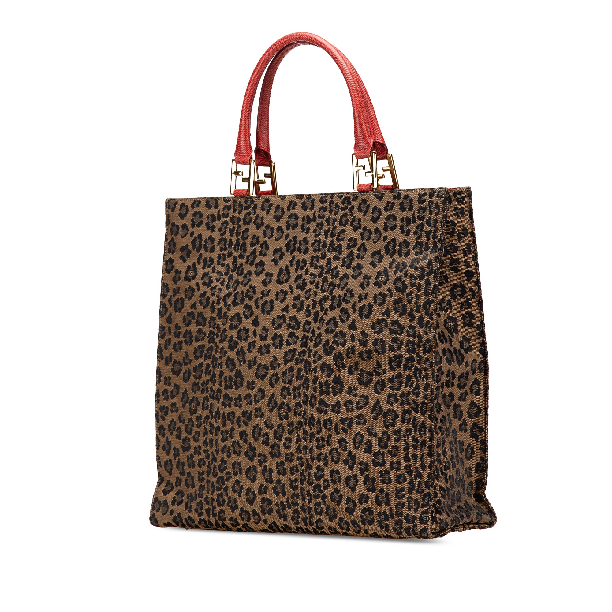 This tote bag features a printed canvas body, rolled leather top handles, an open top with magnetic snap closure, and an interior zip pocket. Inclusion: Dust bag. Retail Price: 1250.00