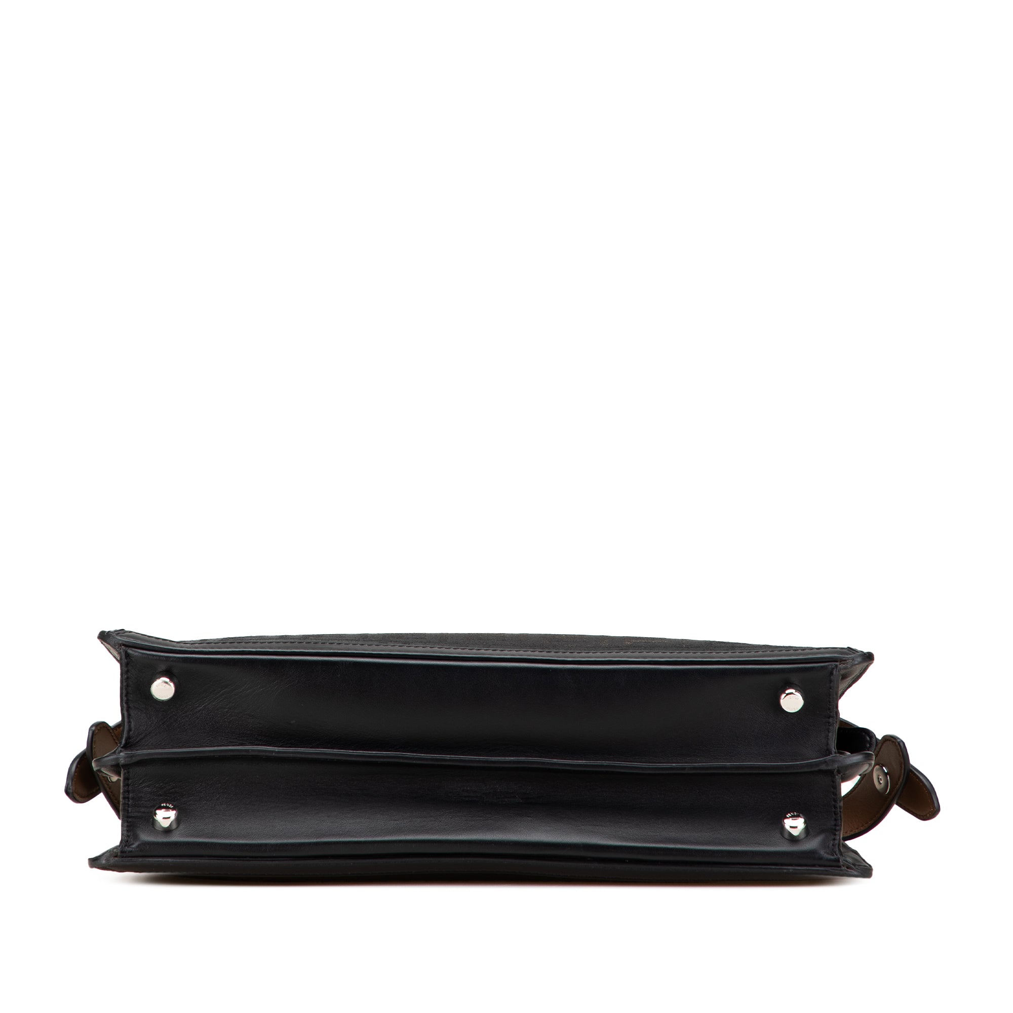 This business bag features a canvas body with leather trim, a flat leather top handle, a detachable flat leather strap, an open top with clasp closure, a zip compartment, and a detachable interior zip pouch. Retail Price: 6100.00