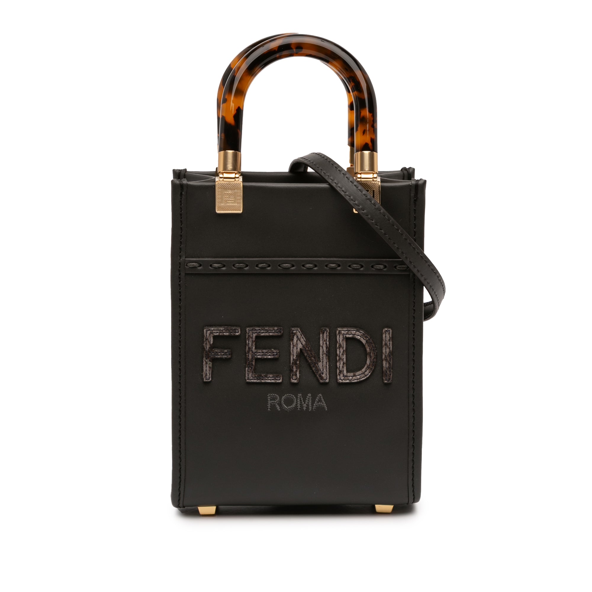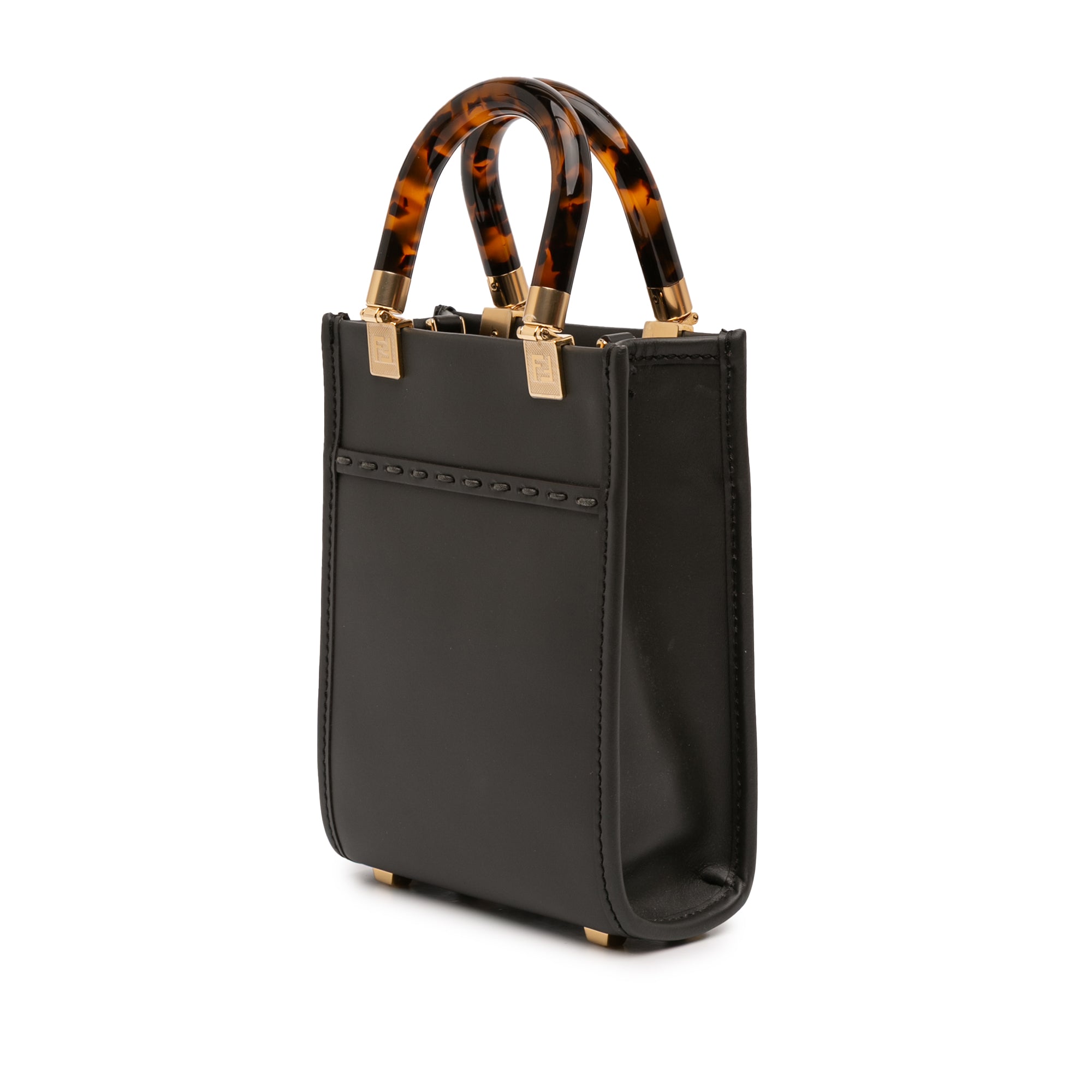 The Mini Sunshine Shopper features a leather body, rolled acrylic top handles, a detachable flat leather shoulder strap, and an open top. Inclusion: Dust bag, box. Retail Price: 1980.00