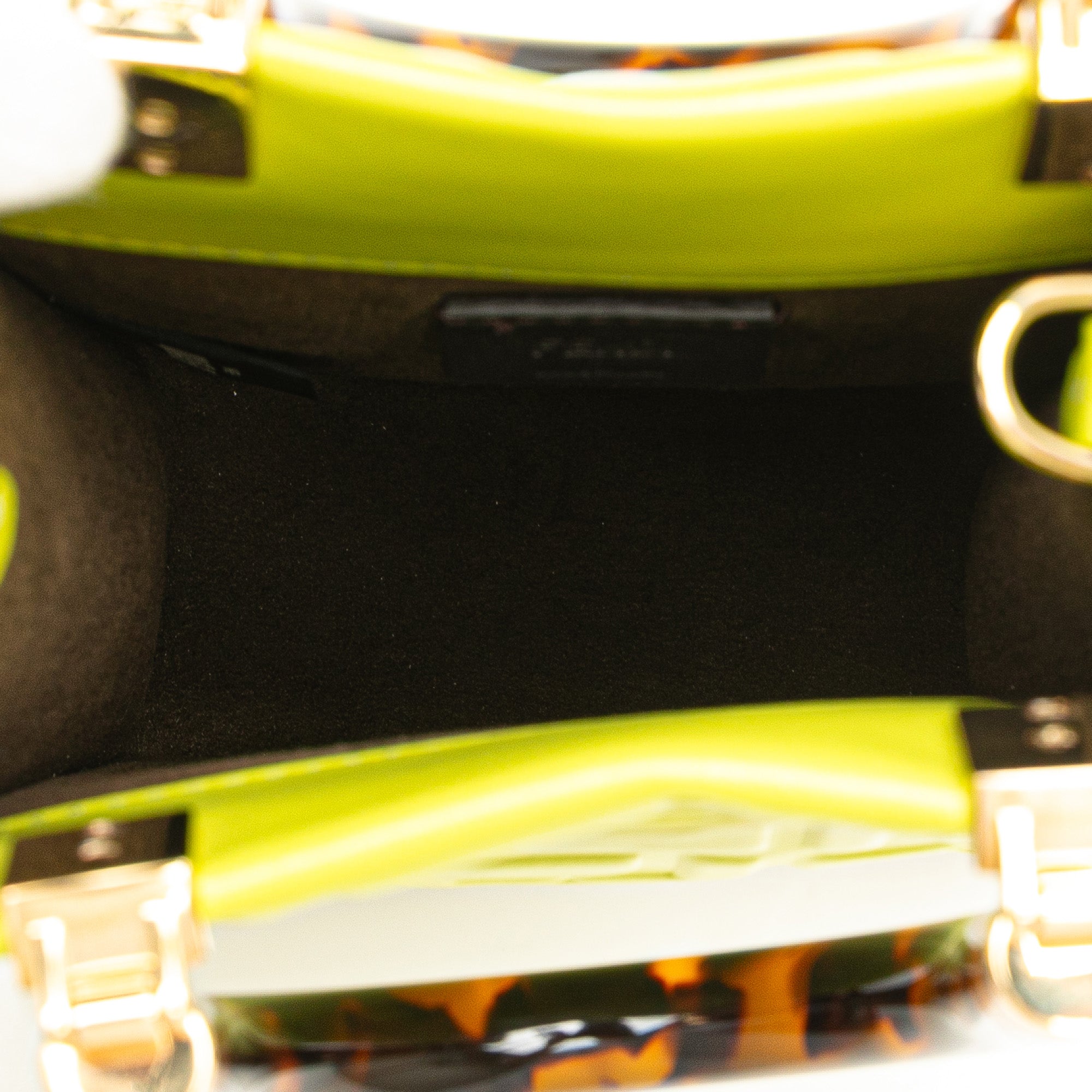 The Sunshine Shopper Tote features an embossed leather body, rolled acrylic top handles, a detachable flat leather shoulder strap, and an open top. Inclusion: Dust bag. Retail Price: 1980.00