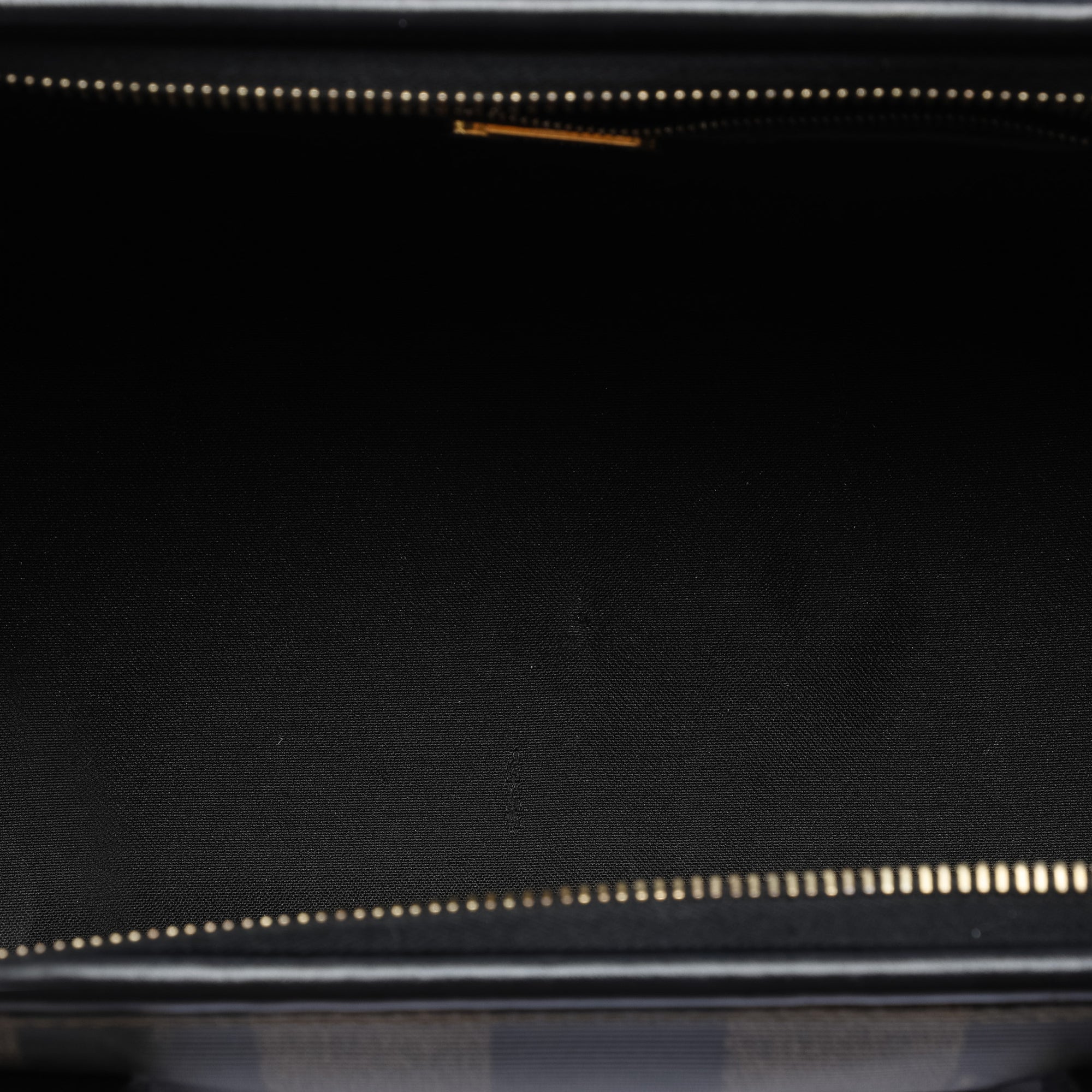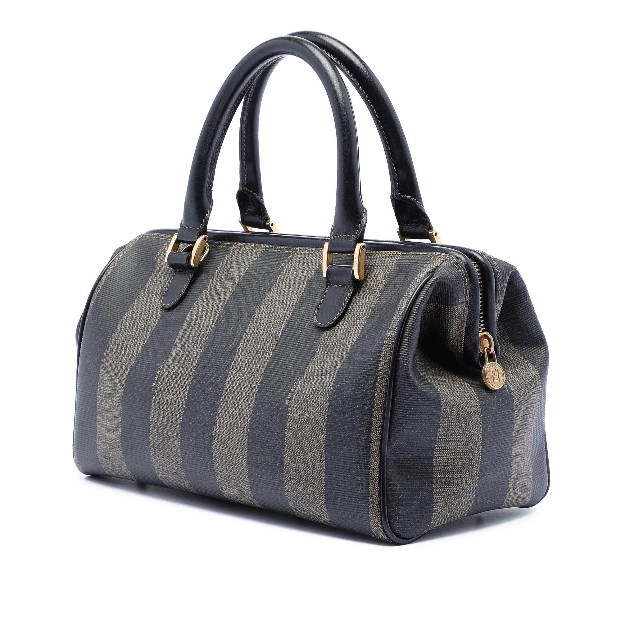 This boston bag features a coated canvas body with leather trim, rolled leather handles, a top zip closure, and an interior zip pocket. Retail Price: 700.00