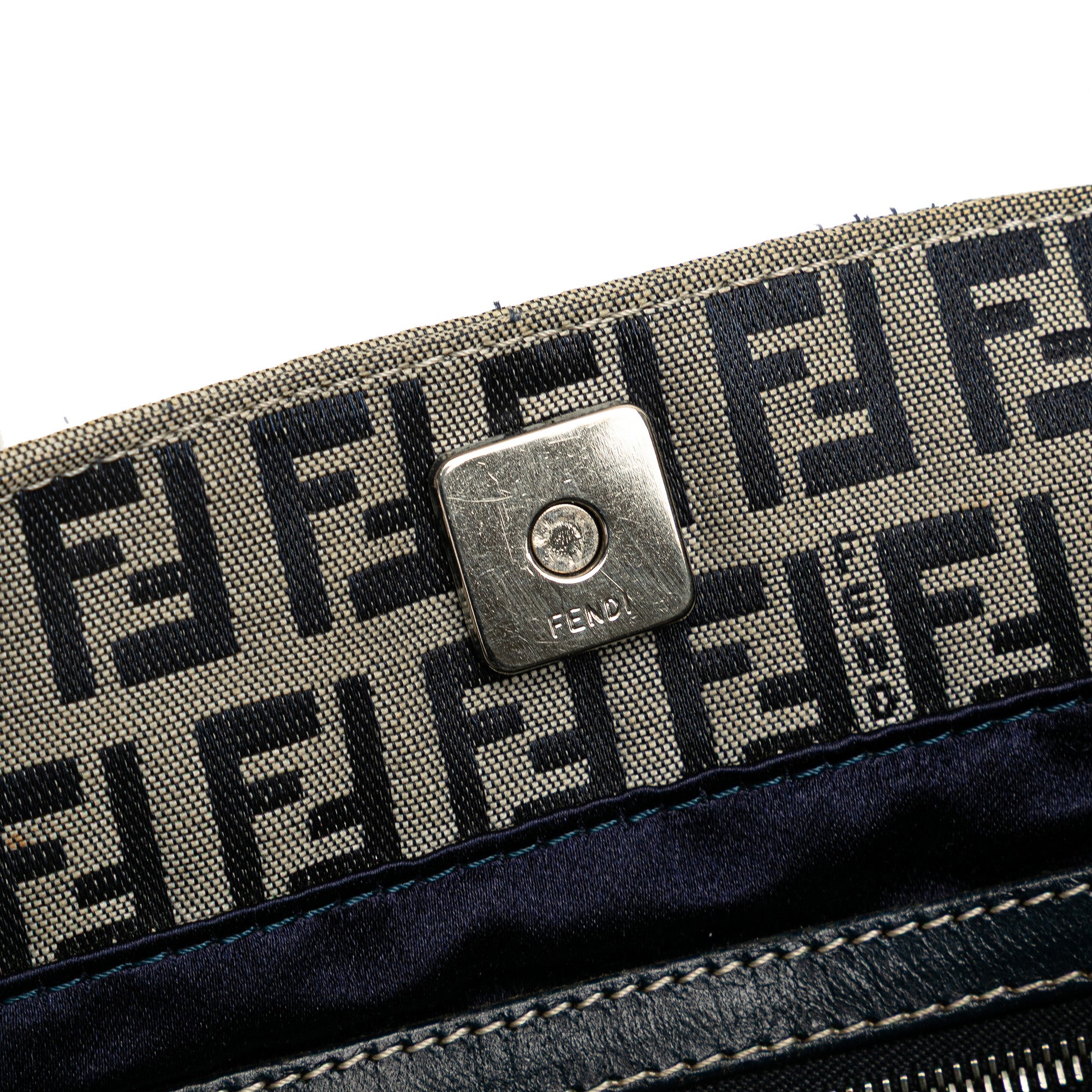 This tote bag features a canvas body with leather trim, flat leather handles, an open top with magnetic snap closure, and an interior zip pocket. Retail Price: 860.00
