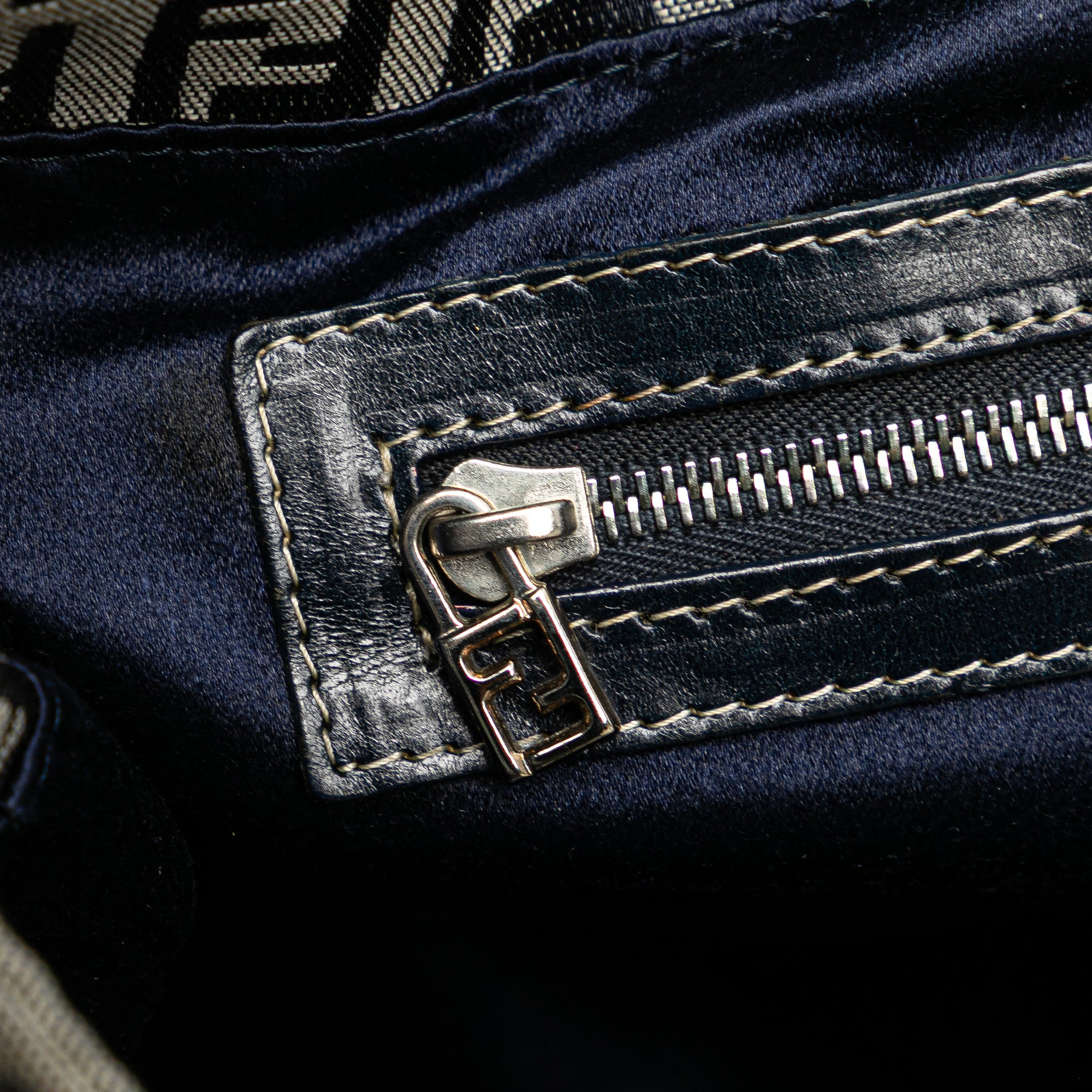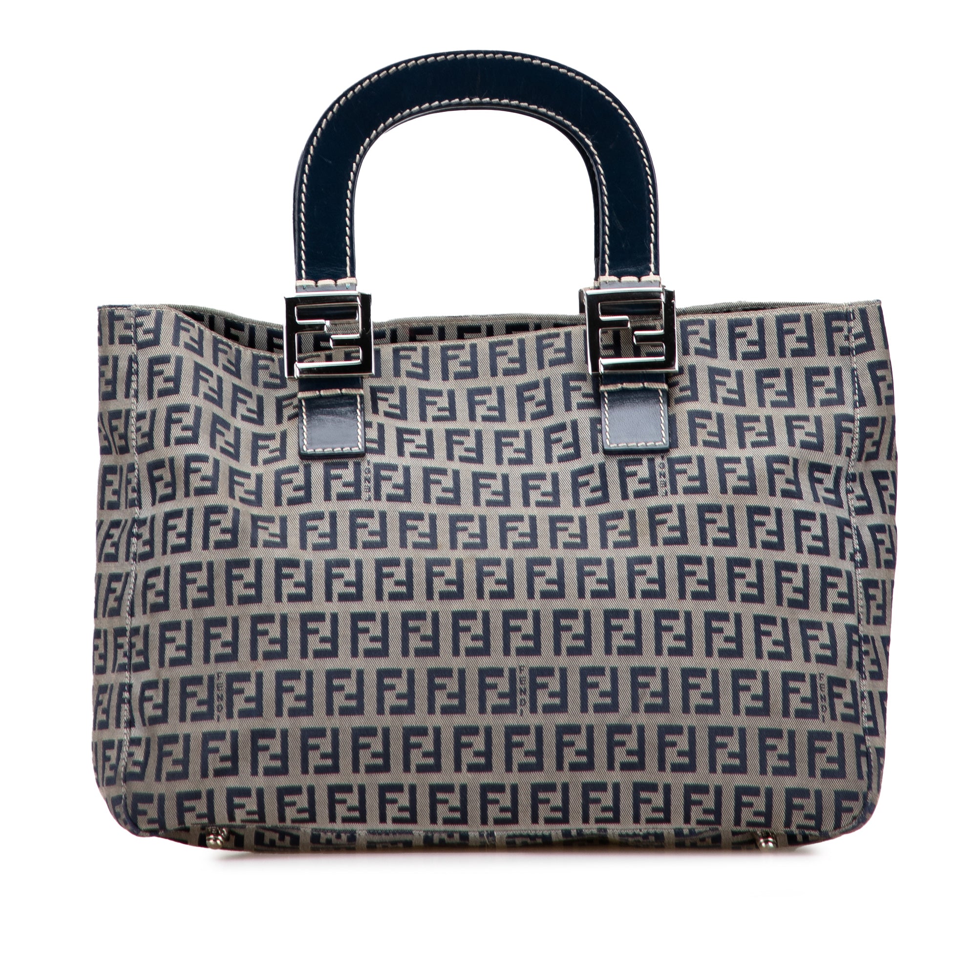 This tote bag features a canvas body with leather trim, flat leather handles, an open top with magnetic closure, and an interior zip pocket. Retail Price: 860.00