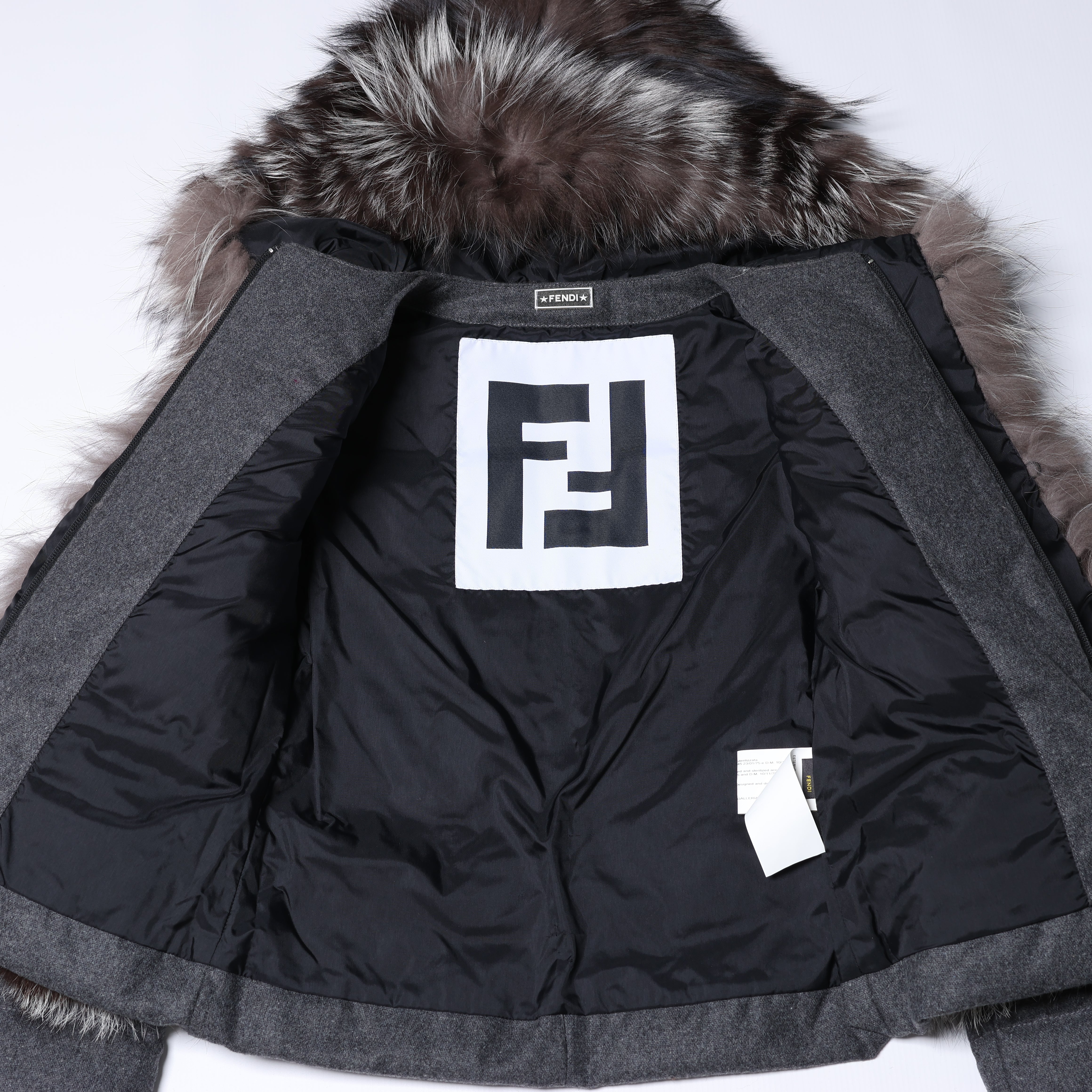 Luxurious Fendi puffer jacket made from a premium wool blend, detailed with plush fox fur trim. Featuring a sleek zippered front and a voluminous fur-lined hood, this piece combines style and warmth for the colder seasons.Brand: Fendi