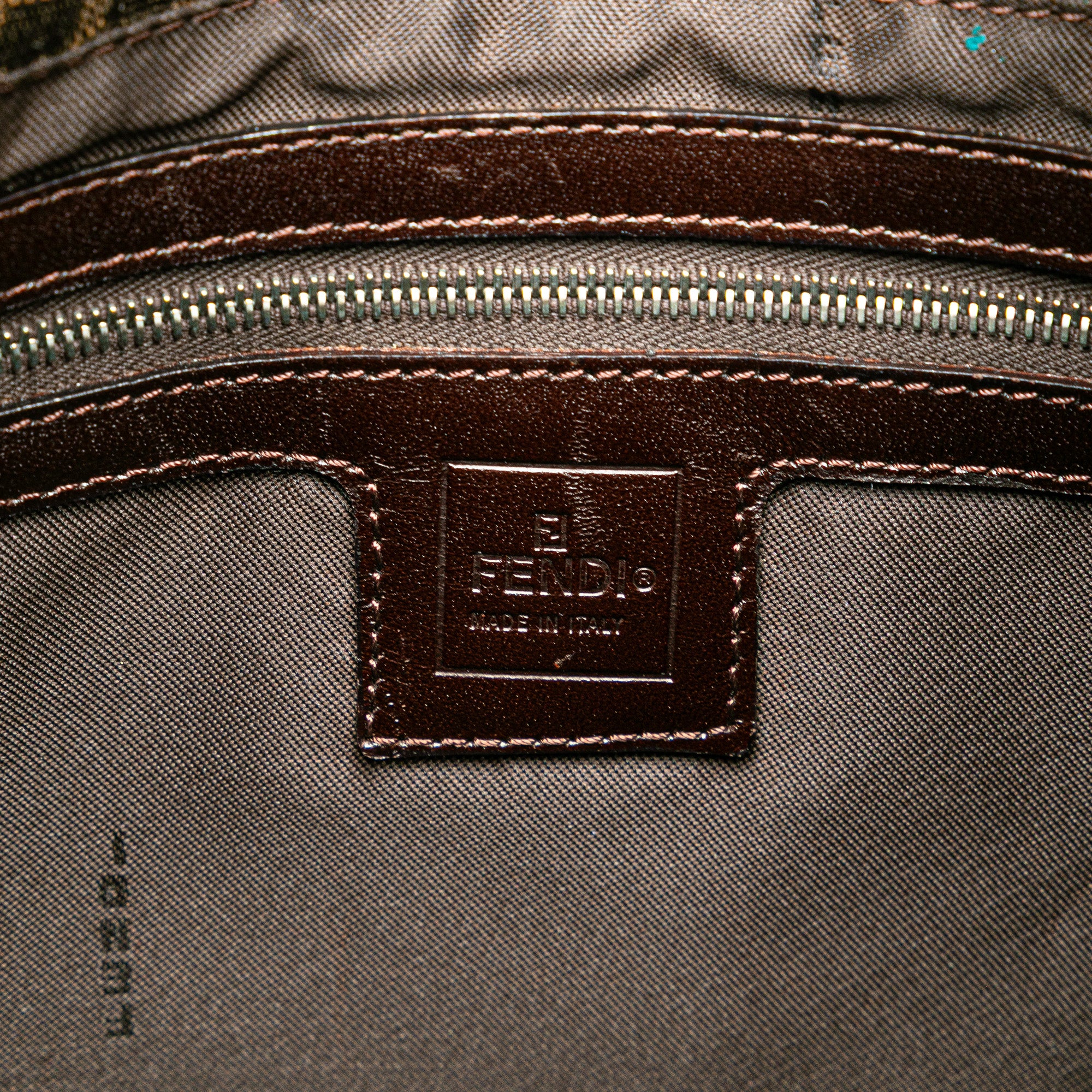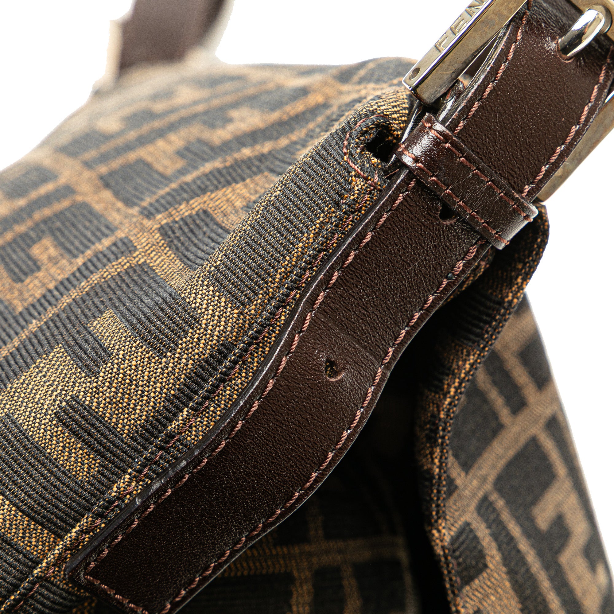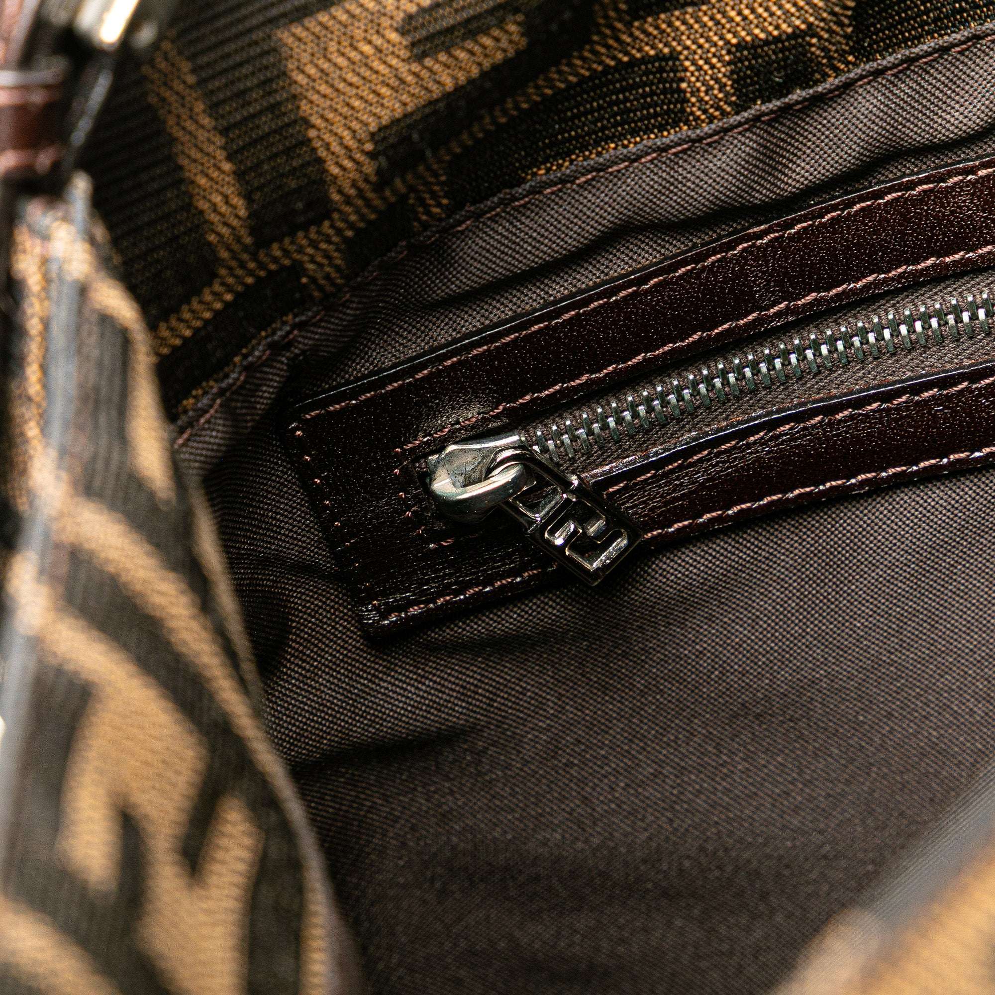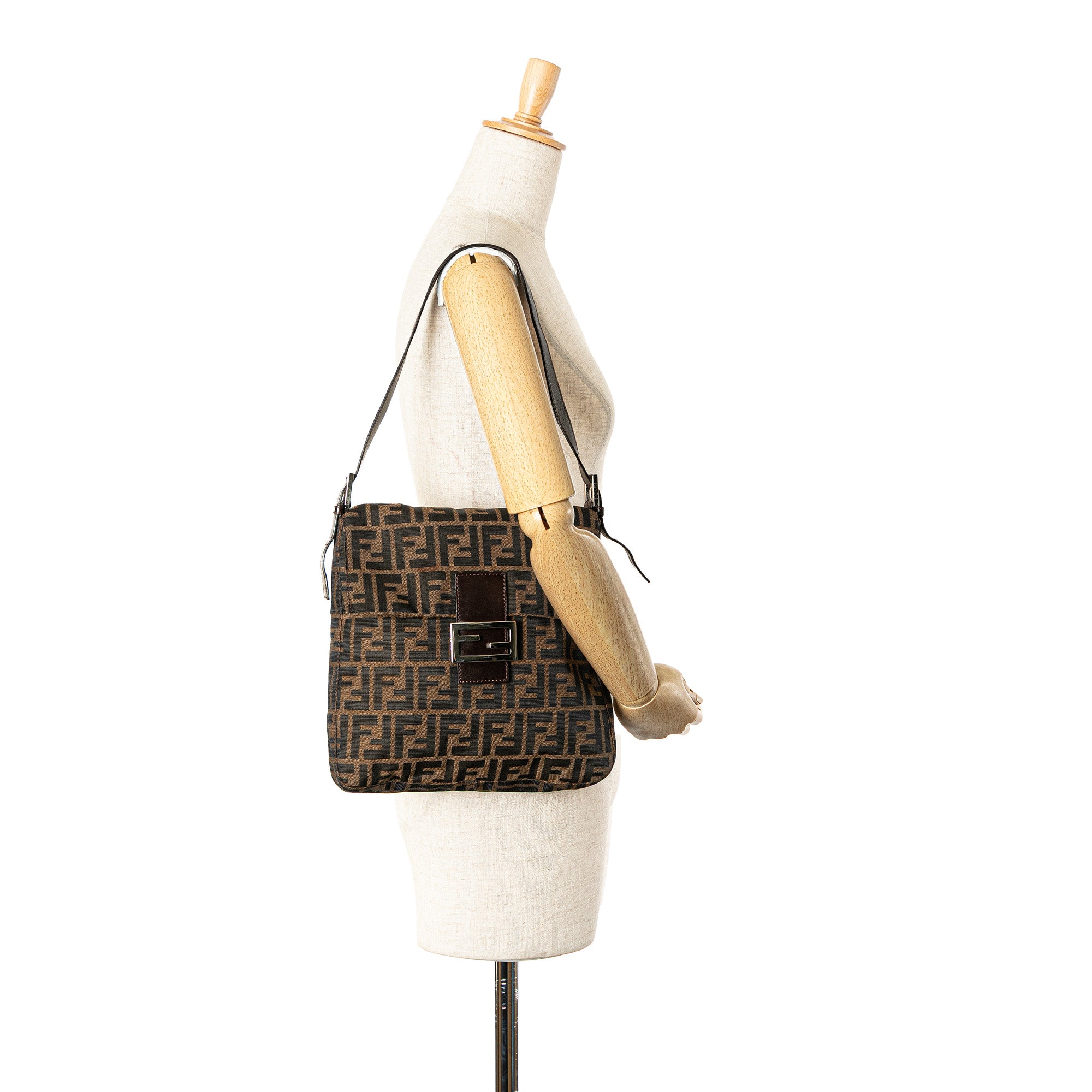 This shoulder bag features a canvas body, an adjustable flat leather shoulder strap, a front flap with flat leather strap and magnetic snap closure, and an interior zip pocket. Retail Price: 790.00