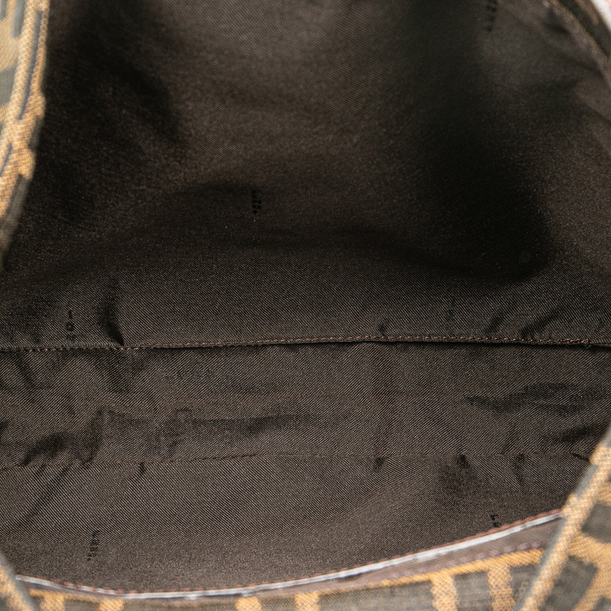 This shoulder bag features a canvas body, a flat leather strap, an open top with a flat strap and magnetic snap closure, an exterior slip pocket, and an interior zip pocket. Retail Price: 1450.00
