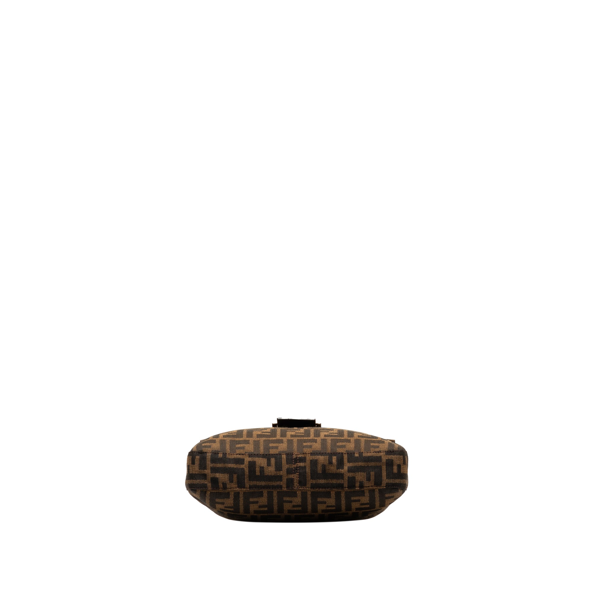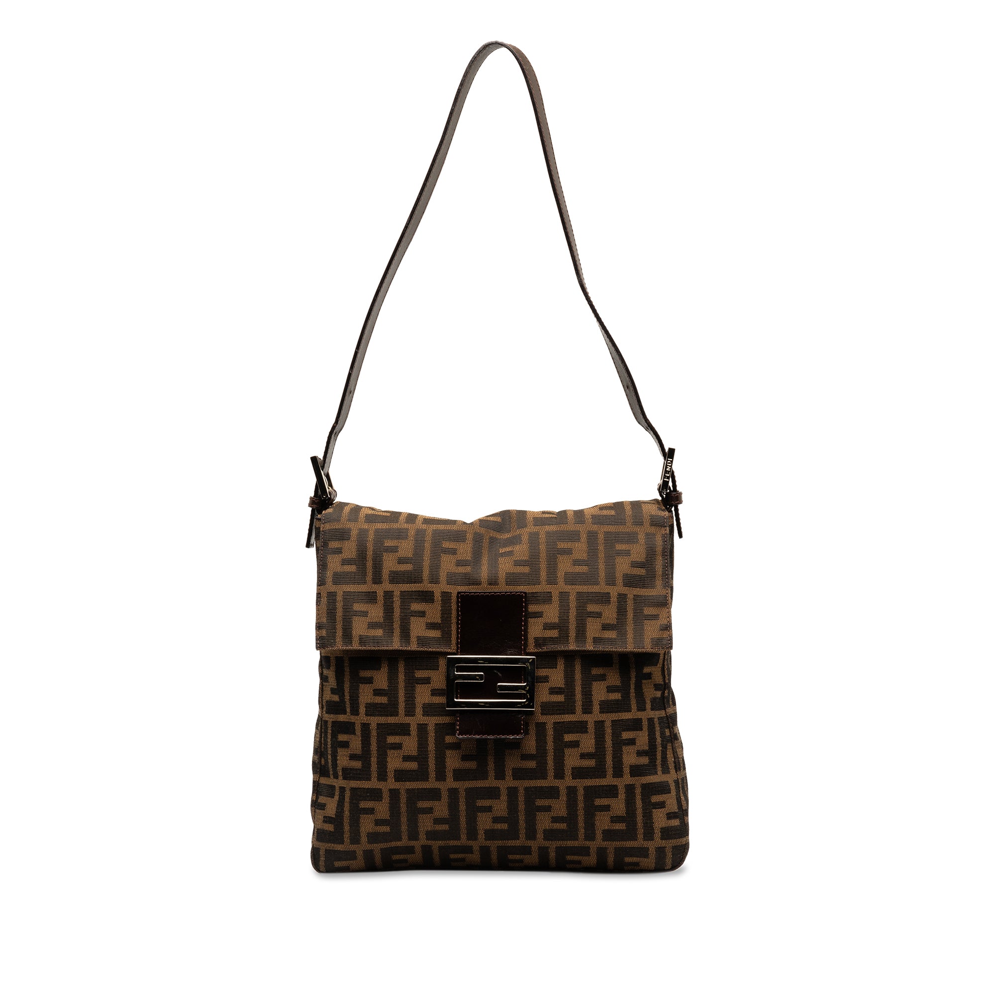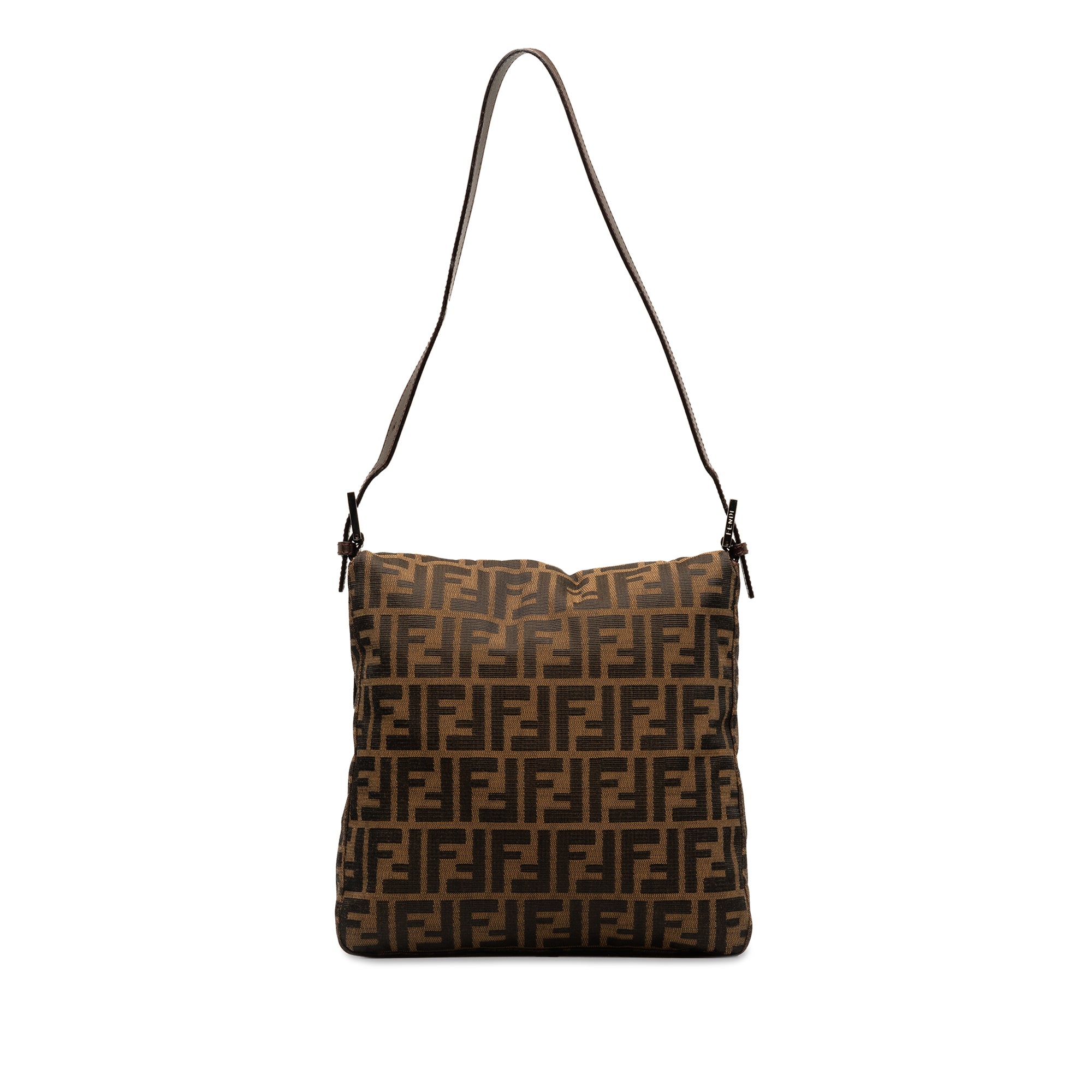 This shoulder bag features a canvas body, an adjustable flat leather strap, an exterior front flap pocket, a top zip closure, and an interior zip pocket. Retail Price: 1490.00