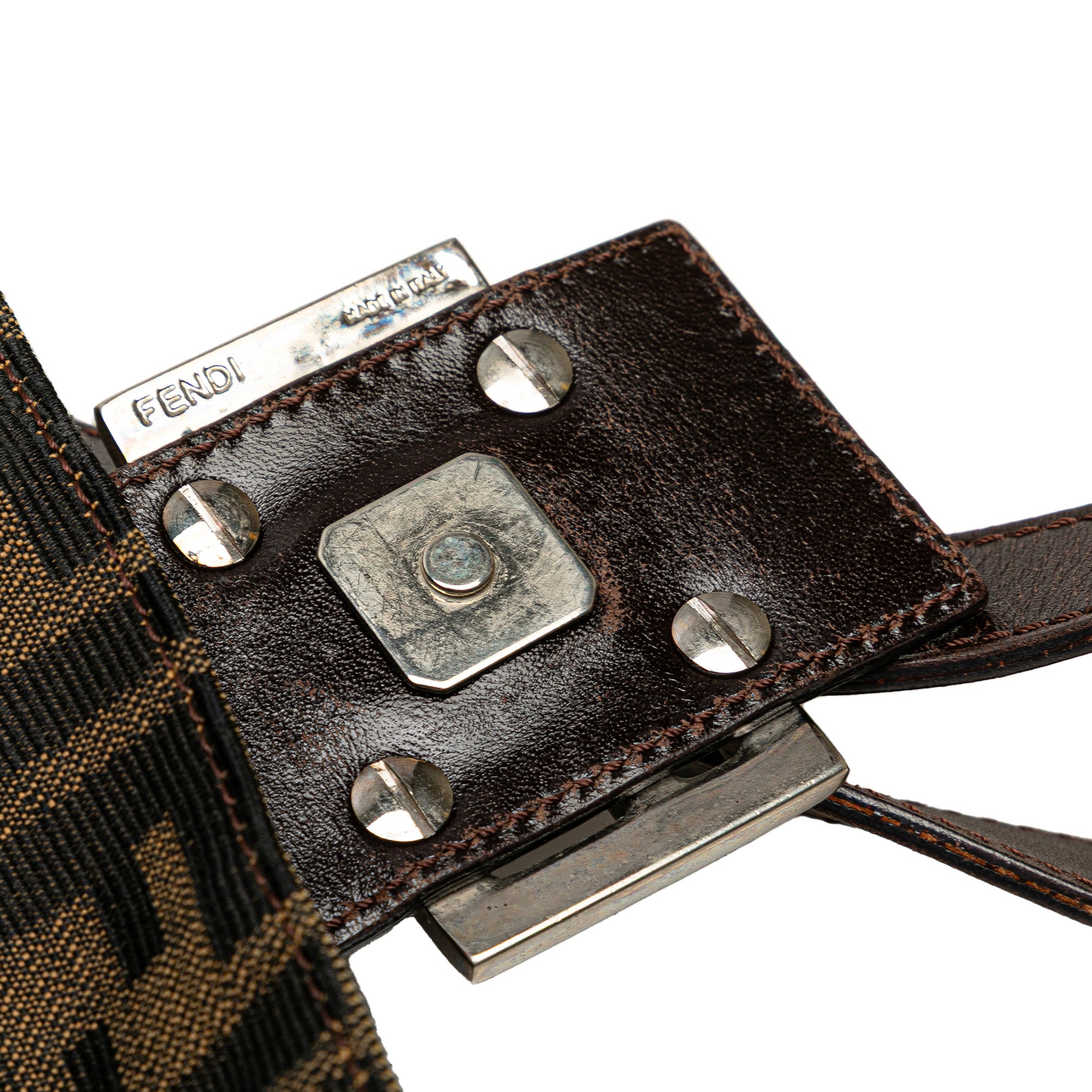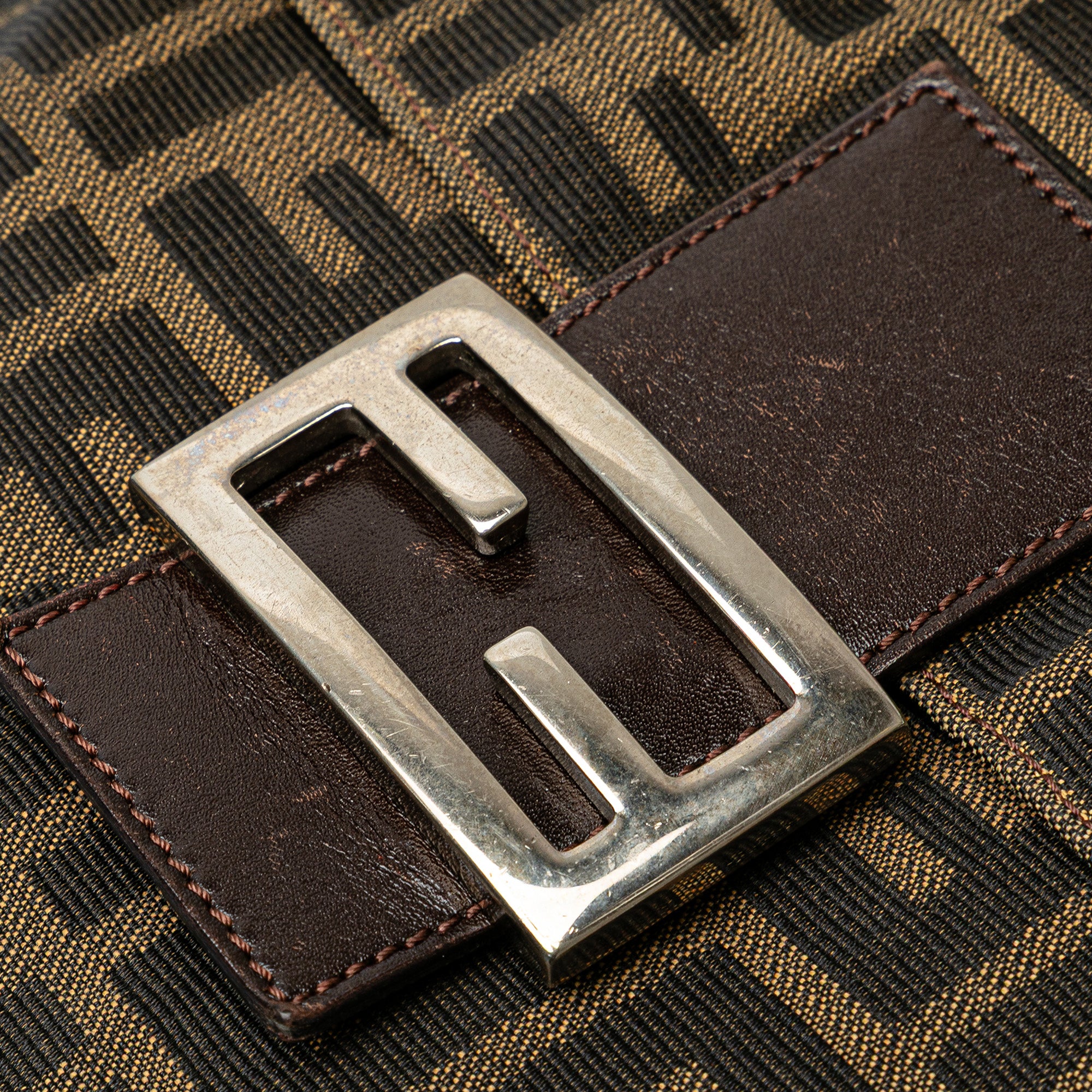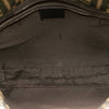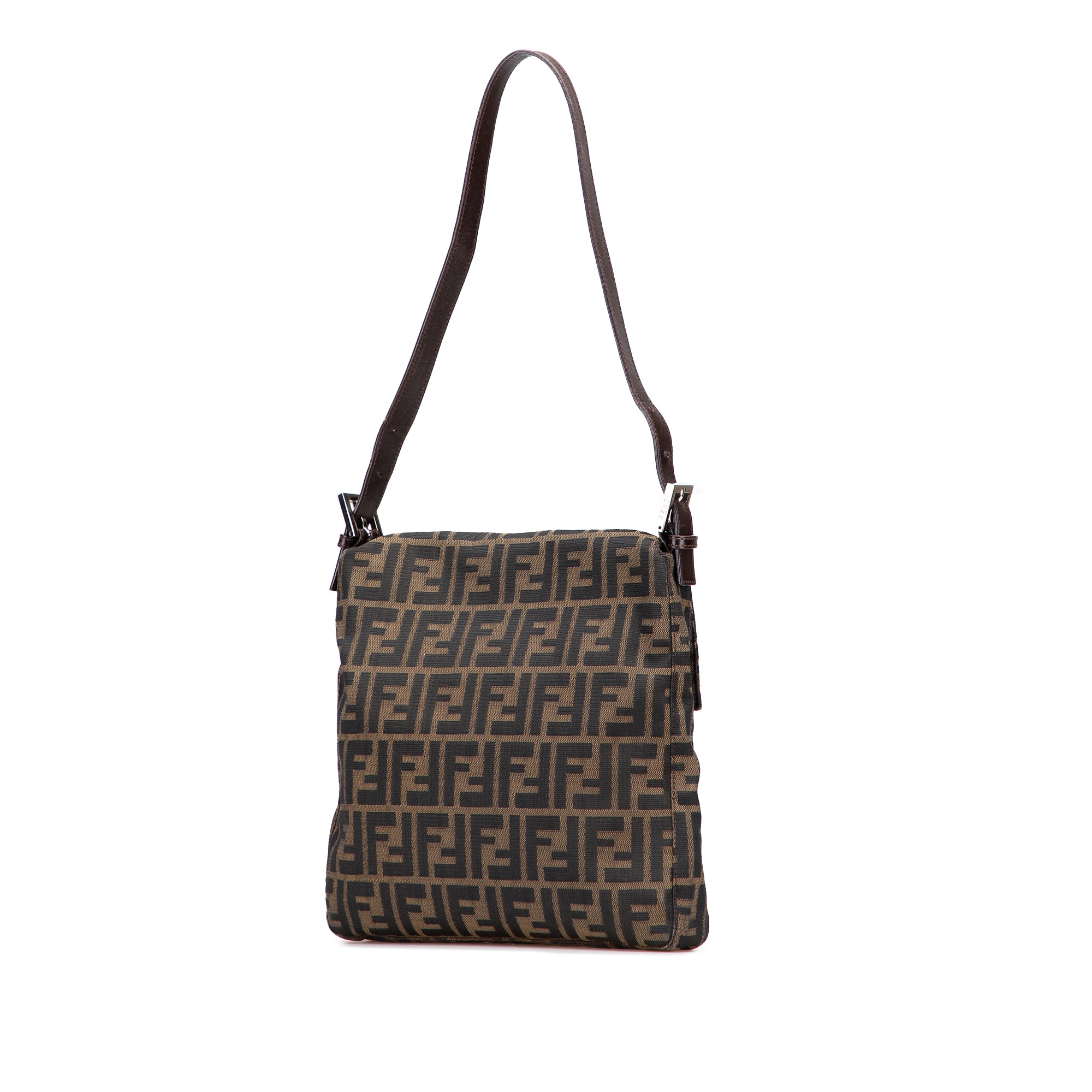 This shoulder bag features a canvas body, a flat leather strap, a front flap with magnetic snap closure, and an interior zip pocket. Retail Price: 1195.00