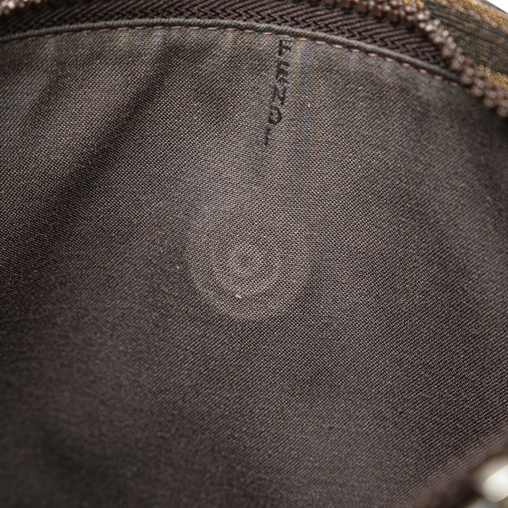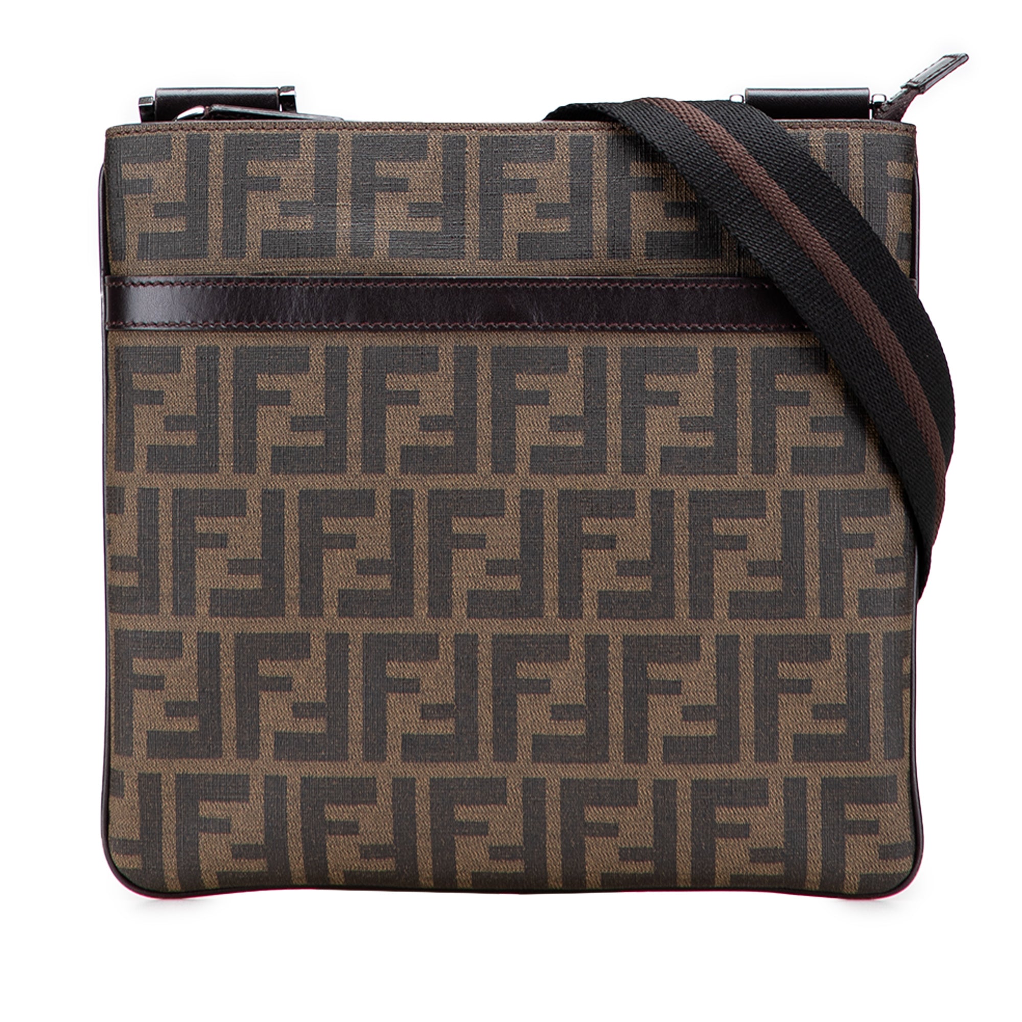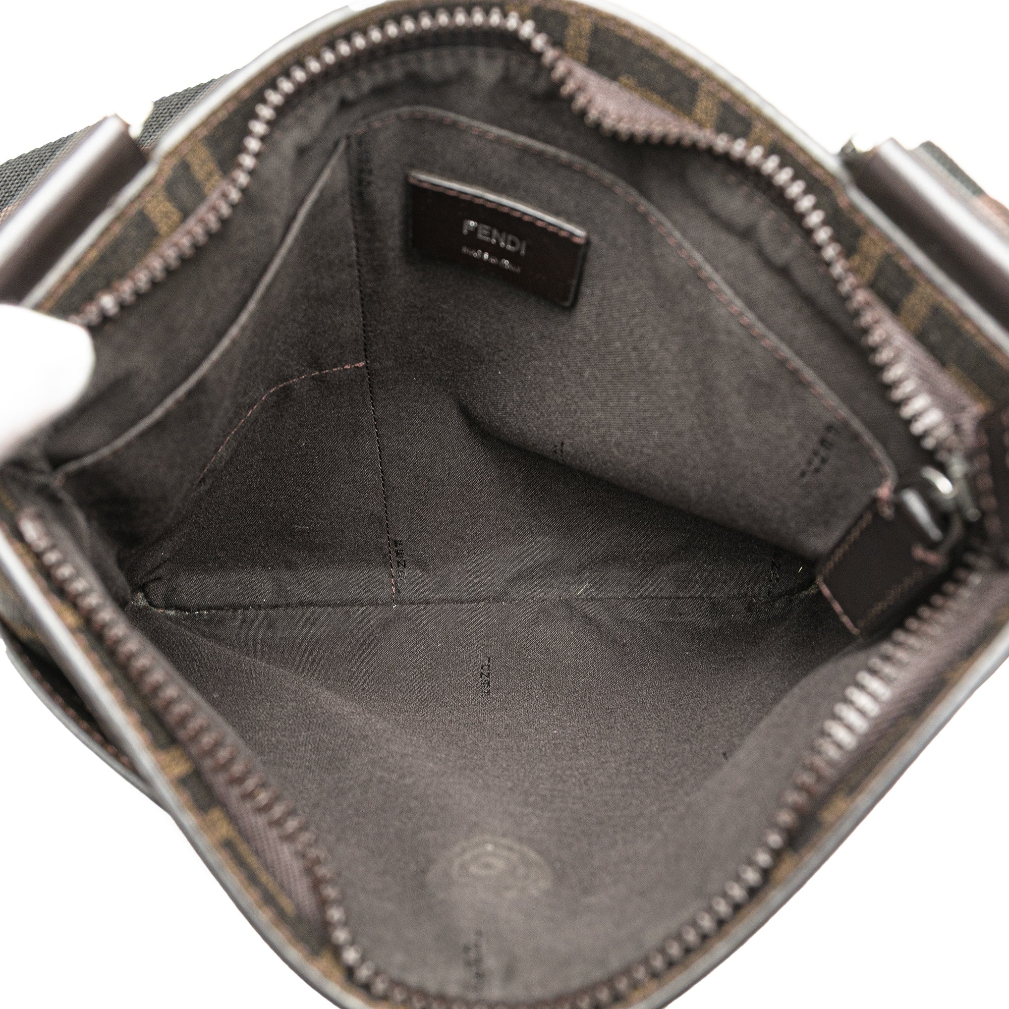 This crossbody bag features a coated canvas body with leather trim, an adjustable flat shoulder strap, a top zip closure, an exterior front slip pocket, and interior slip pockets. Retail Price: 825.00