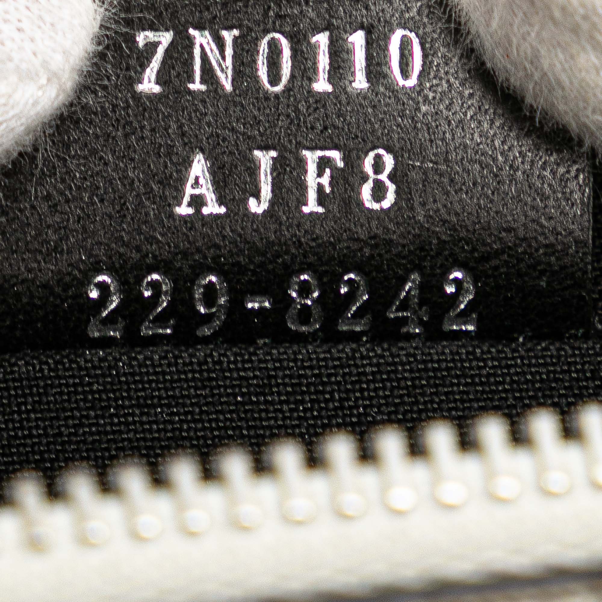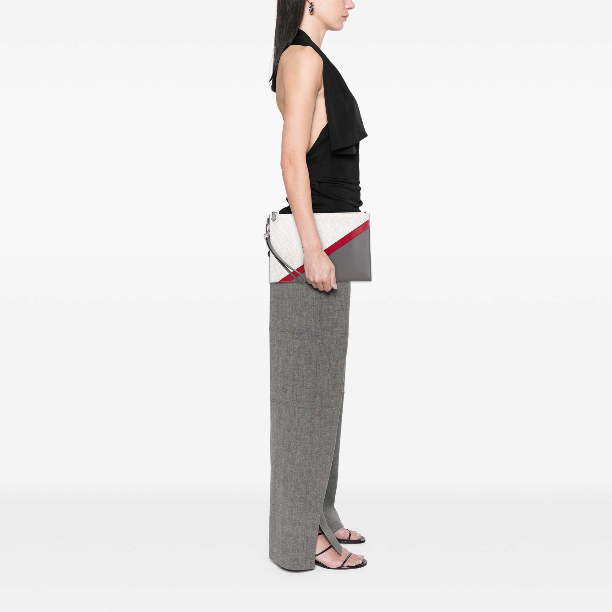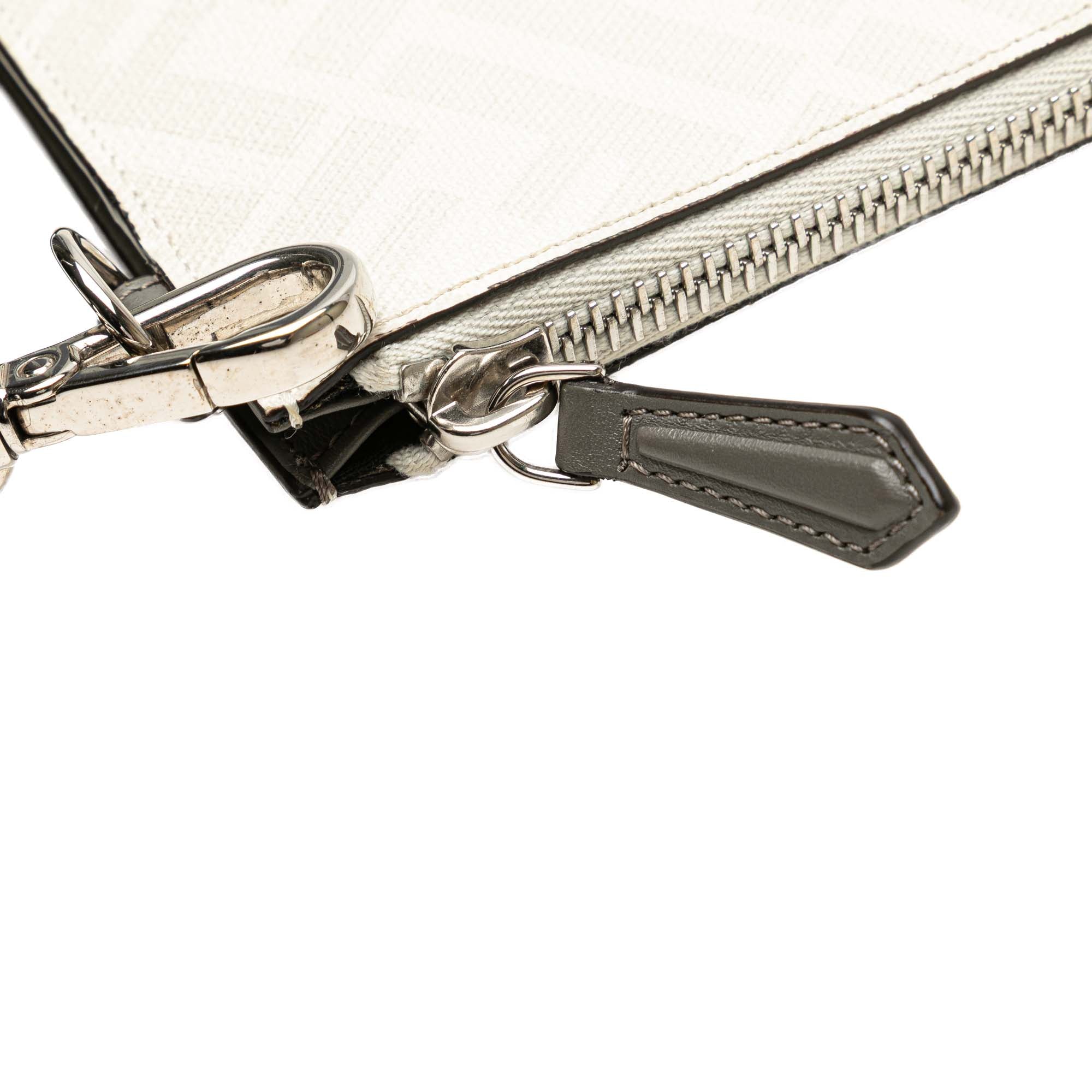This clutch bag features a coated canvas and leather body, a flat wrist strap, a top zip closure, an exterior zip pocket, and interior slip pockets. Inclusion: Dust bag. Retail Price: 700.00