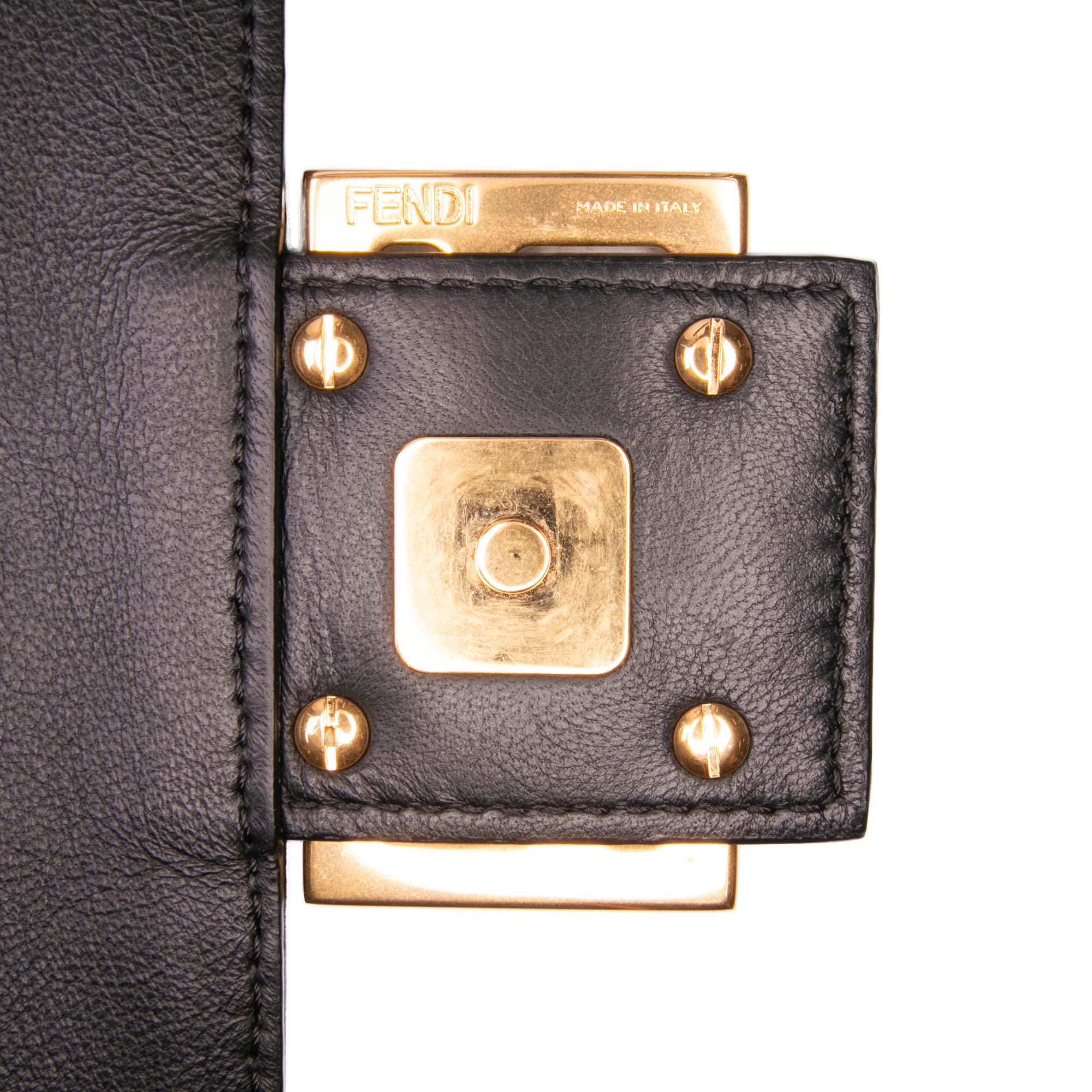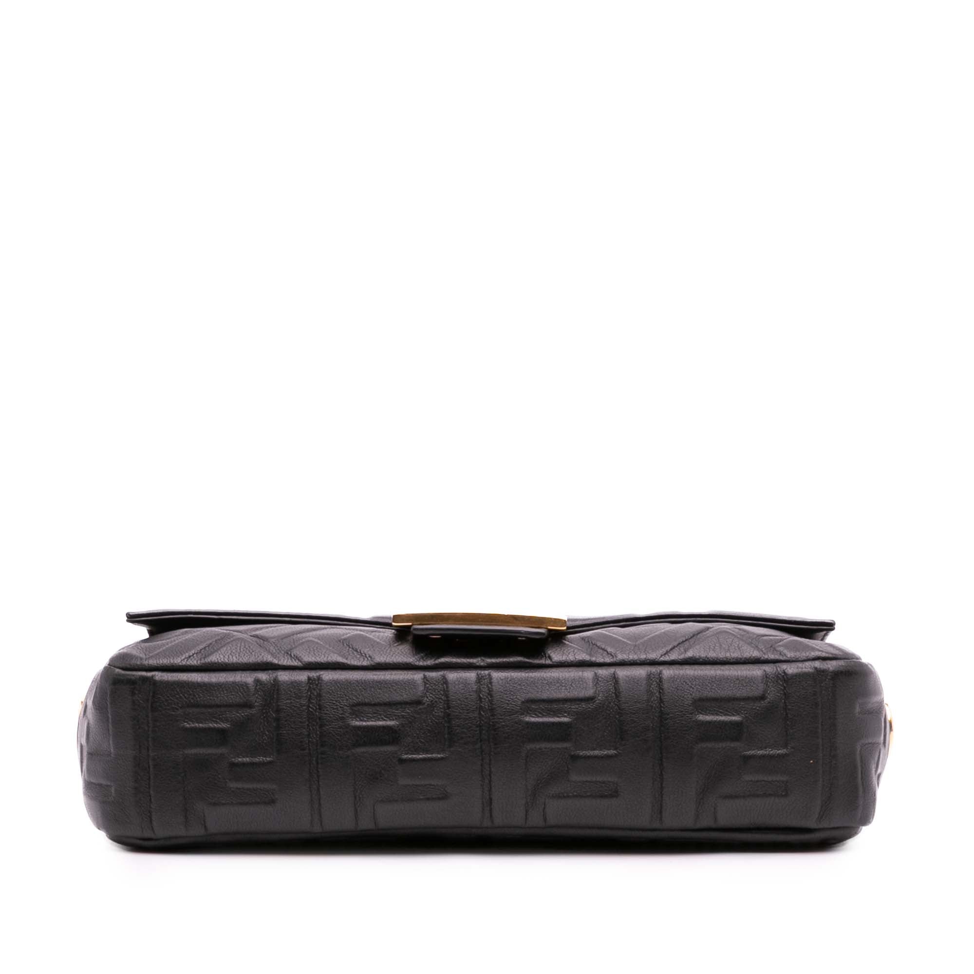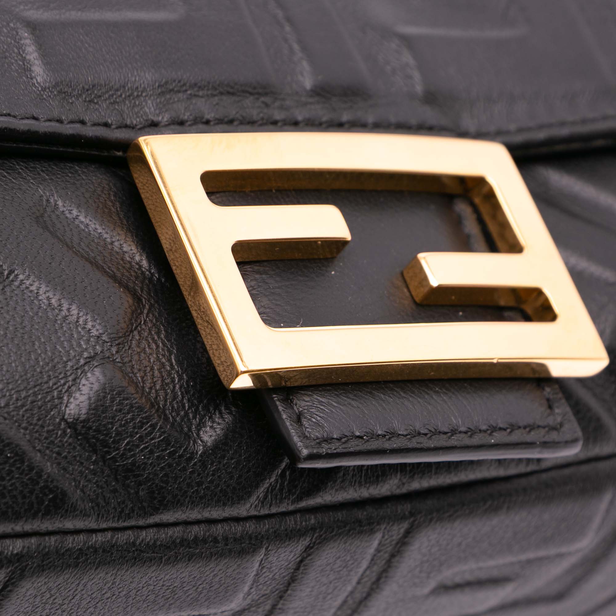 The Baguette features an embossed leather body, a flat leather handle, a detachable flat leather strap, a front flap with magnetic snap closure, and an interior zip pocket. Retail Price: 3750.00