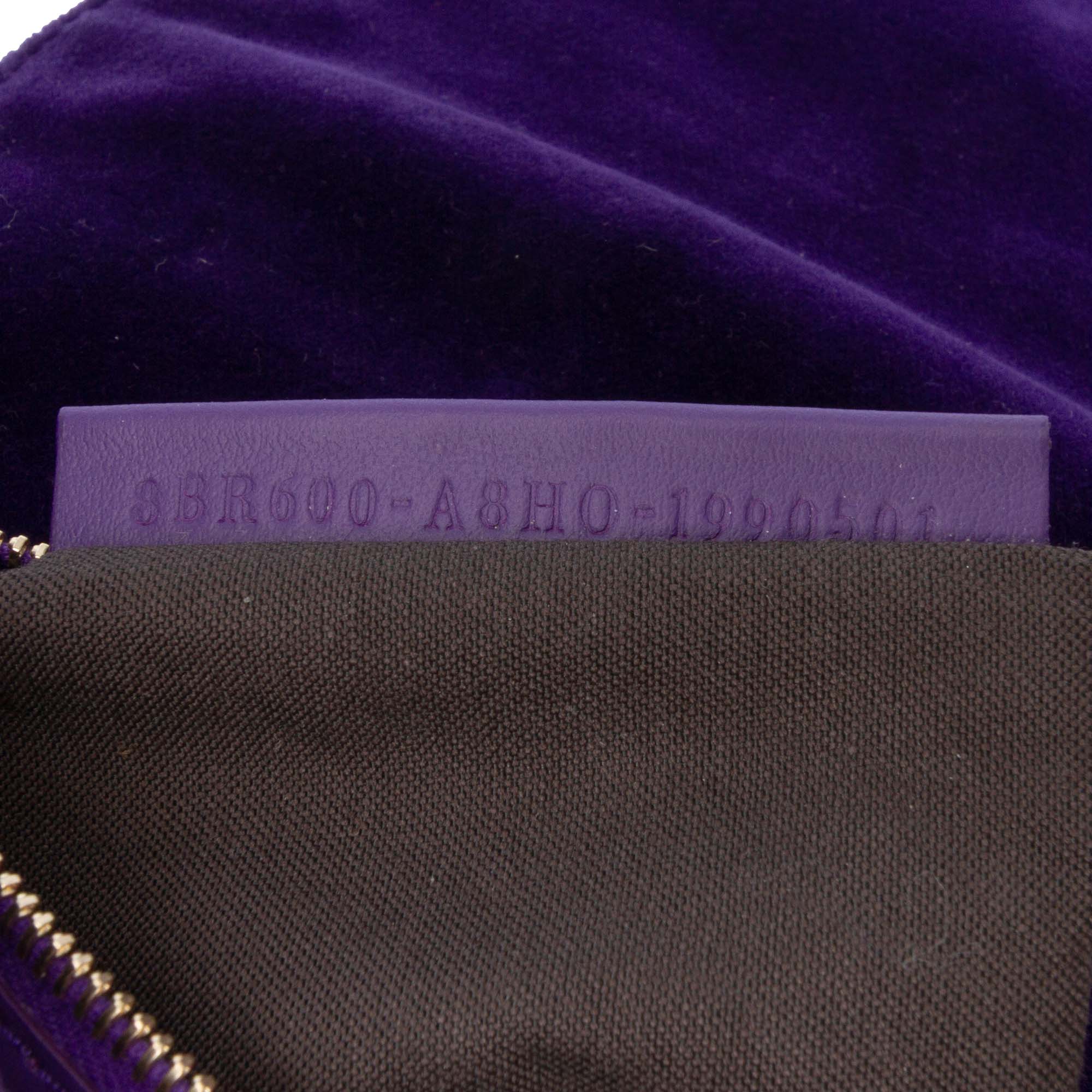 The Baguette satchel features an embossed velvet body, a detachable handle, a detachable velvet and chain shoulder strap, a front flap with magnetic snap closure, and an interior zip pocket. Retail Price: 2850.00