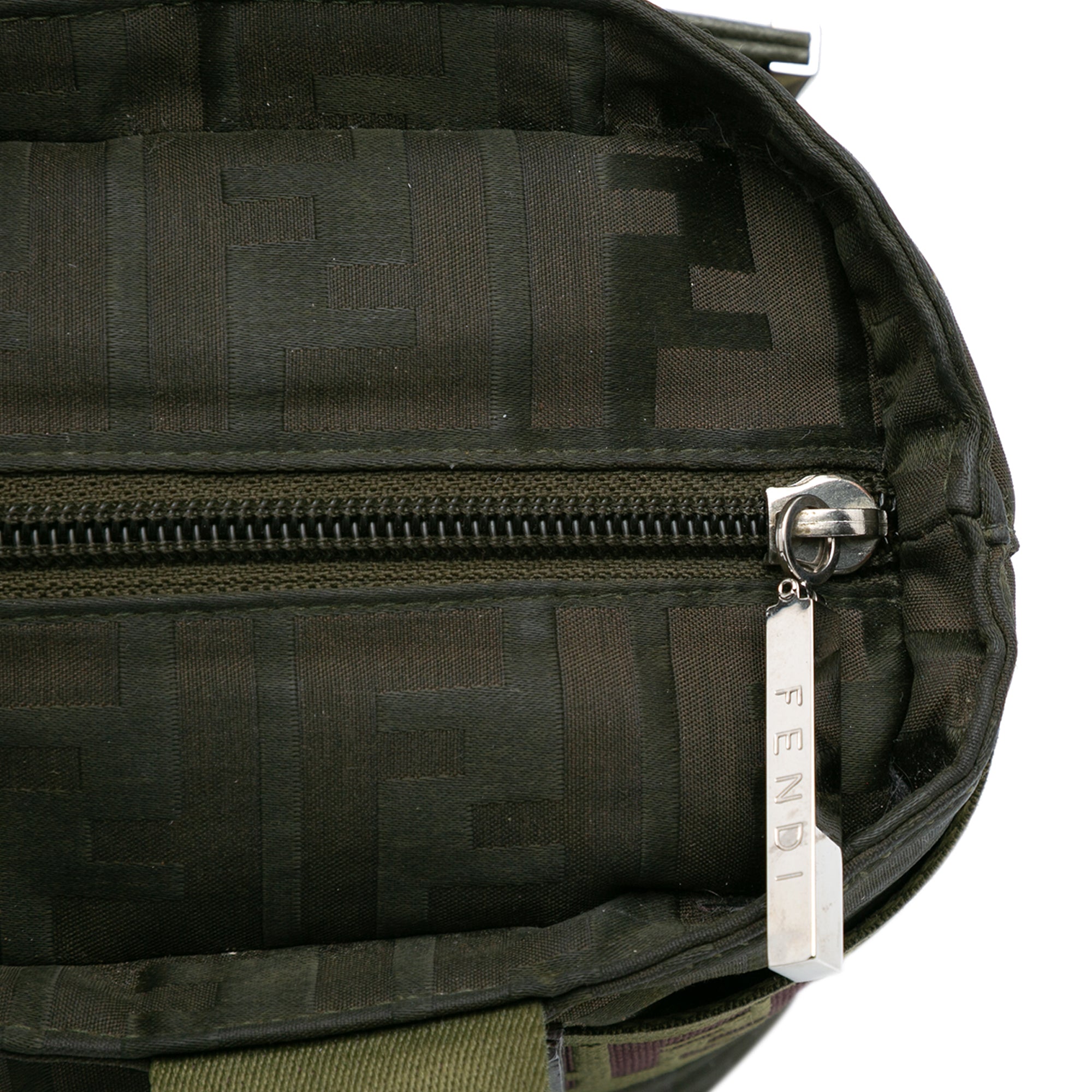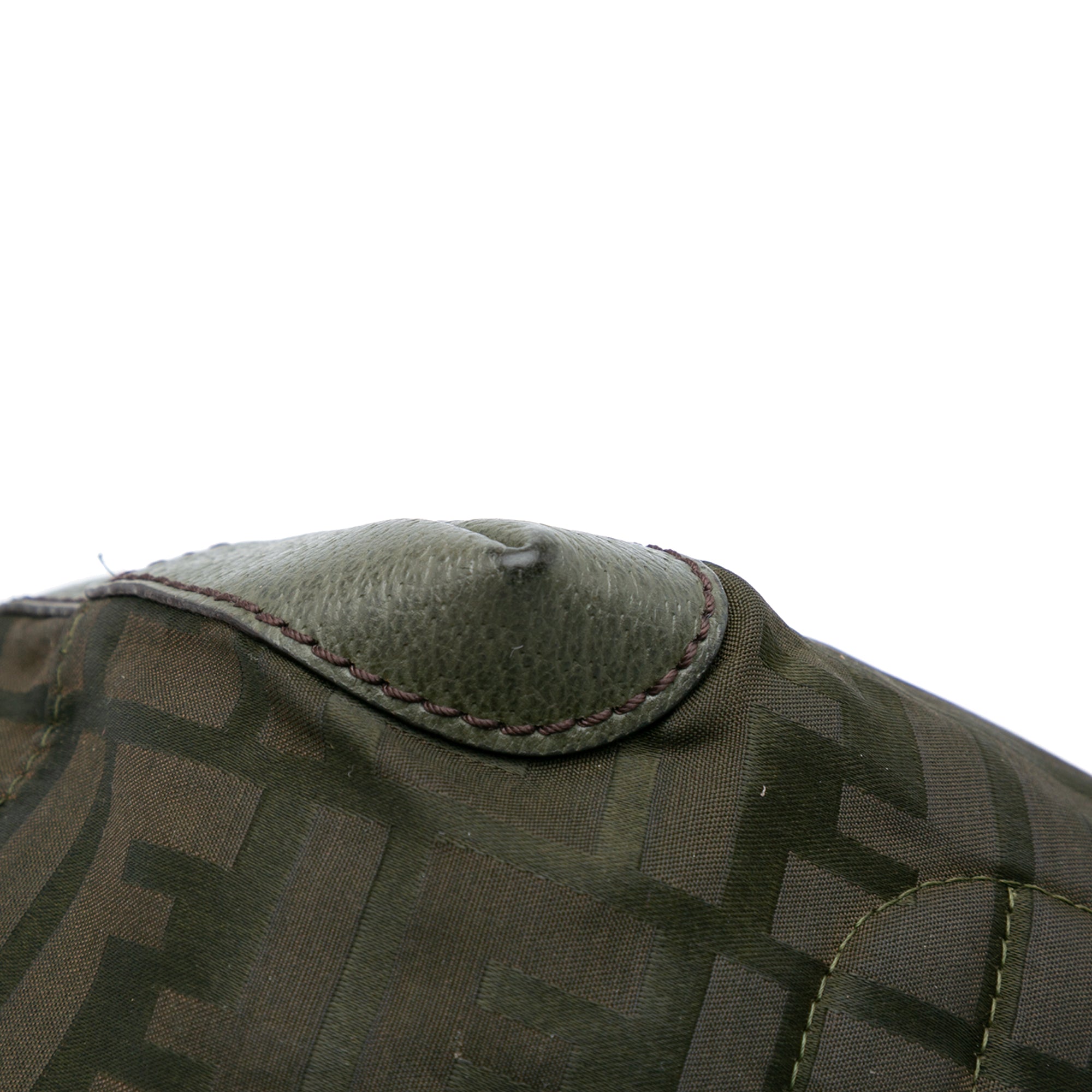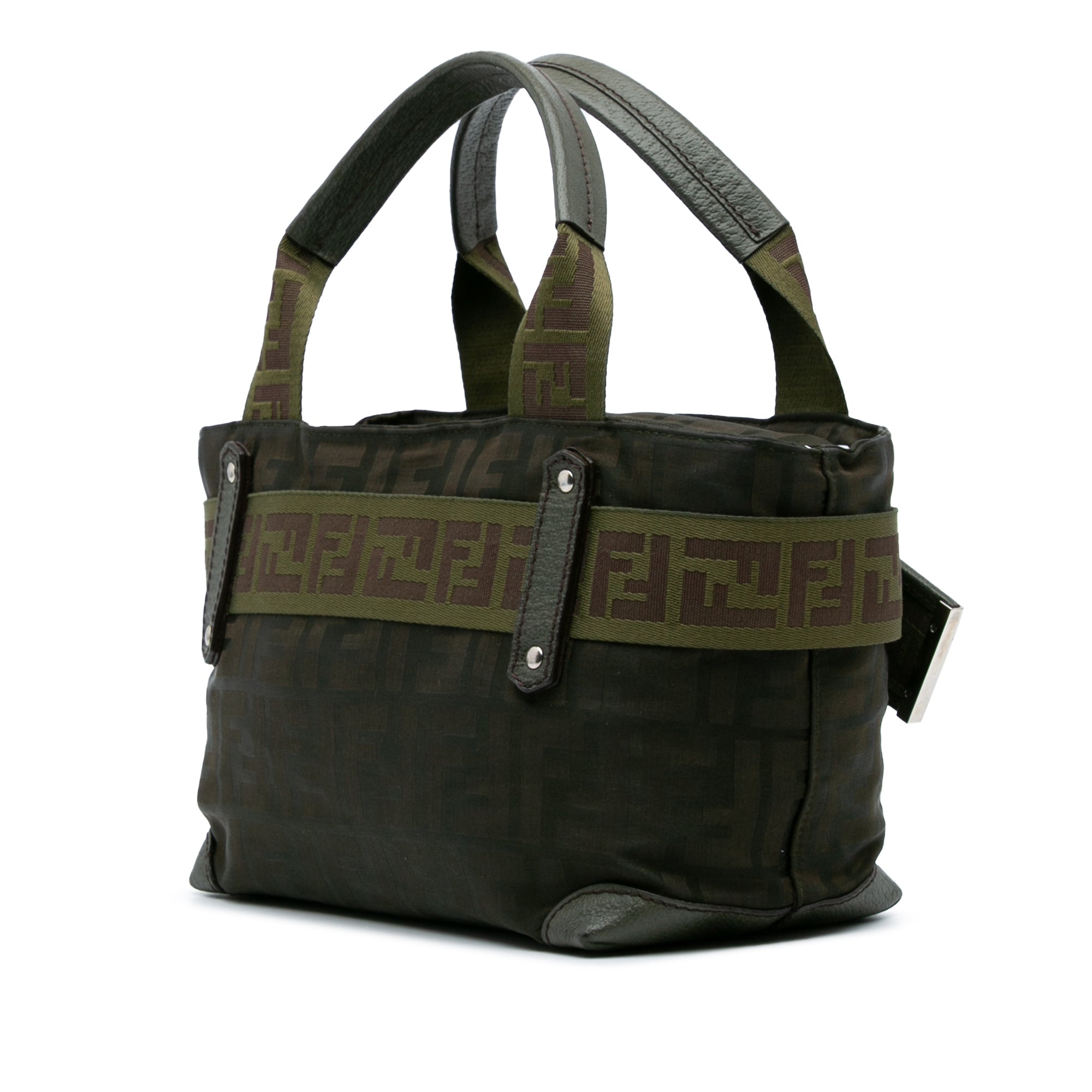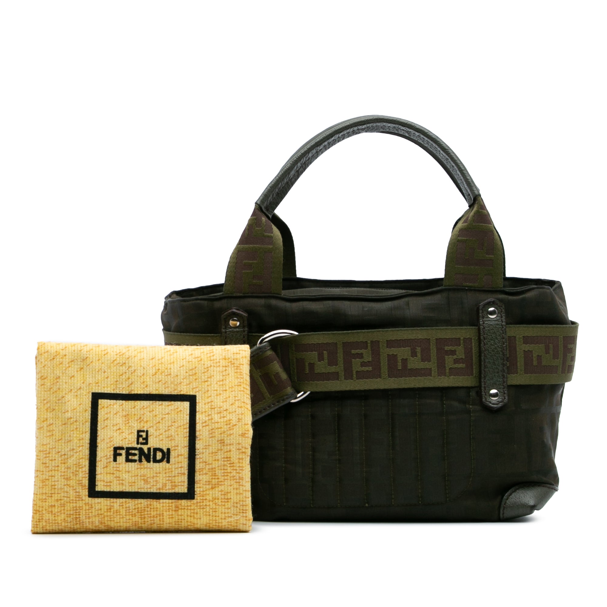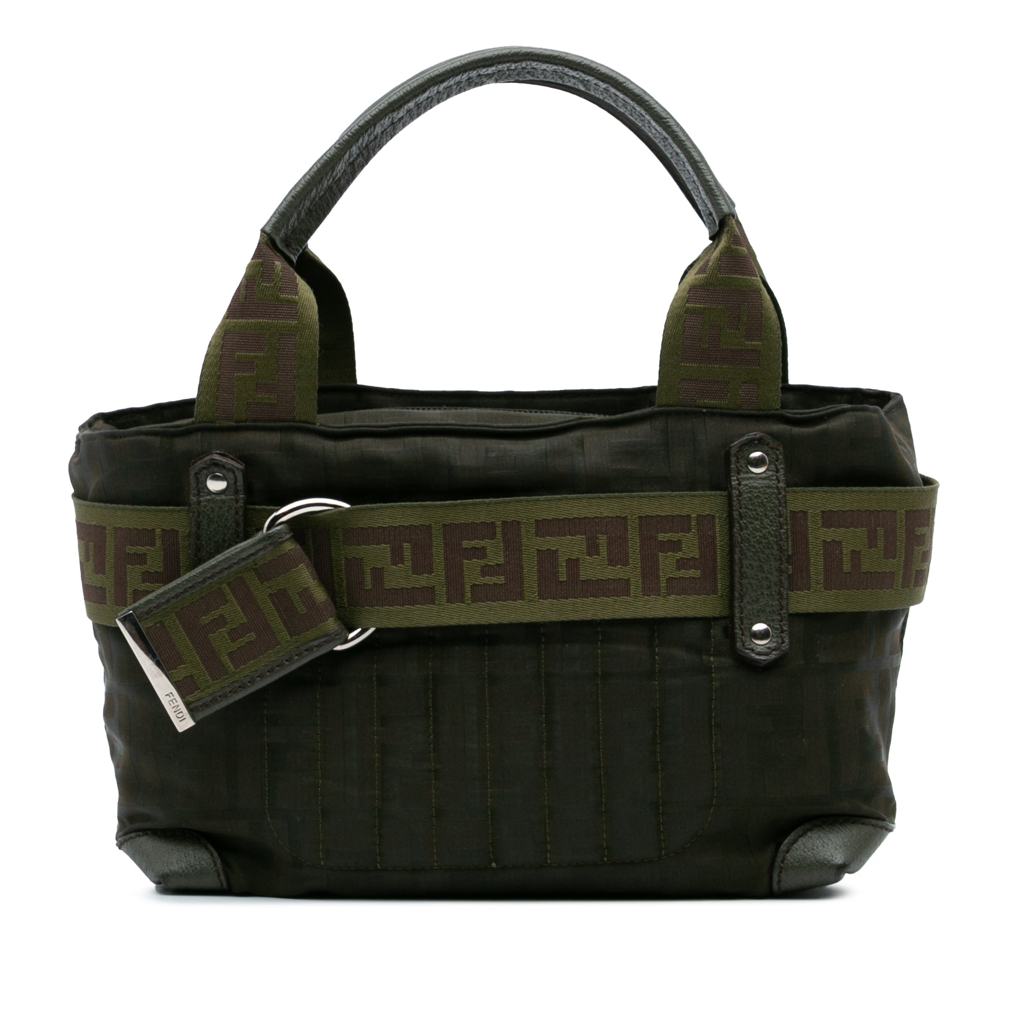 This handbag features a nylon body with leather trim, flat leather handles, and a top zip closure. Inclusion: Dust bag. Retail Price: 990.00