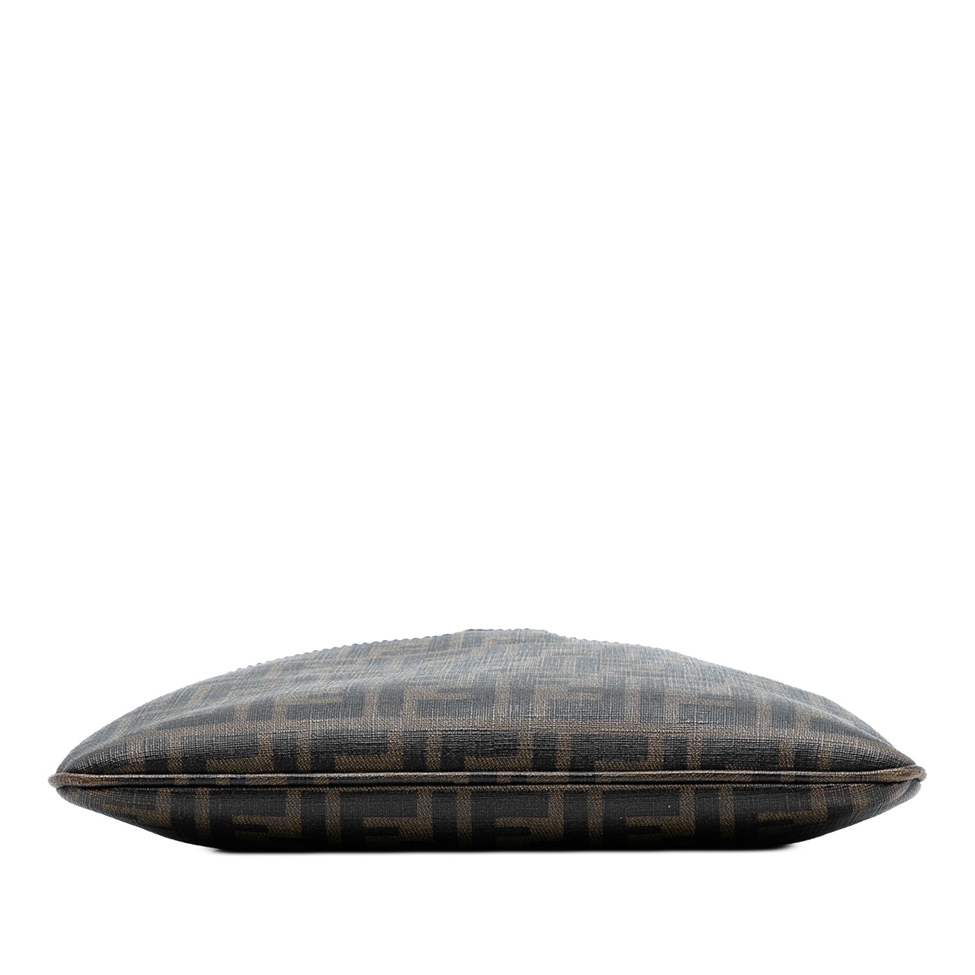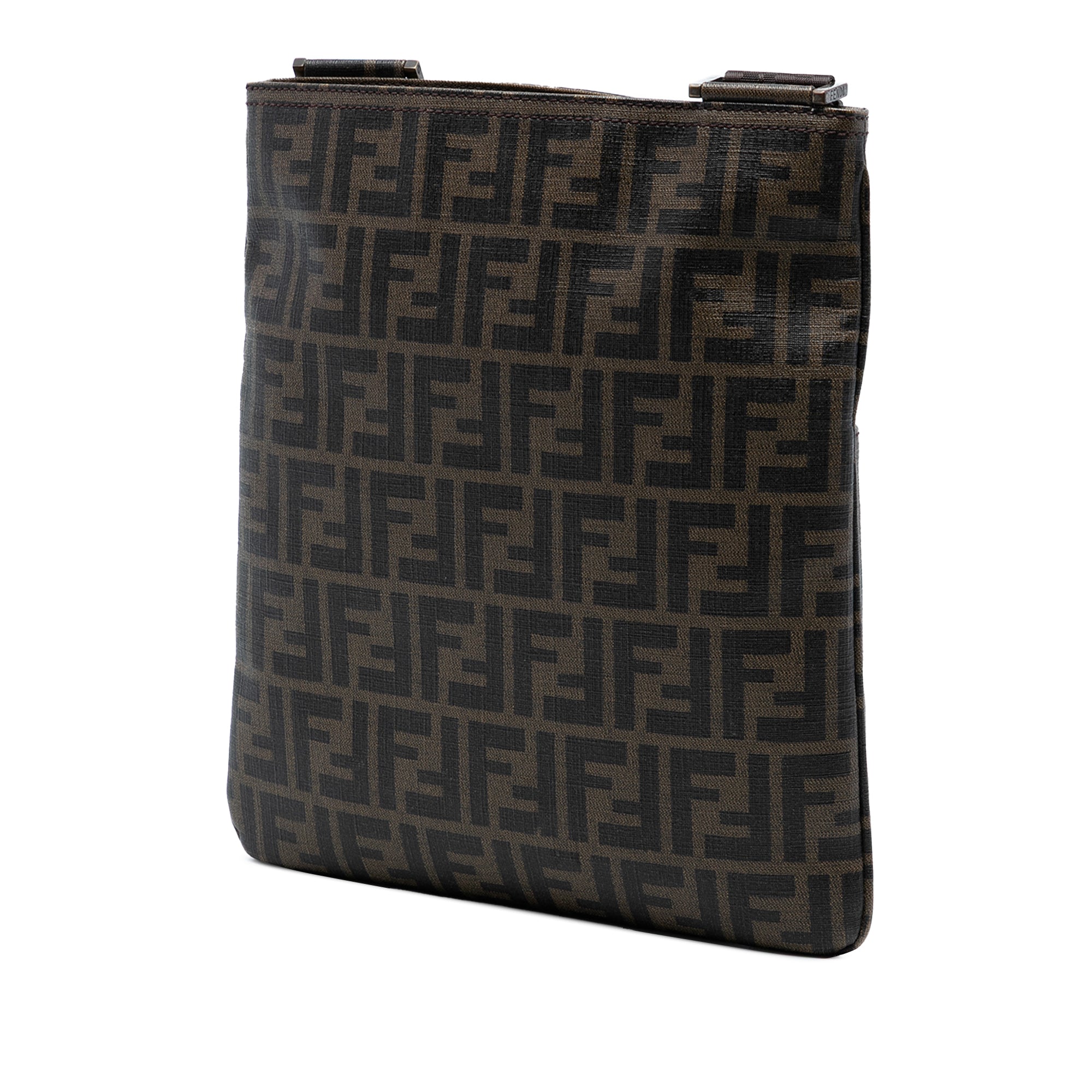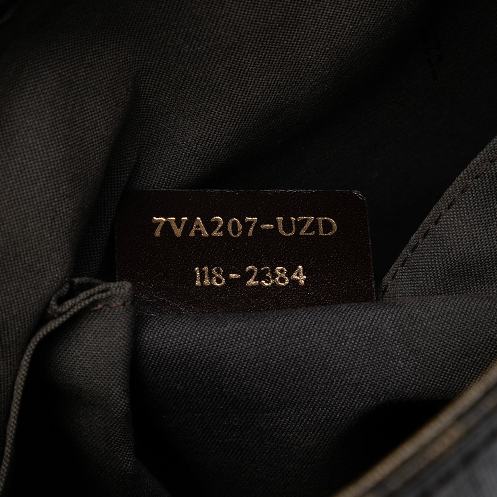 This crossbody bag features a coated canvas body with leather trim, an adjustable flat nylon strap, a top zip closure, an exterior front slip pocket, and interior slip pockets. Retail Price: 725.00