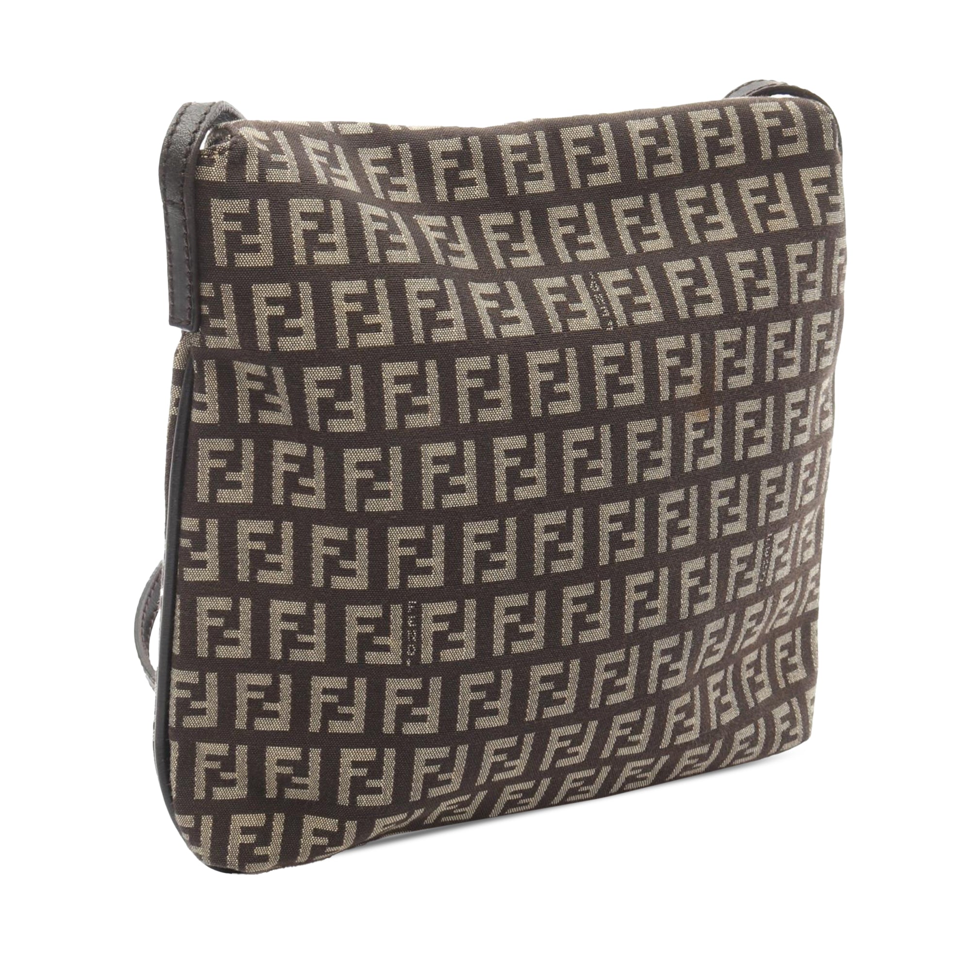 This crossbody bag features a canvas body with leather trim, an adjustable flat leather strap, a flap with flat leather strap and magnetic snap closure, and an interior slip pocket. Retail Price: 1425.00
