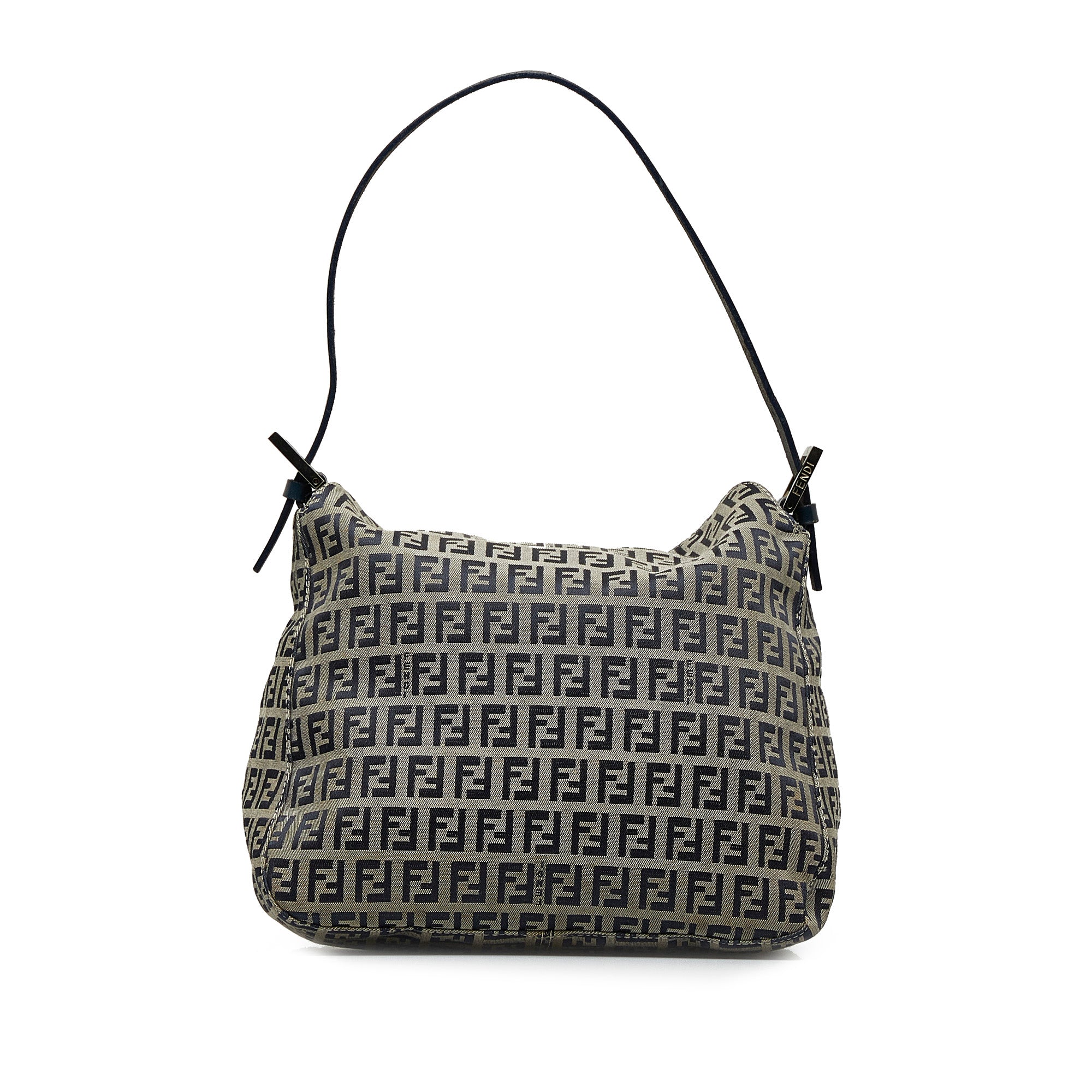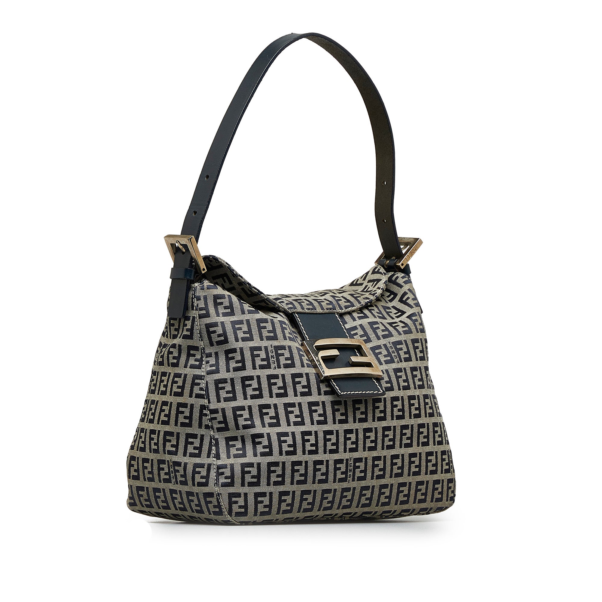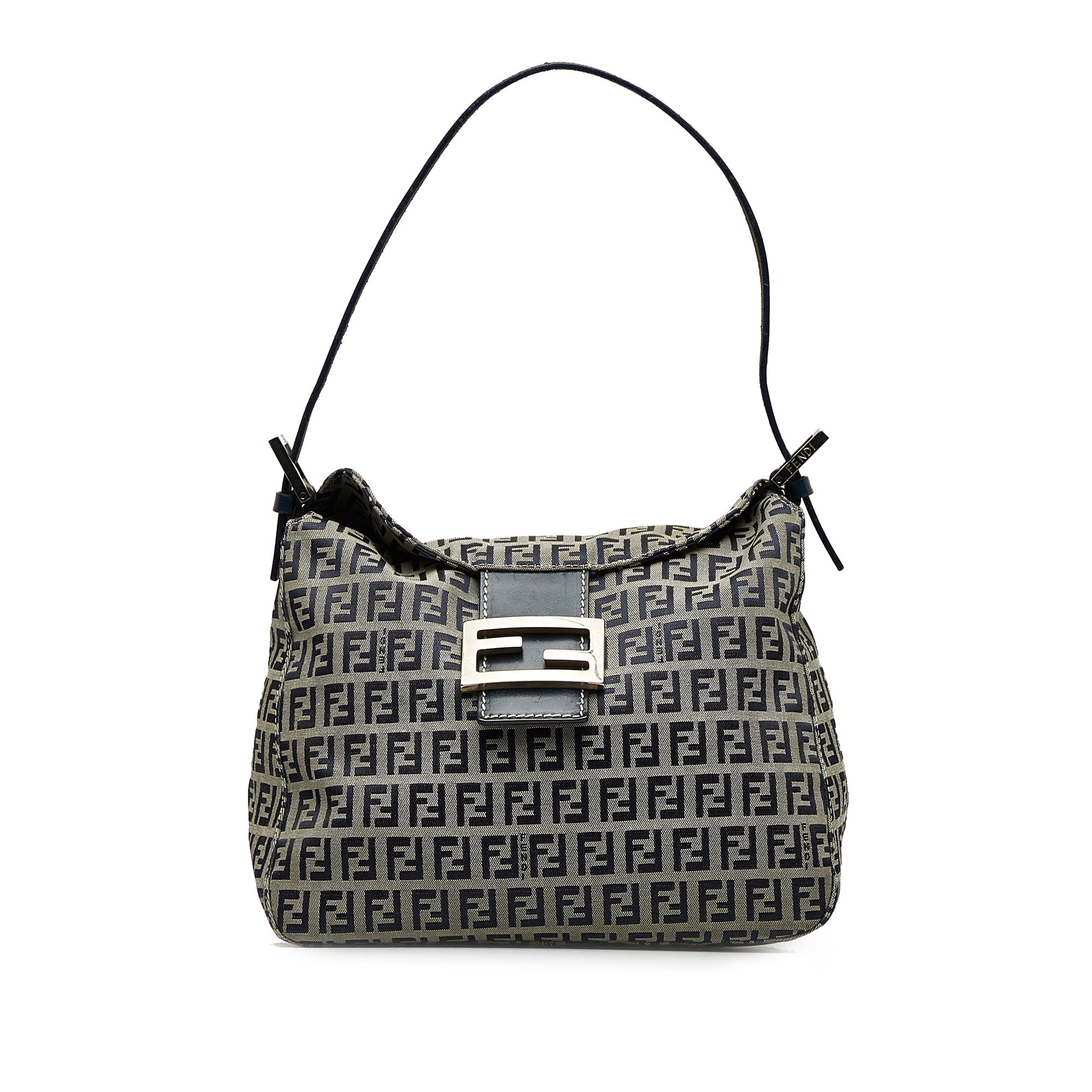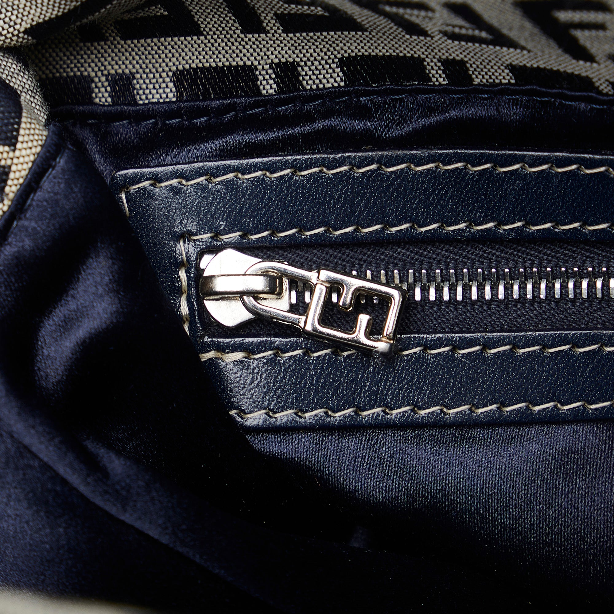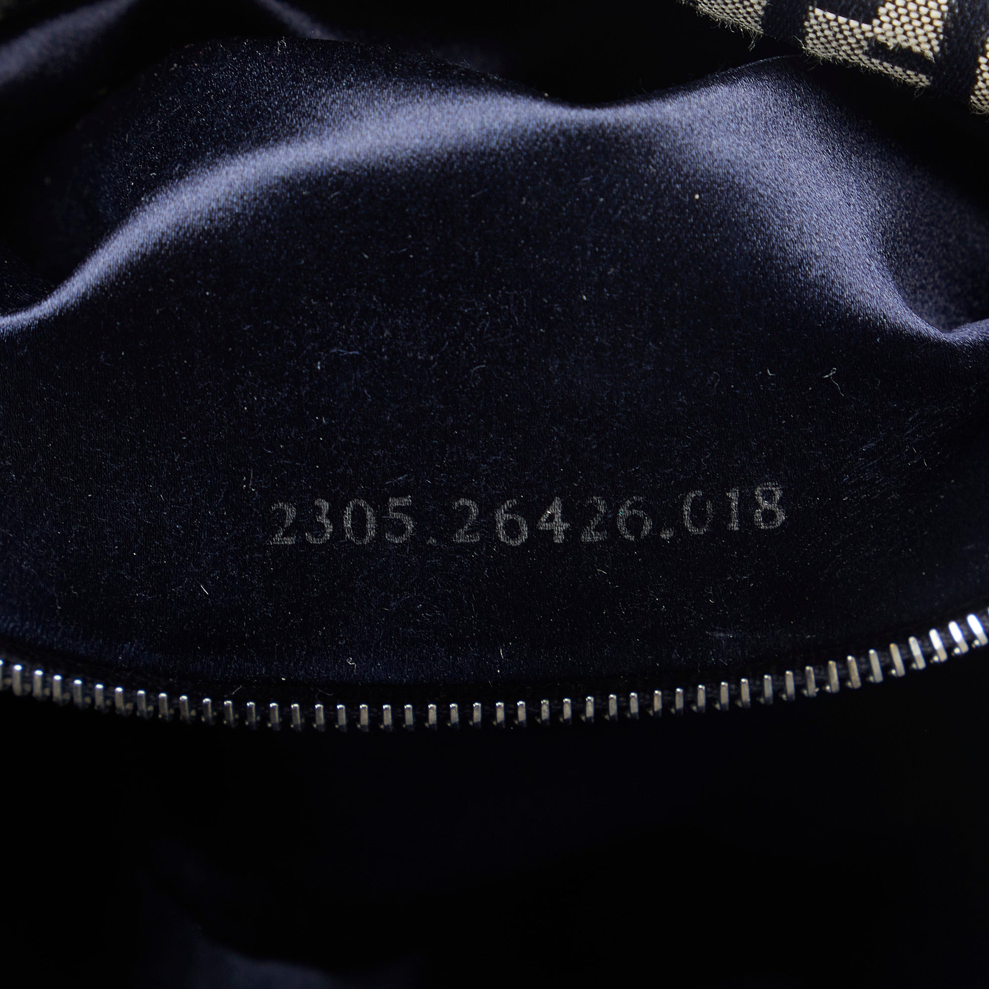 This shoulder bag features a canvas body, a flat leather strap, double front flap with a flat strap and a magnetic snap closure, and an interior zip pocket. Retail Price: 1200.00