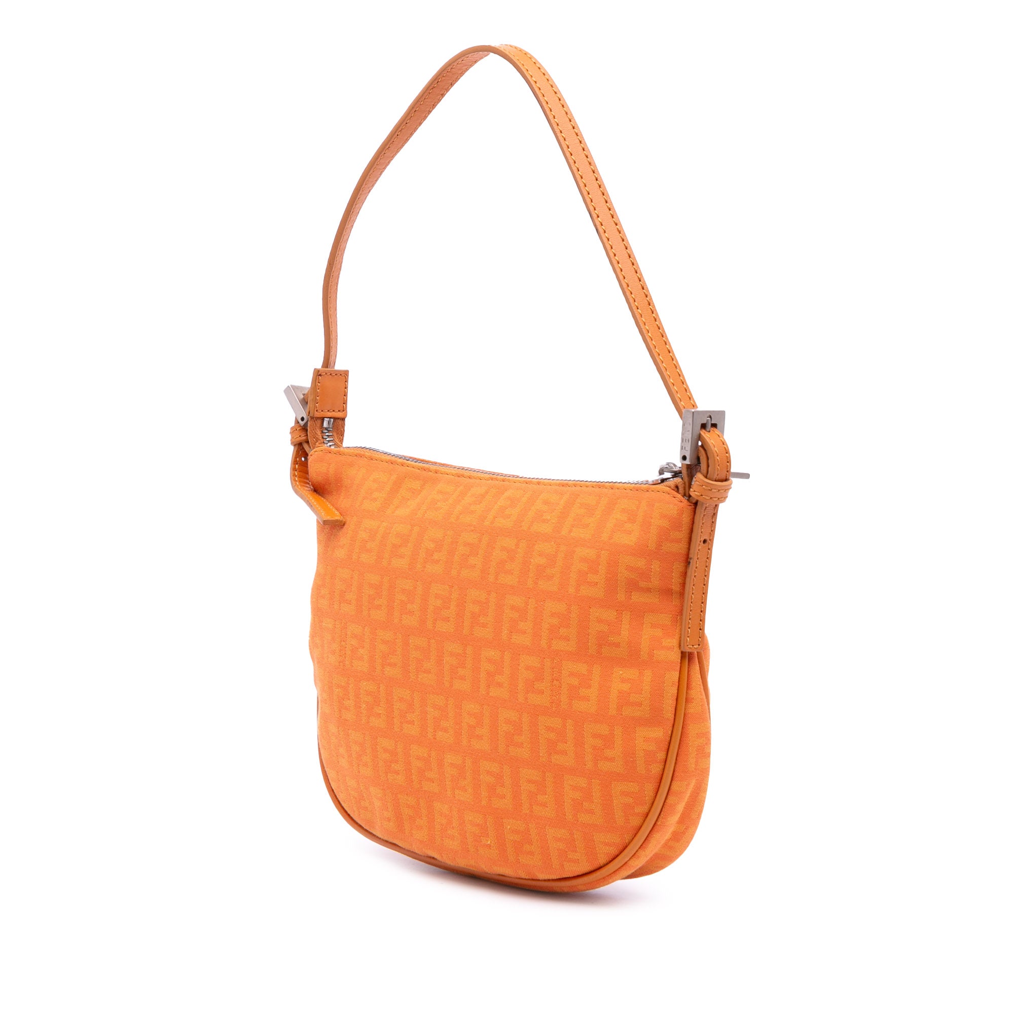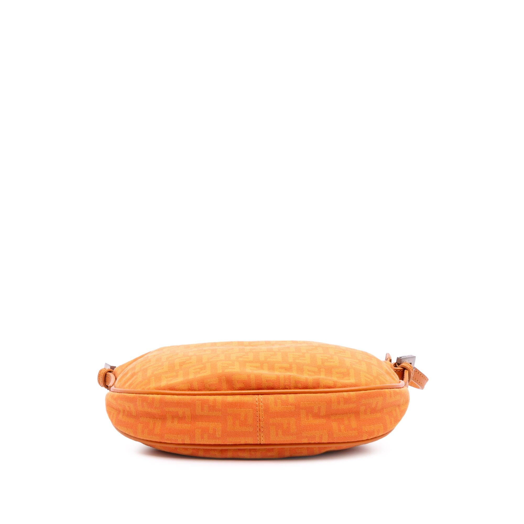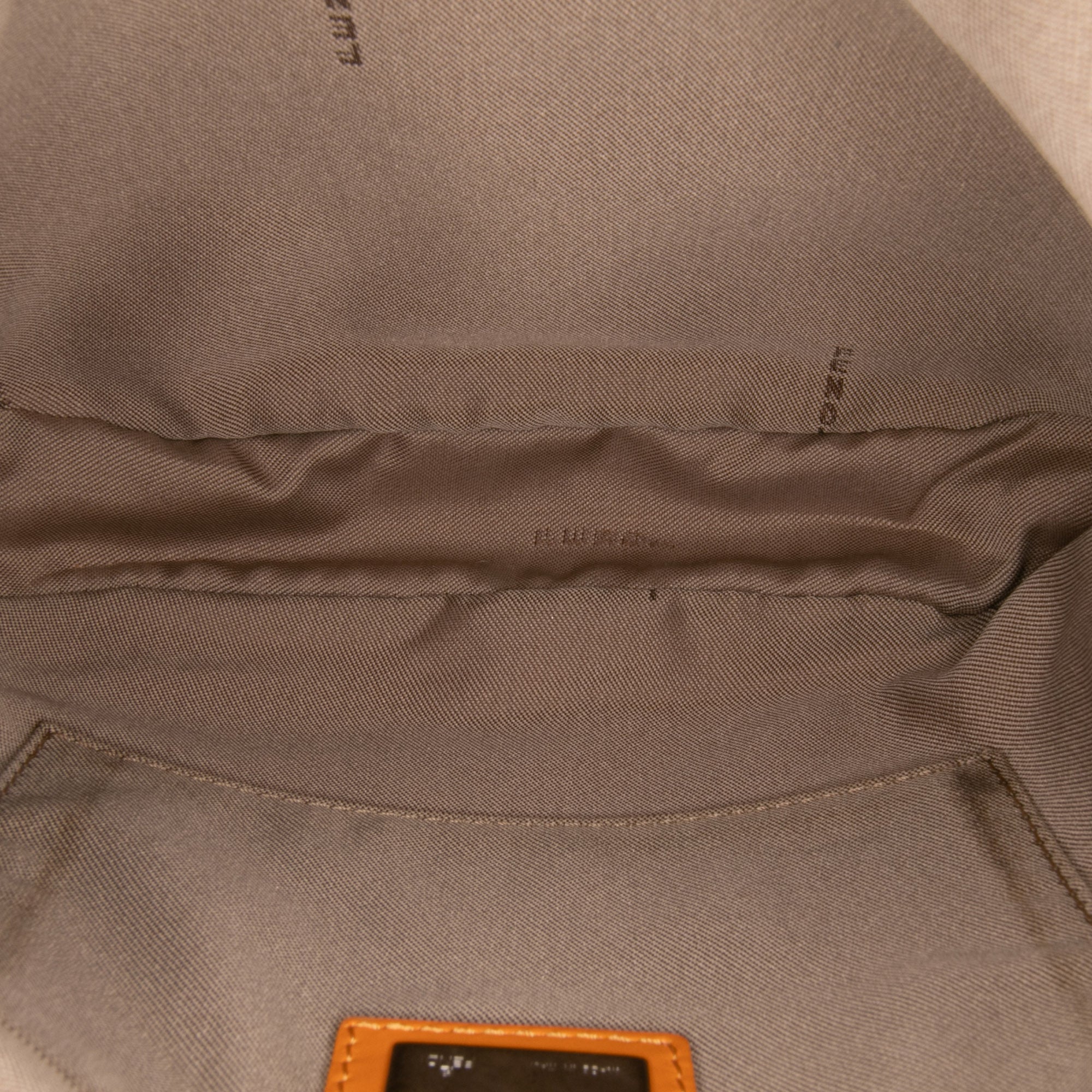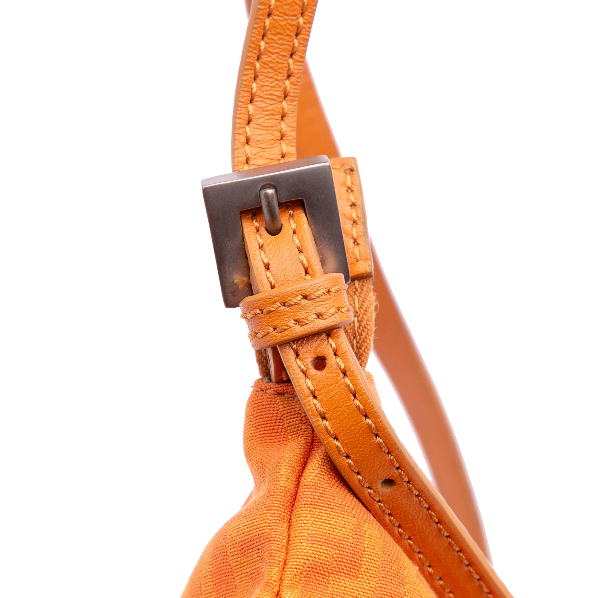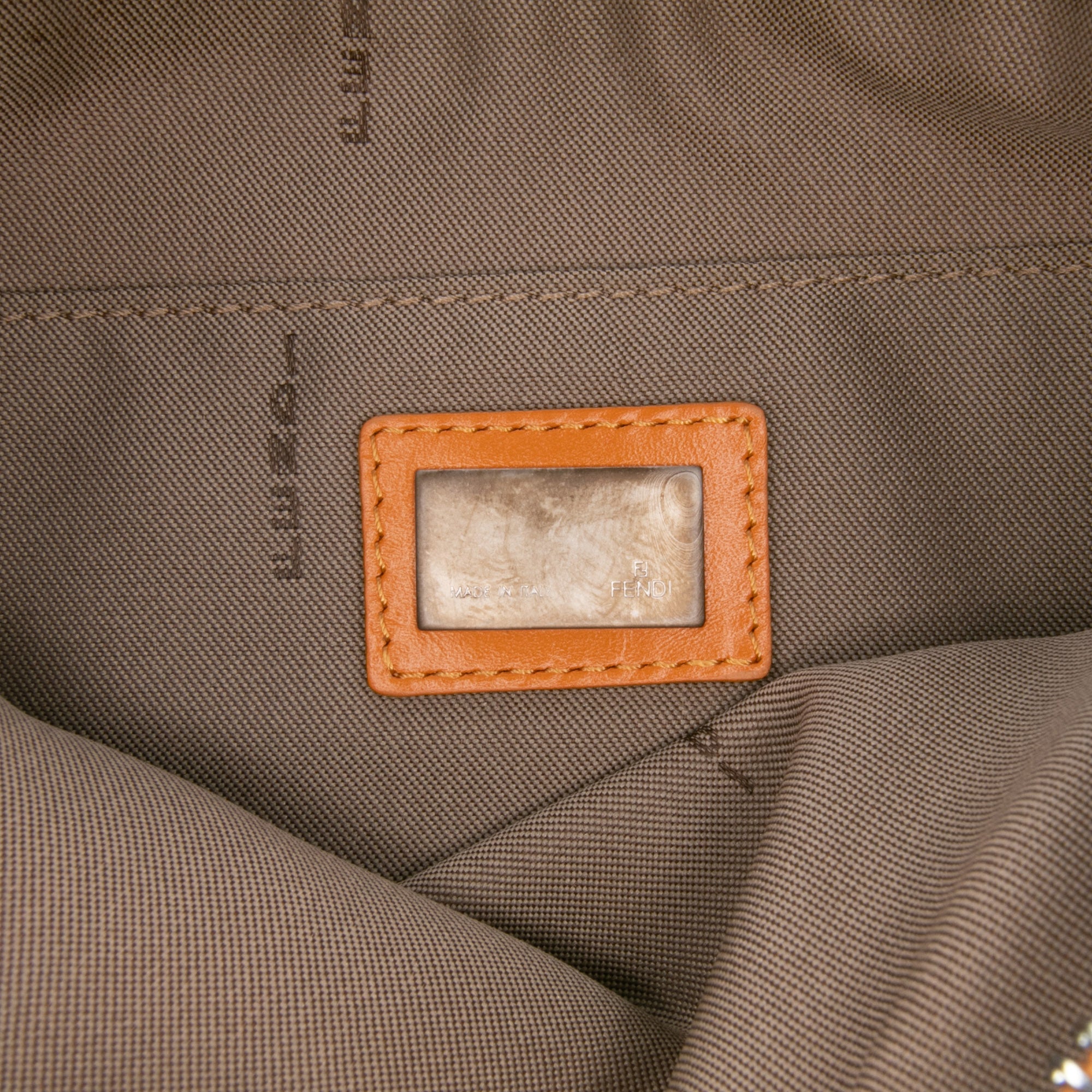 This shoulder bag features a canvas body with leather trim, a flat leather strap, a top zip closure, and an interior slip pocket. Retail Price: 800.00