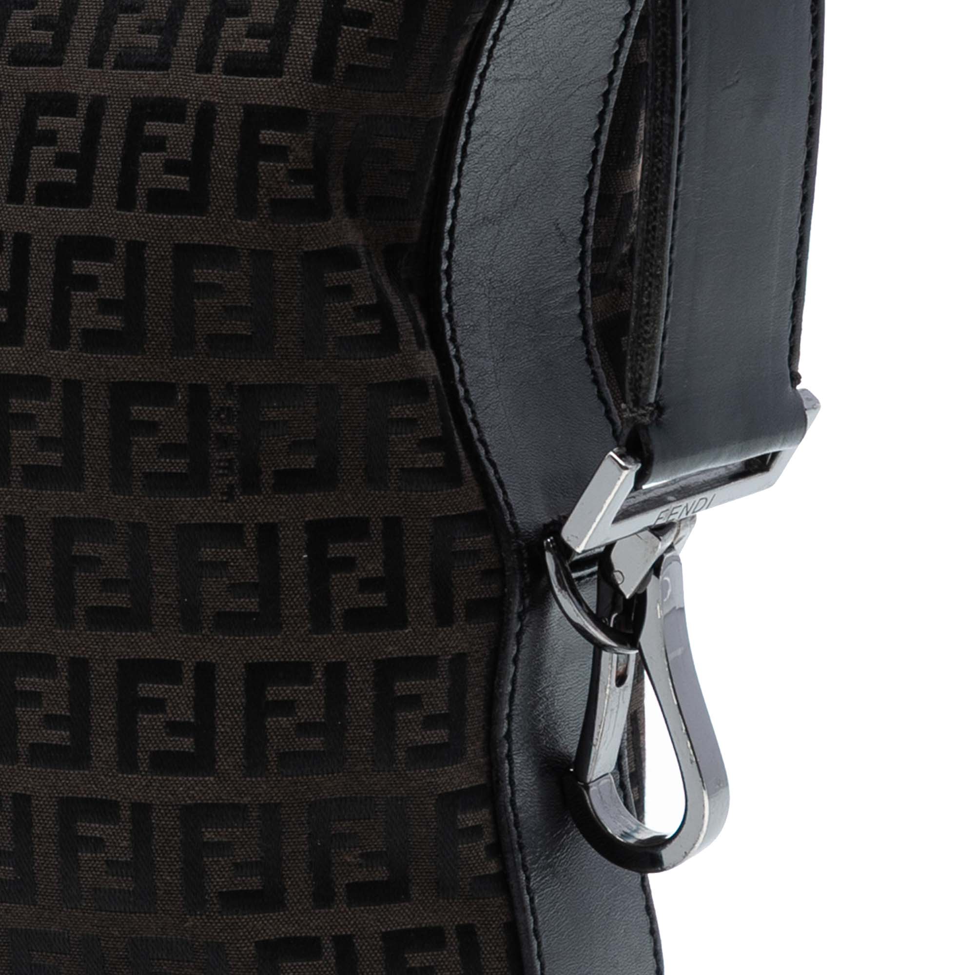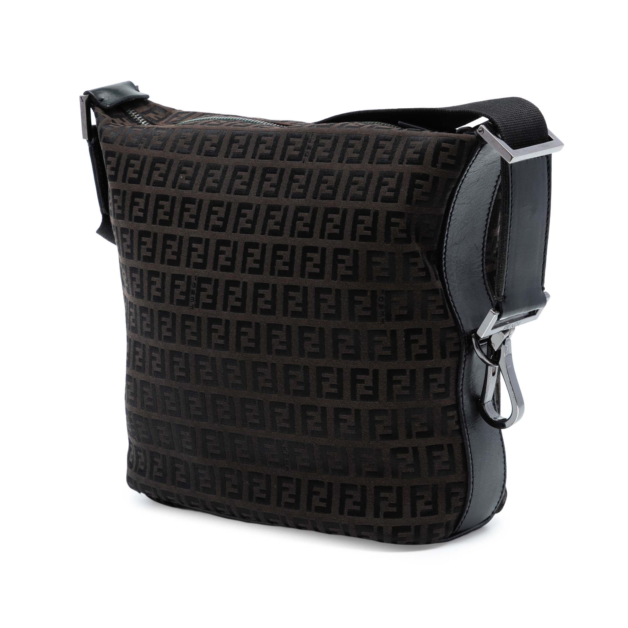 This shoulder bag features a canvas body with leather trim, an adjustable flat canvas strap, and a top zip closure. Retail Price: 995.00