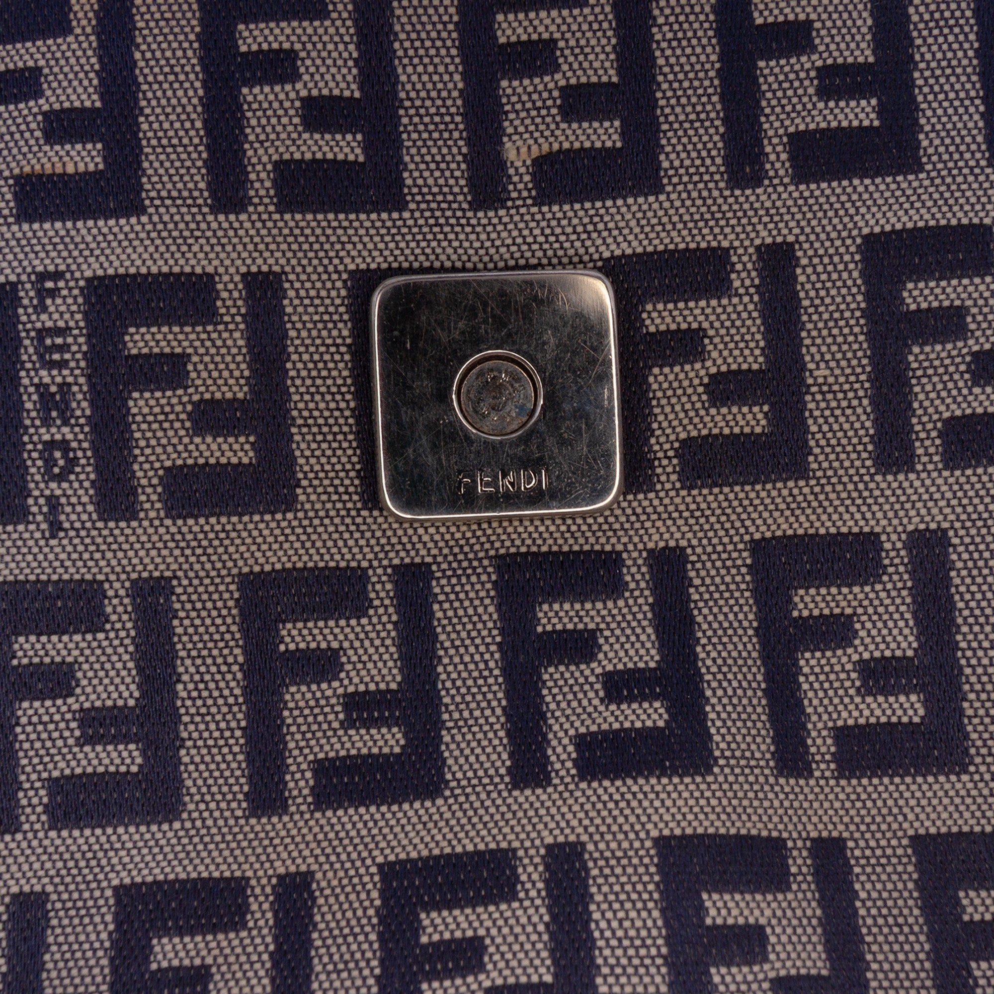 This shoulder bag features a canvas body, an adjustable leather shoulder strap, and an open top with a leather strap and magnetic snap closure. Retail Price: 820.00