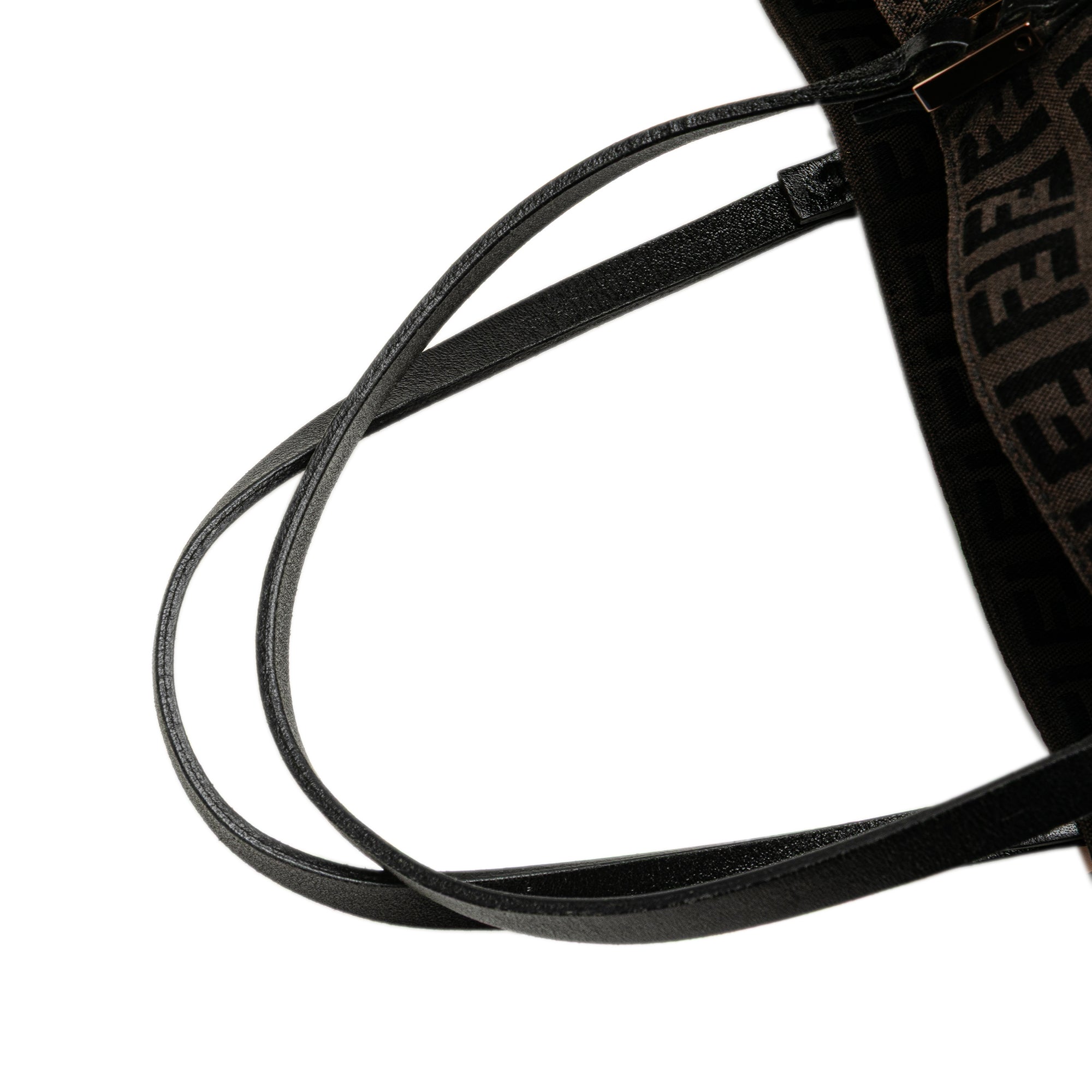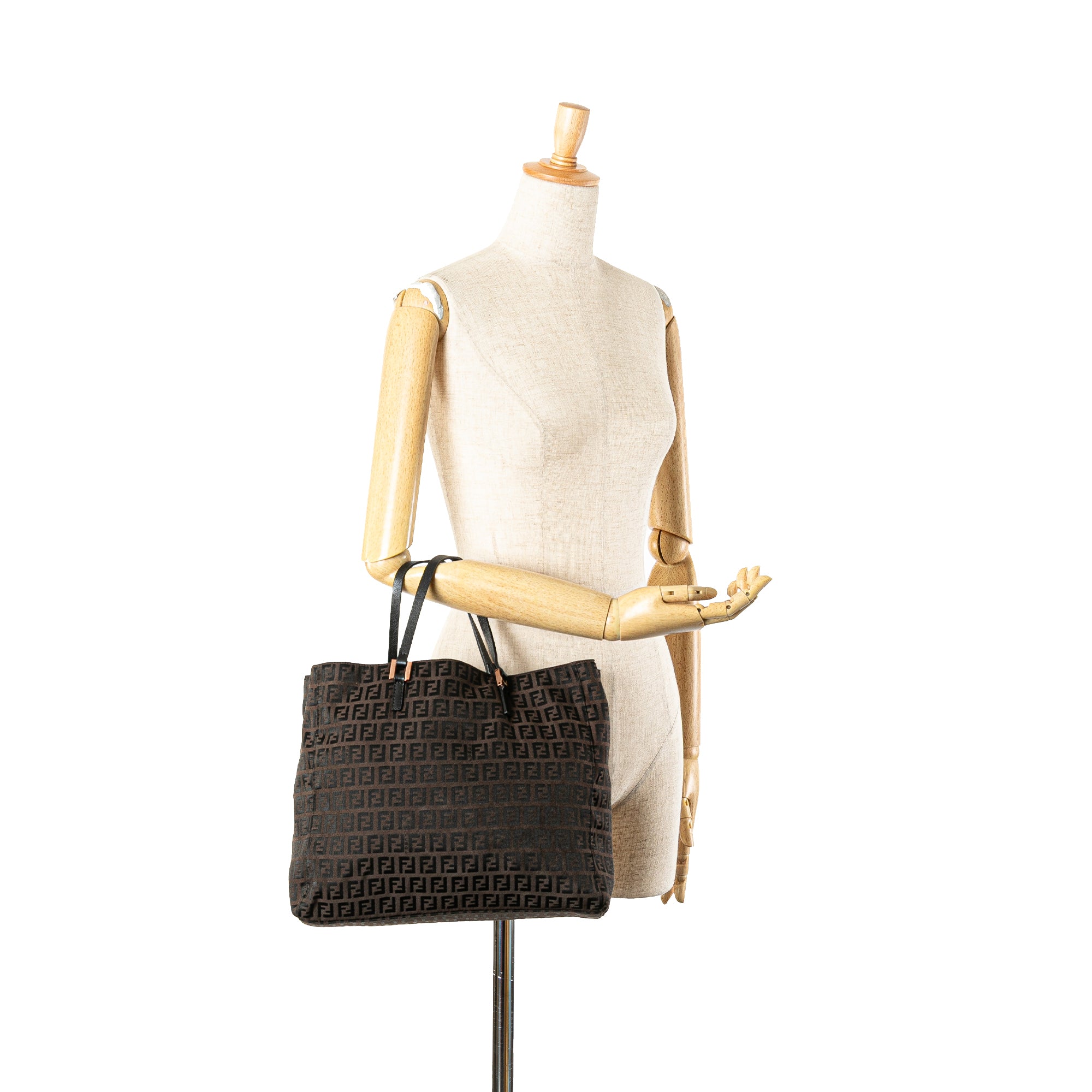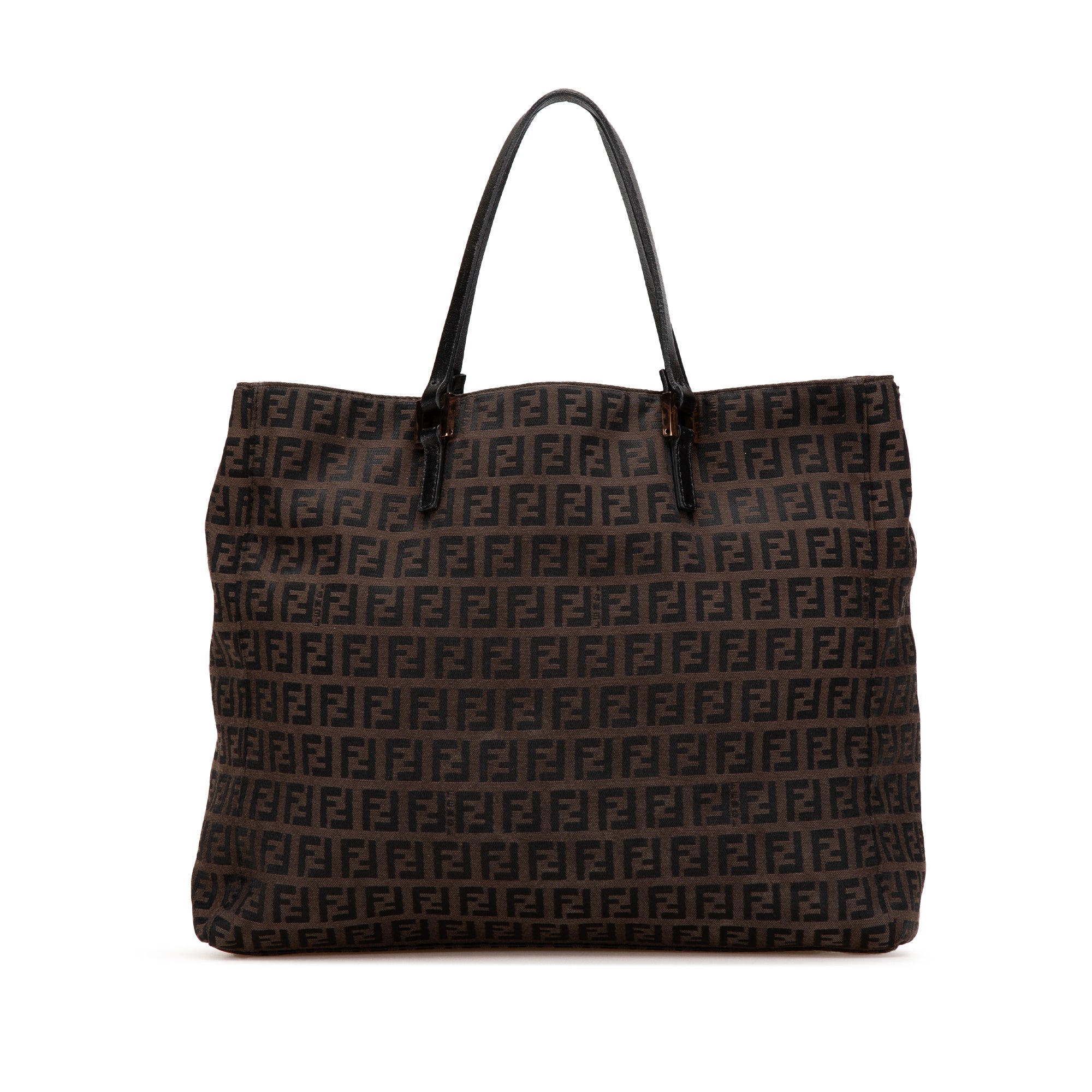 This tote bag features a canvas body, flat leather handles, an open top, and interior zip and slip compartments. Retail Price: 990.00
