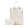 This tote bag features a canvas body with leather trim, flat leather handles, an open top, and a pouch inclusion. Retail Price: 1040.00