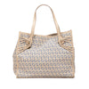This tote bag features a canvas body with leather trim, flat leather straps, an open top with magnetic snap closure, and an interior slip pocket. Inclusion: Dust bag. Retail Price: 785.00