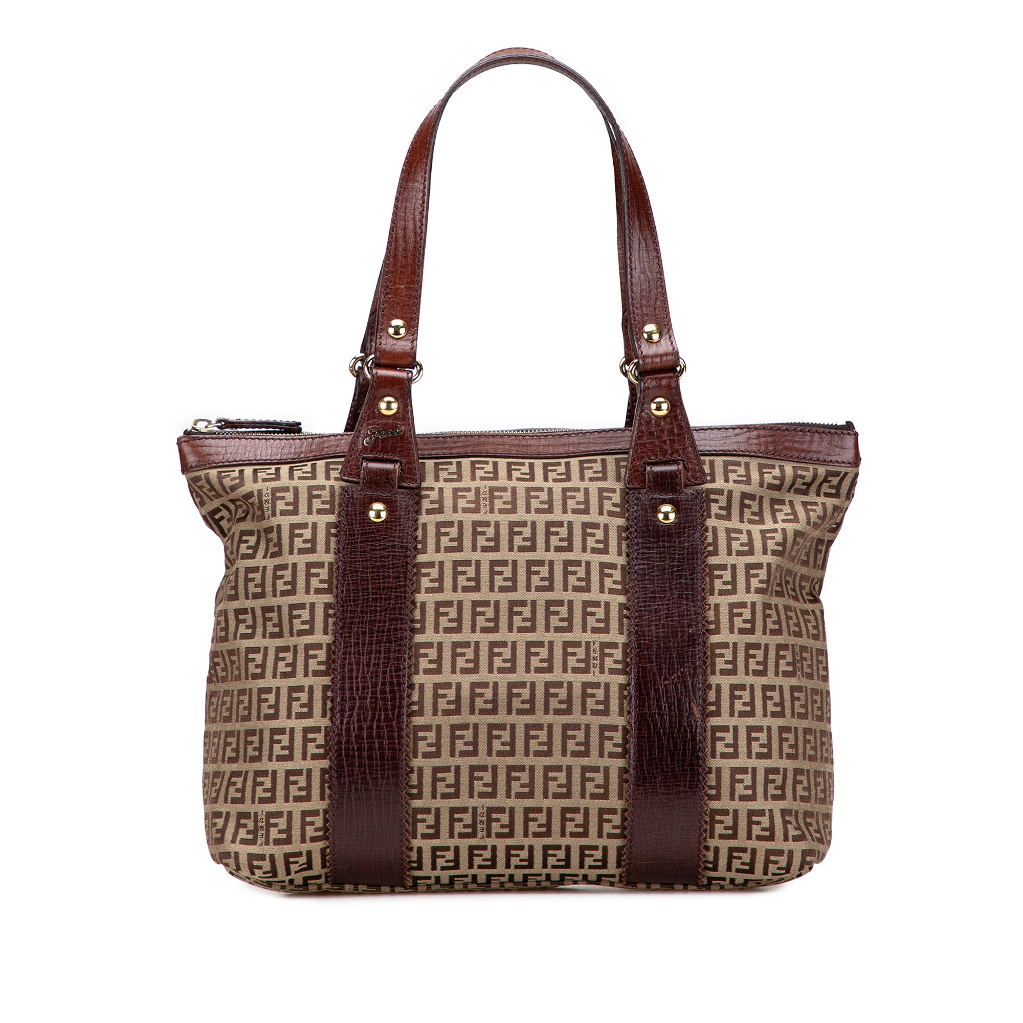 This tote bag features a canvas body with leather trim, flat leather straps, a top zip closure, and interior zip and slip pockets. Retail Price: 1000.00