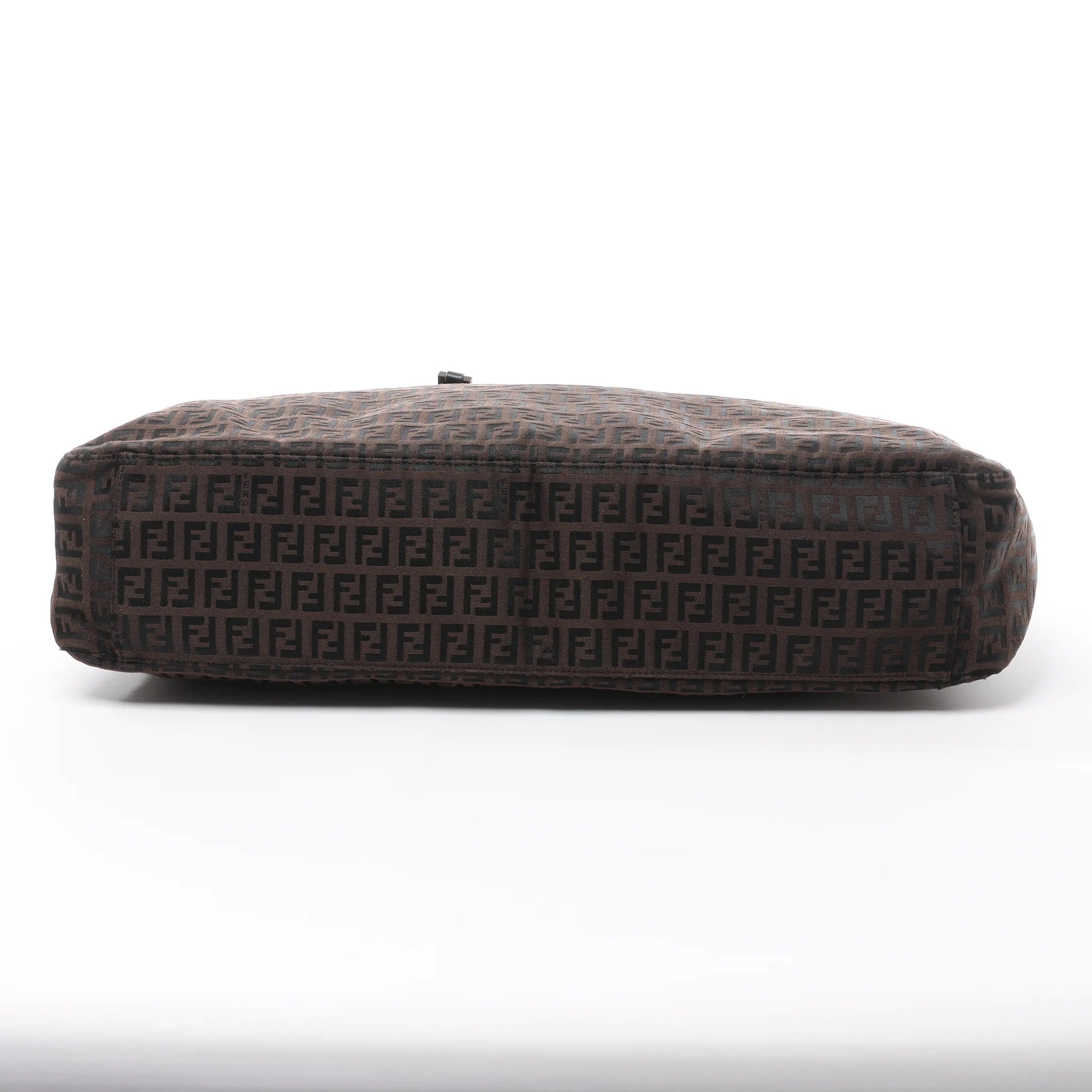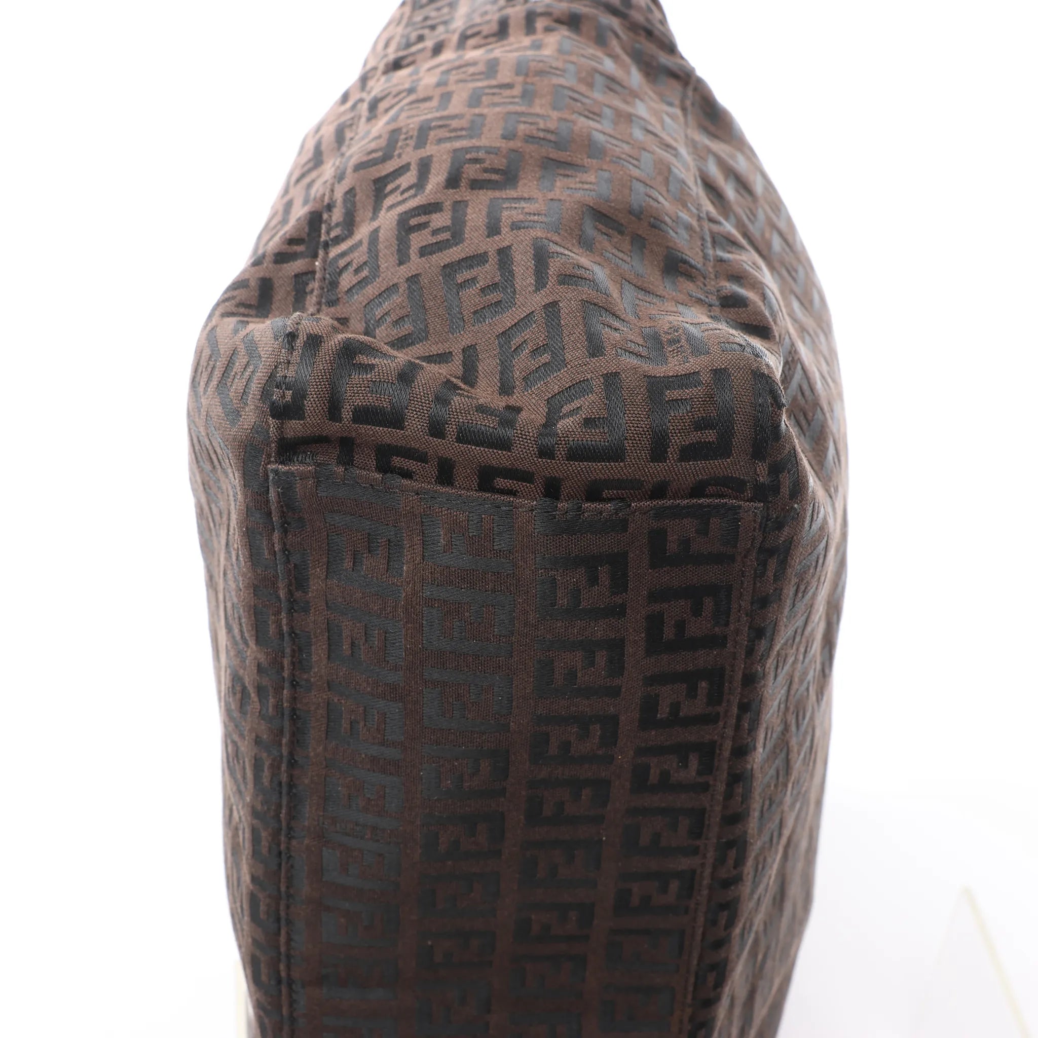 FENDI Zucchino 7VS018 canvas & leather handbag in brown—lightweight, logo-pattern tote with long leather shoulder straps and top zip closure for effortless everyday carry.