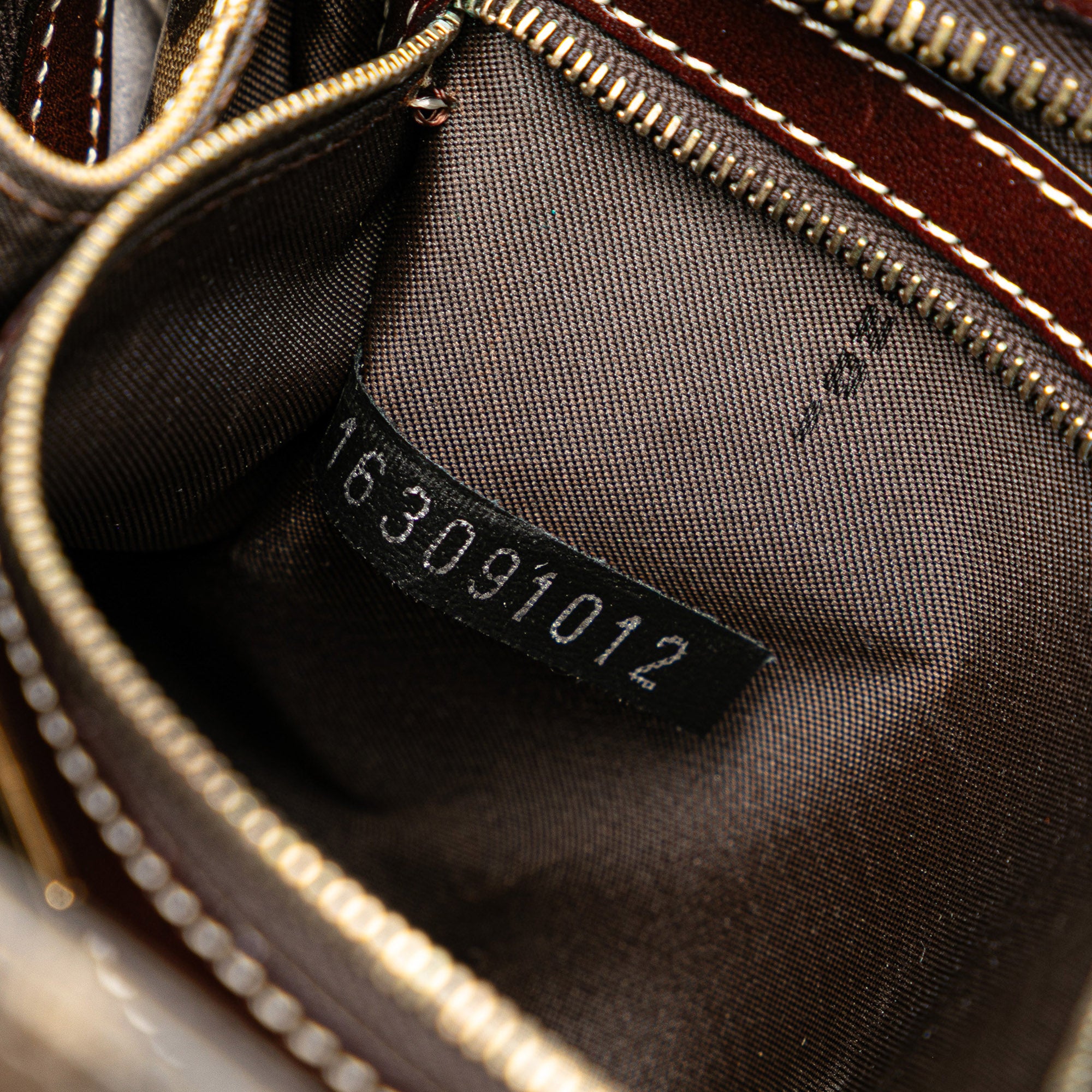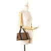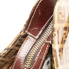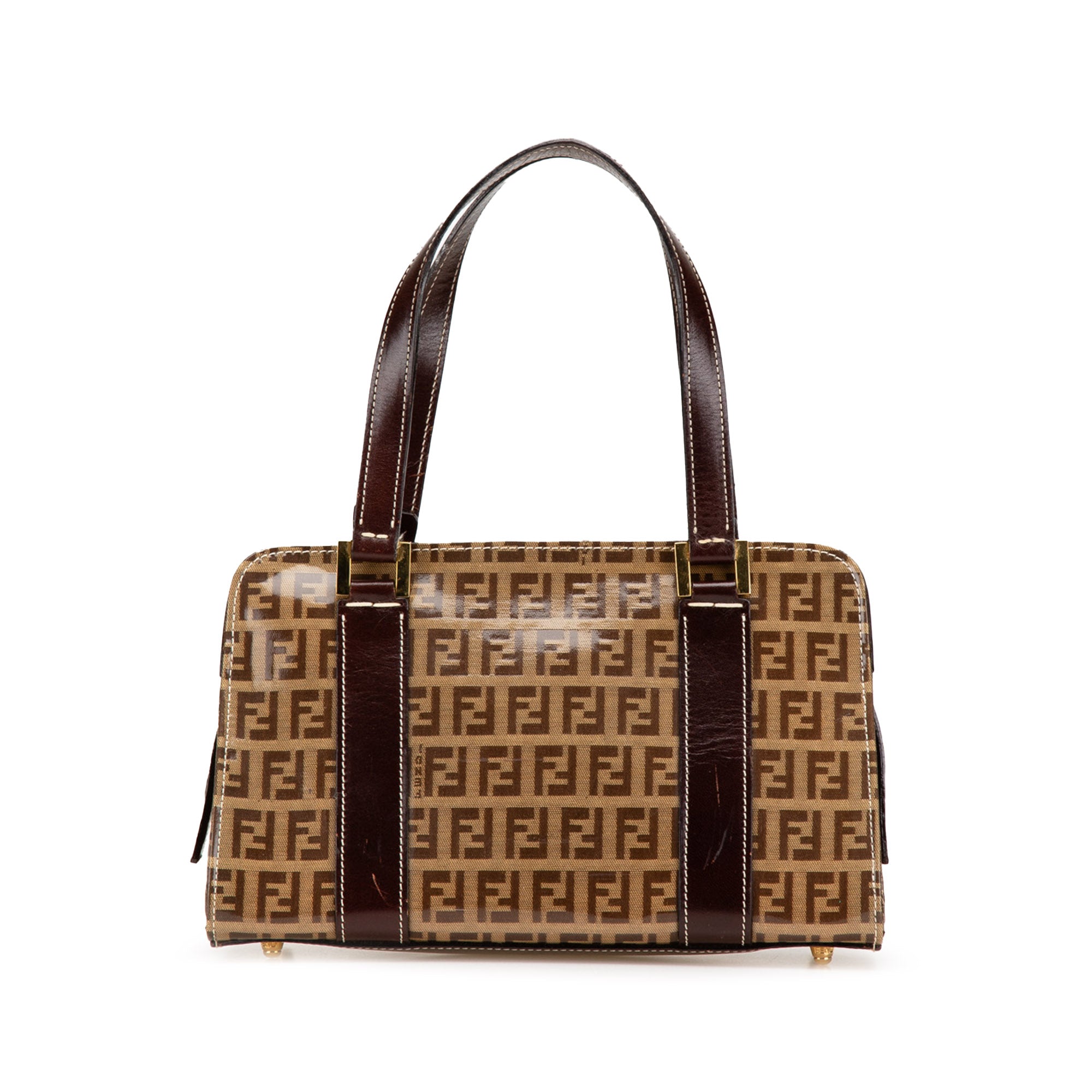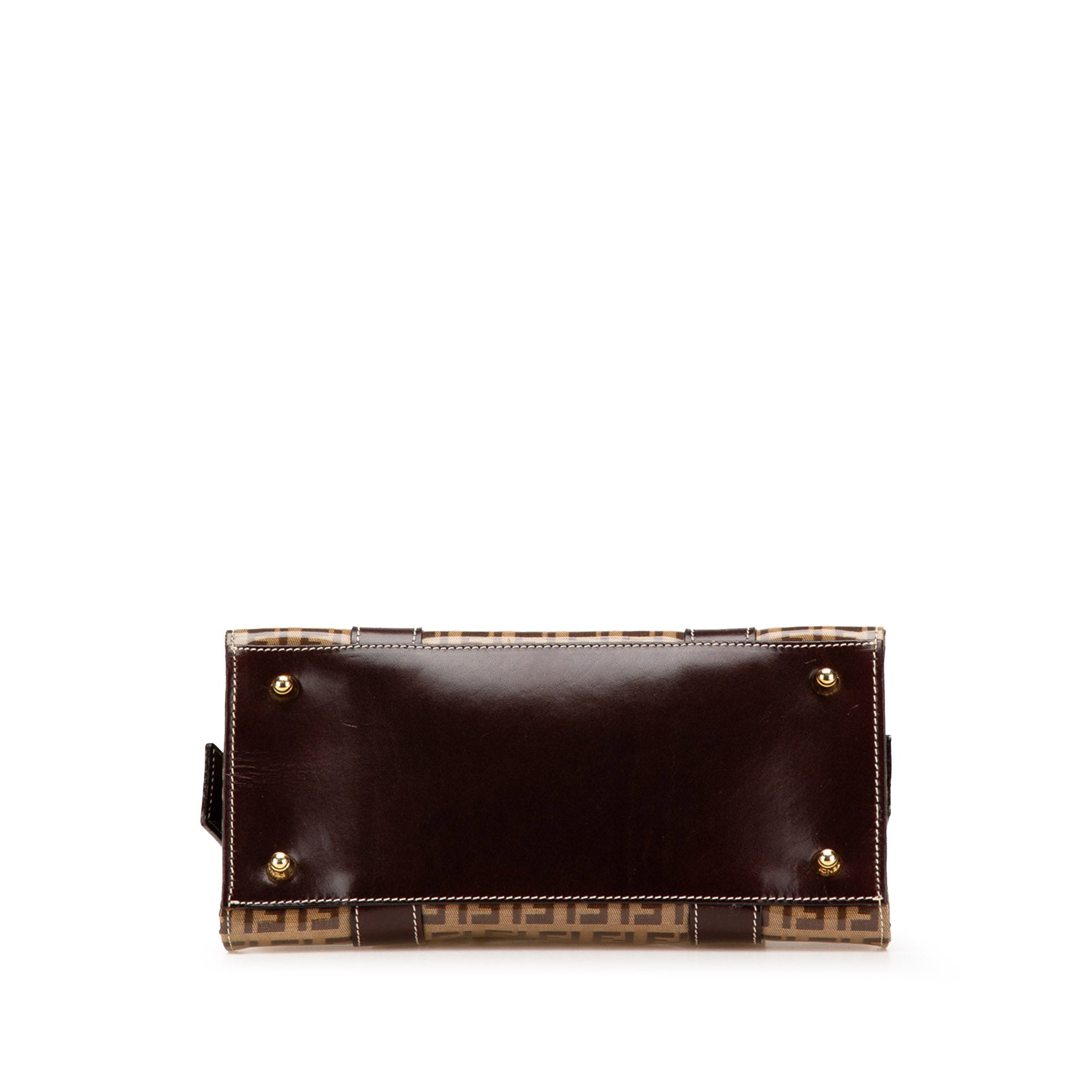 This handbag features a coated canvas body with leather trim, flat leather handles, a top zip closure, and interior zip and slip pockets. Retail Price: 1250.00