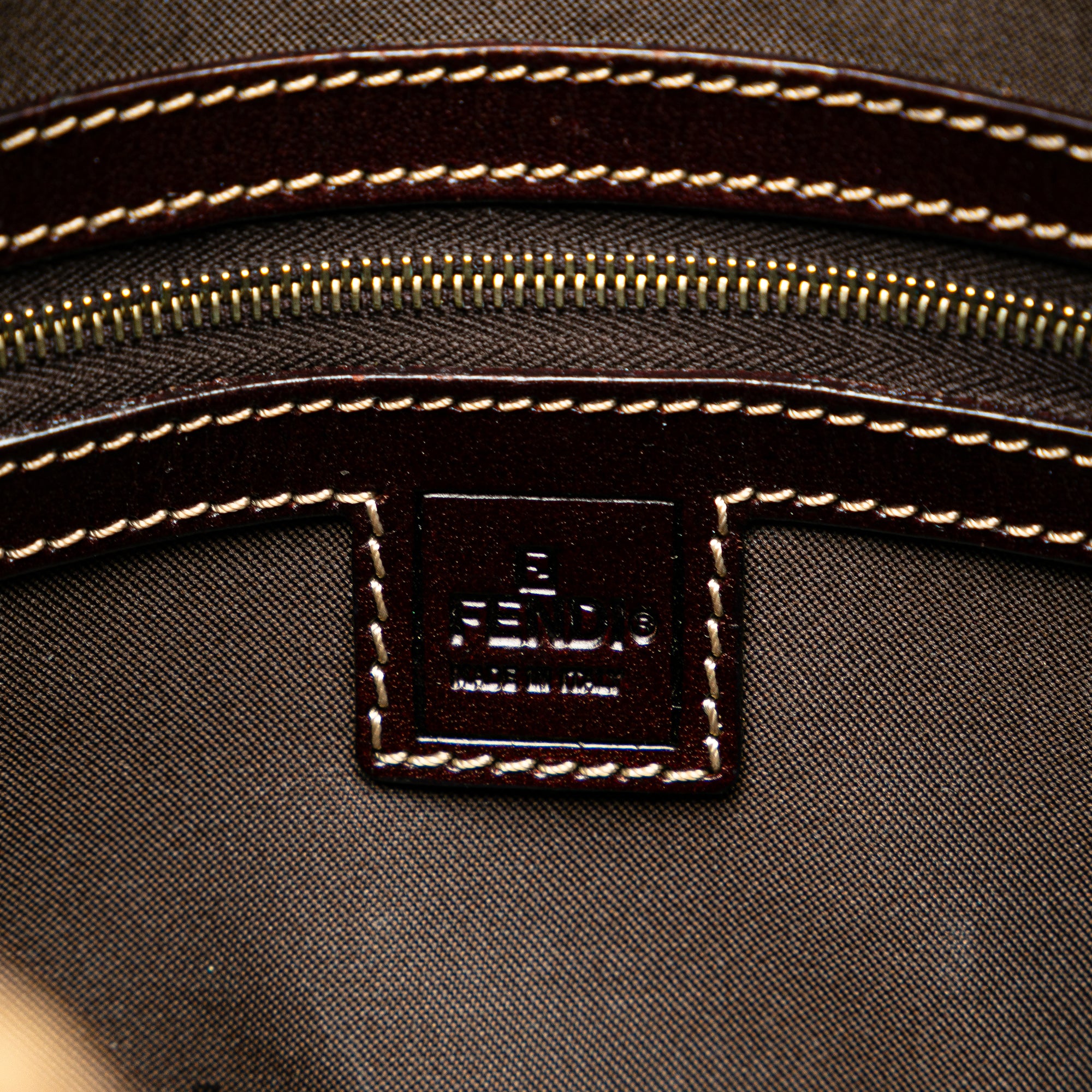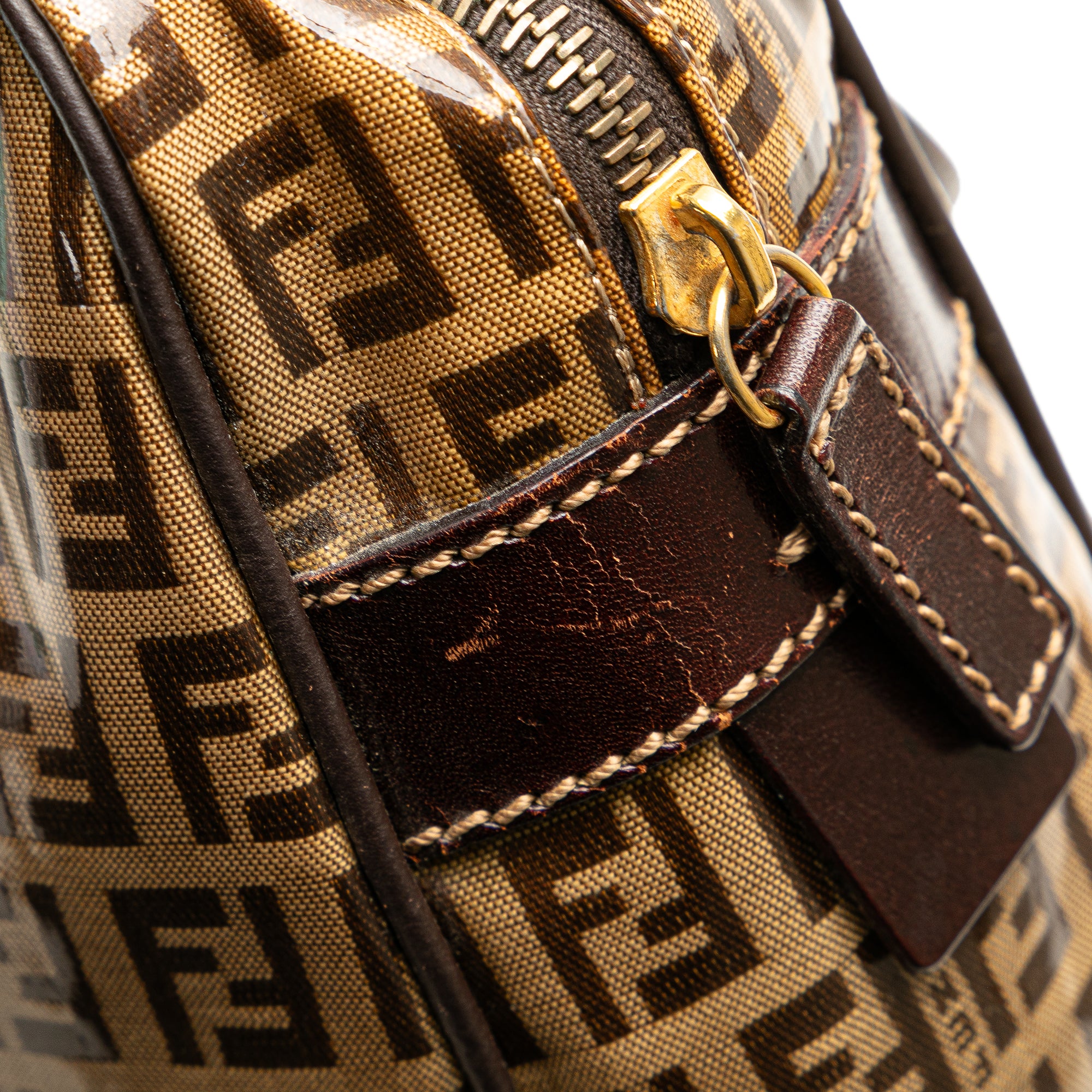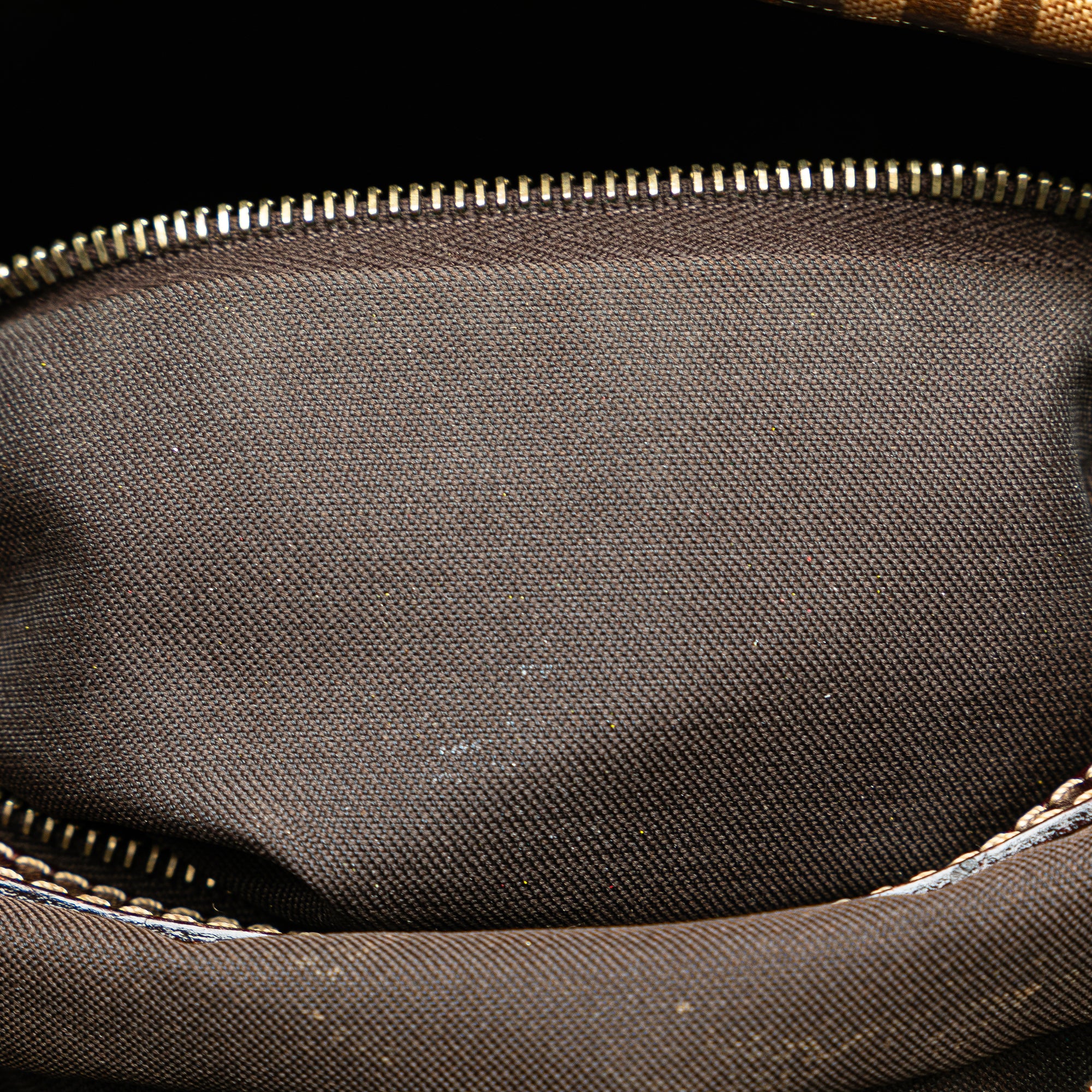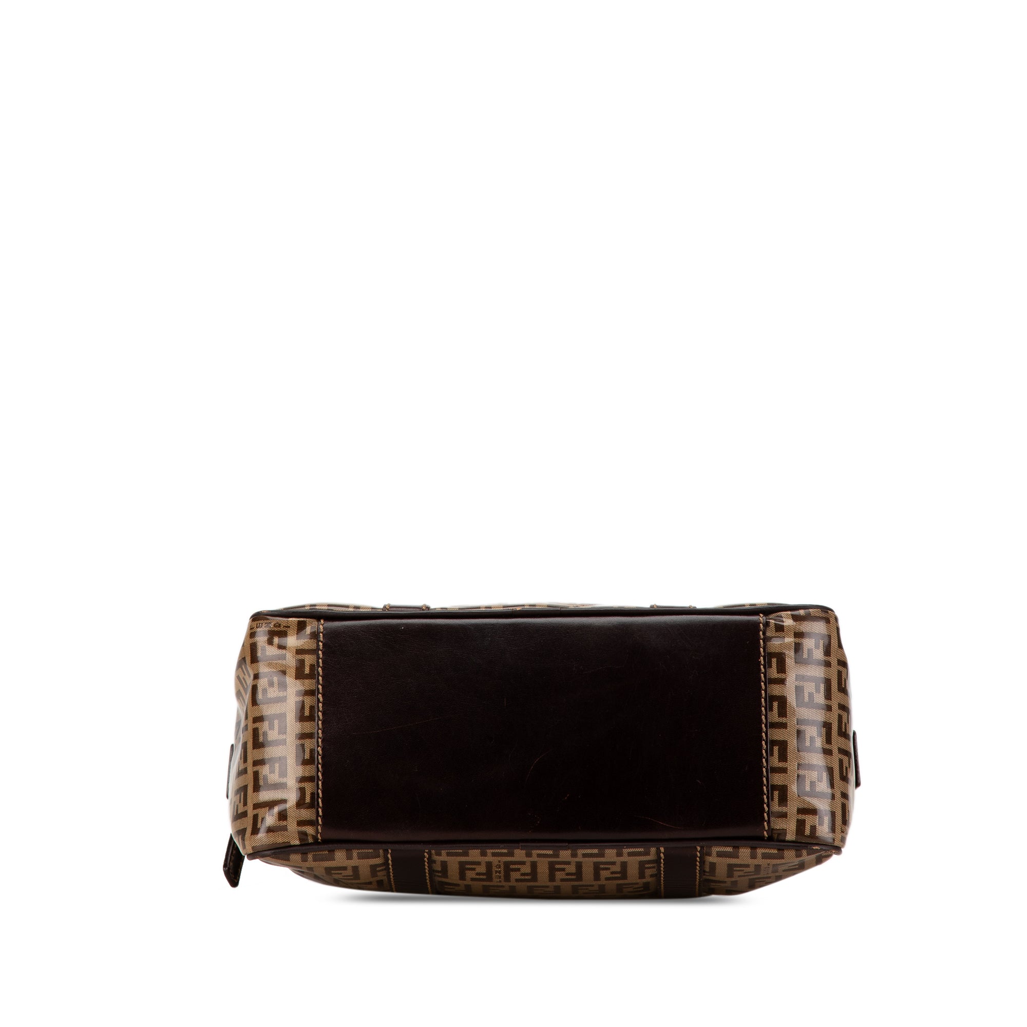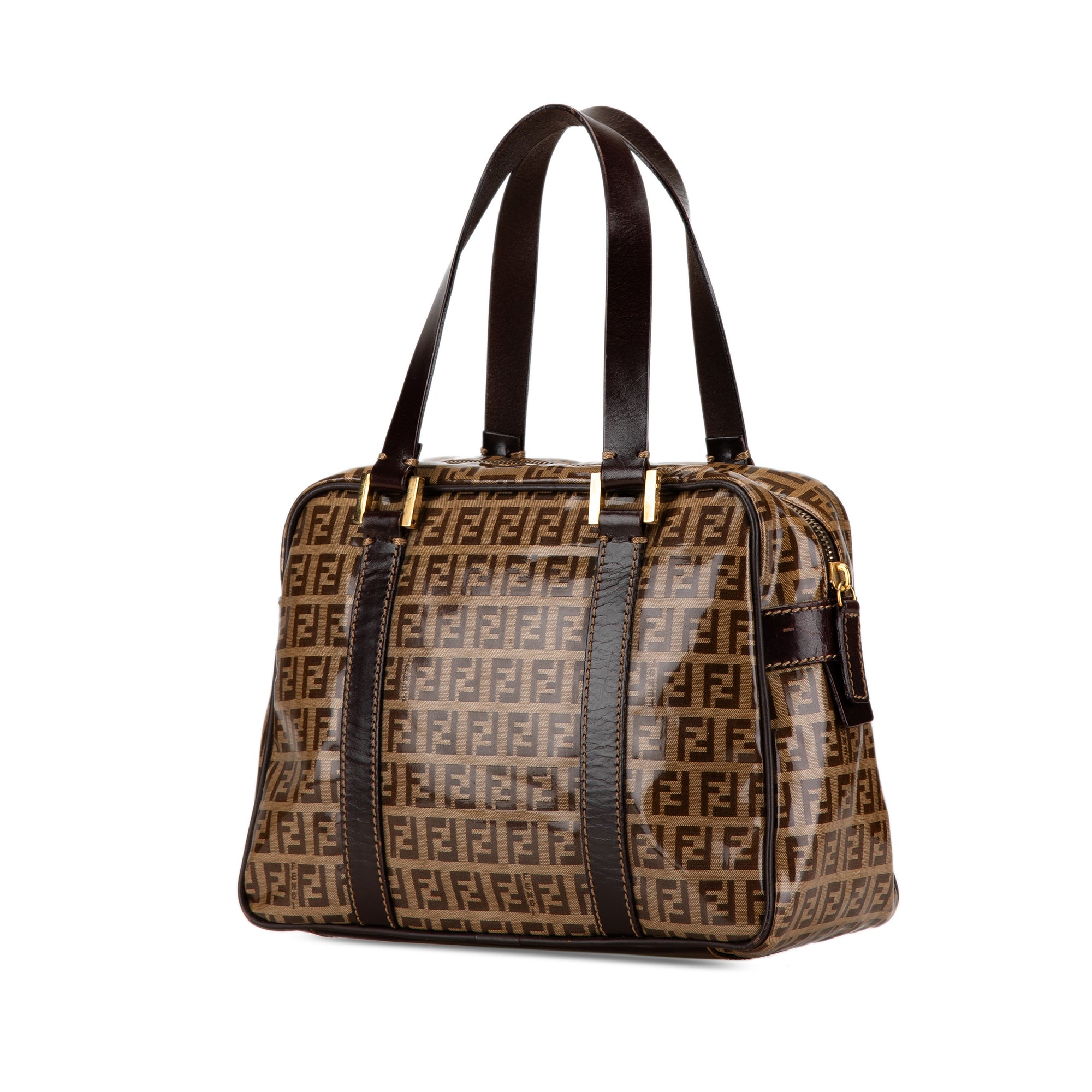 This handbag features a coated canvas body with leather trim, flat leather handles, a top zip closure, and interior zip and slip pockets. Retail Price: 400.00