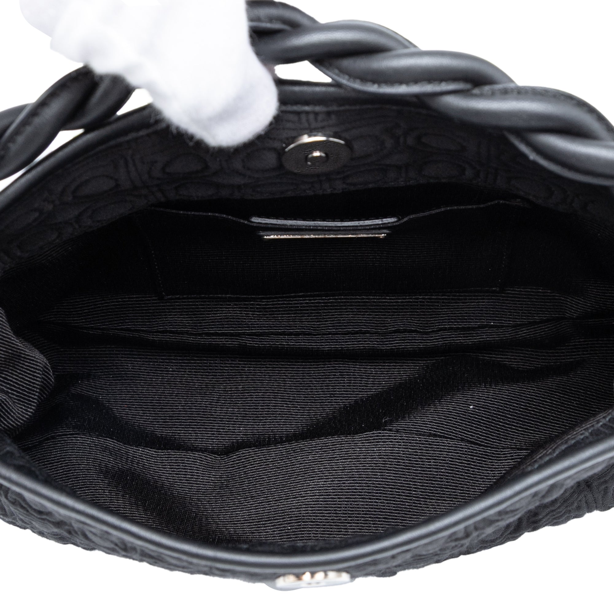 This handbag features a canvas body, a braided rolled leather top handle, a top flap with magnetic closure, and an interior slip pocket. Retail Price: 1050.00