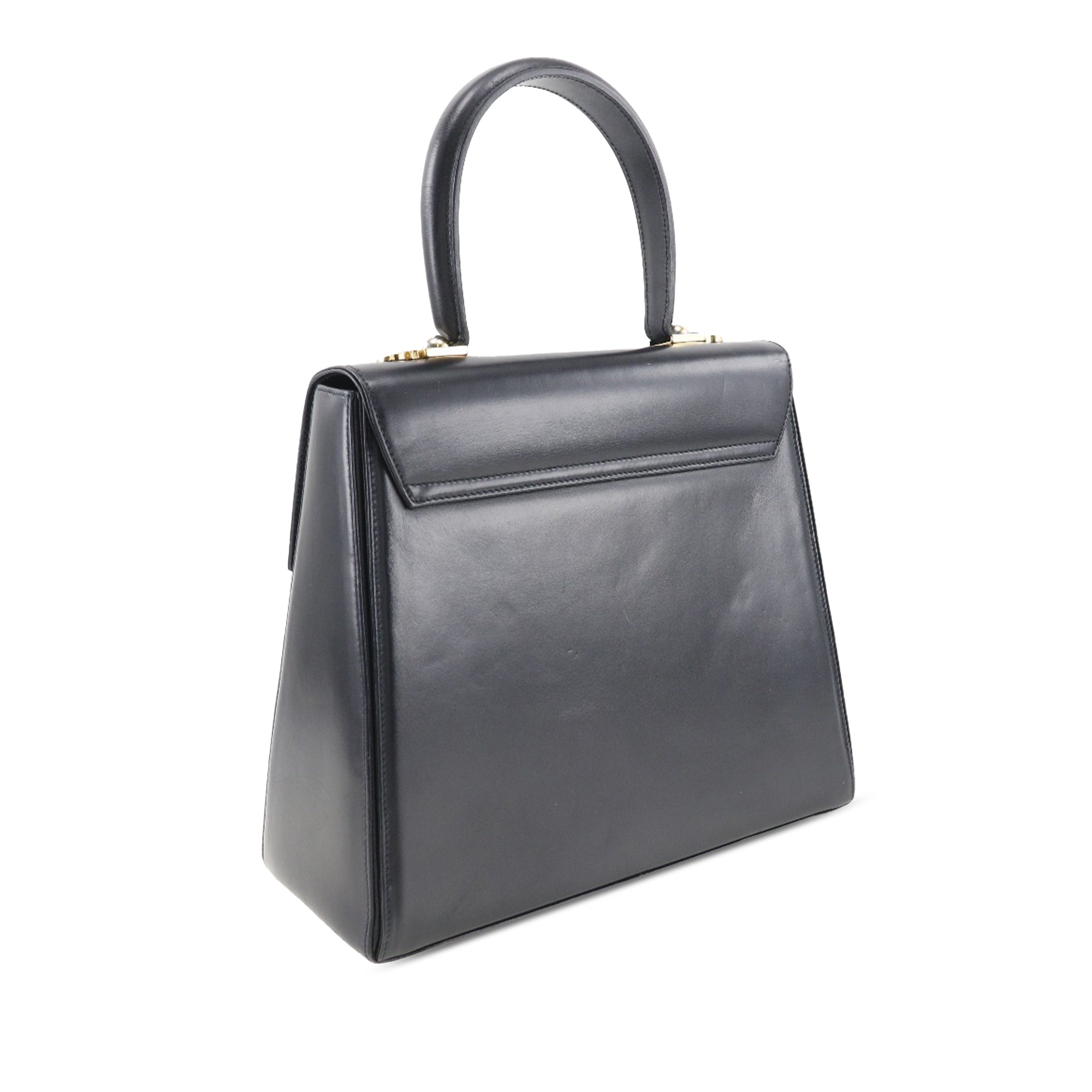 This handbag features a leather body, a flat top handle, a front flap with flip lock closure, and an interior zip pocket. Retail Price: 2900.00