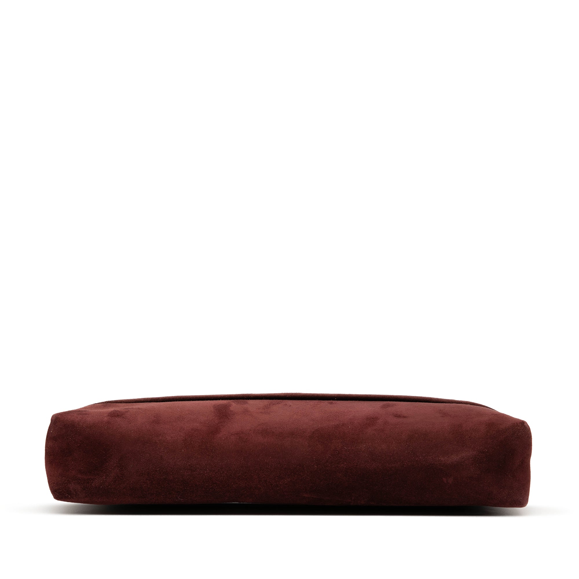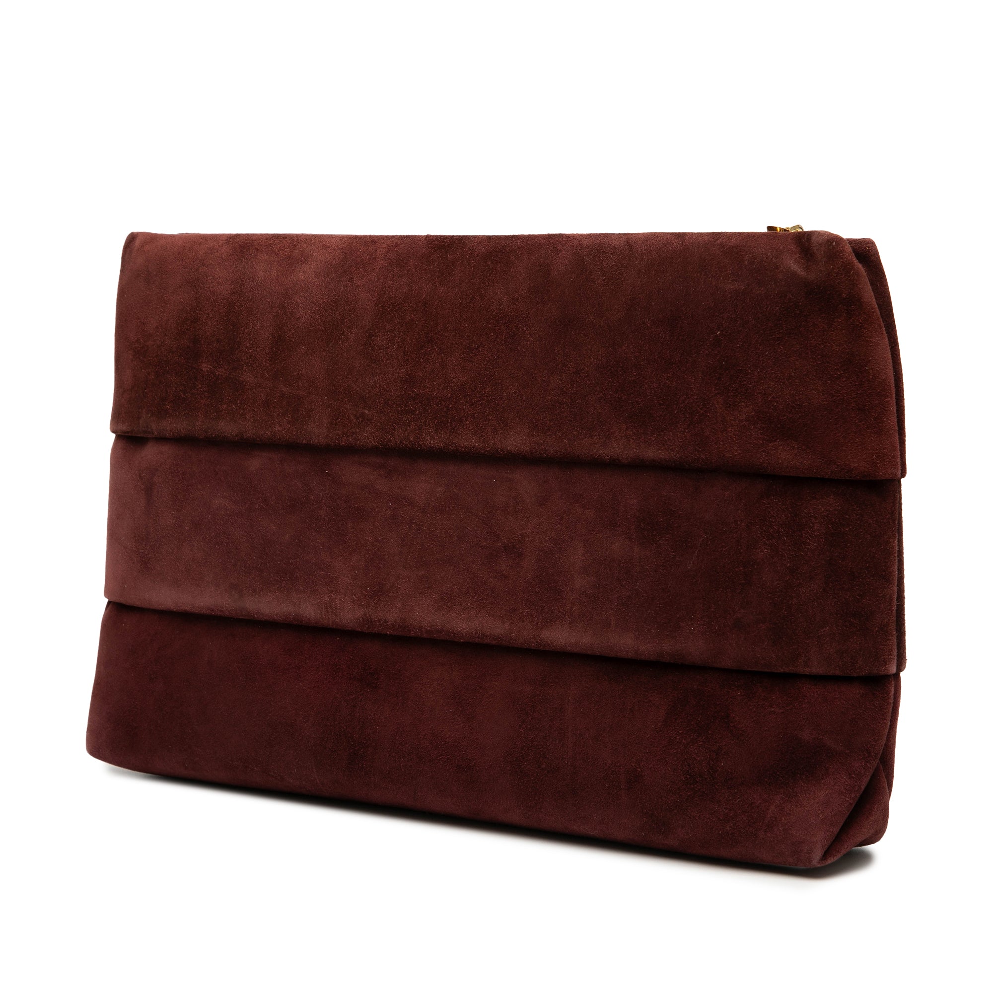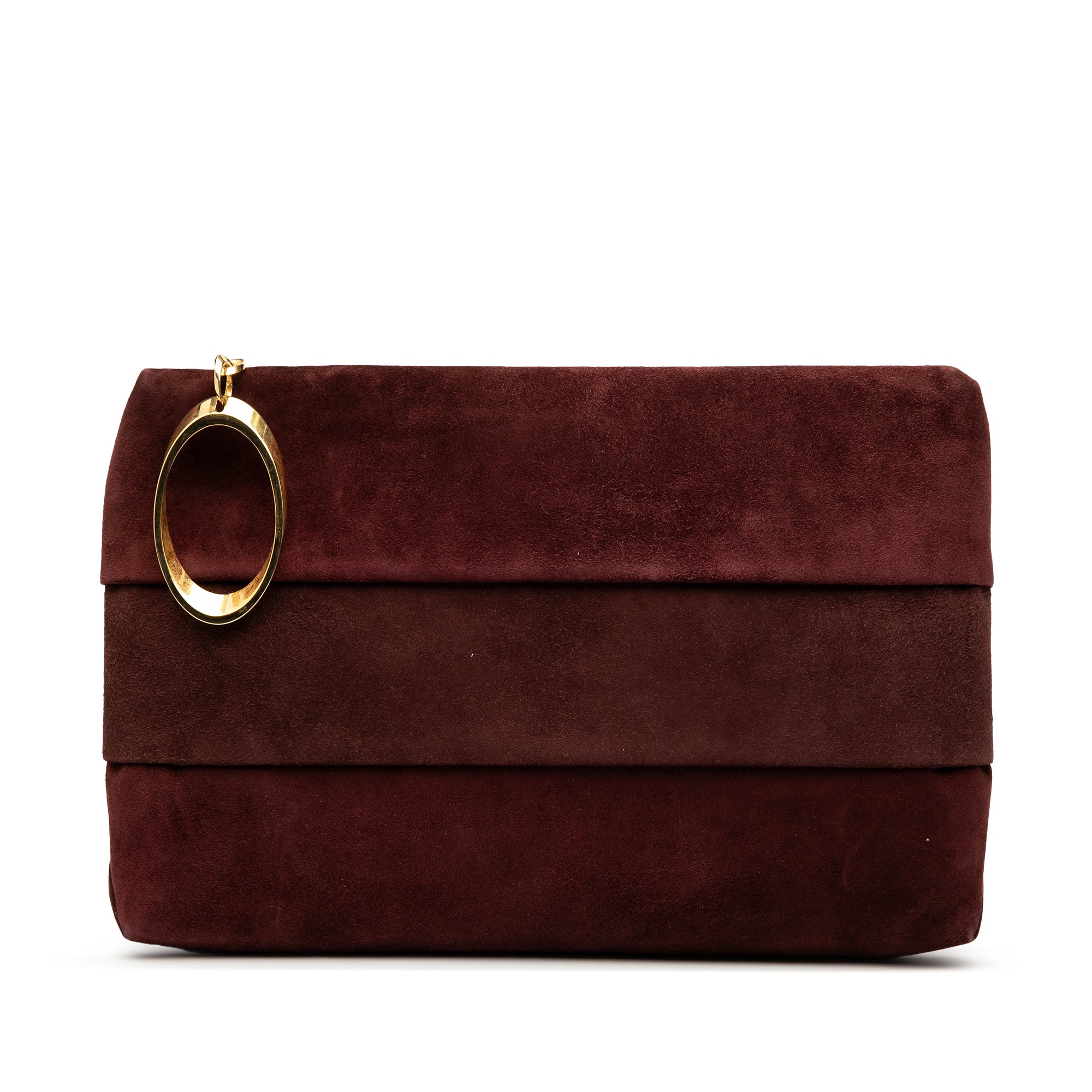 This clutch bag features a suede leather body, a top zip closure, and an interior zip pocket. Inclusion: Dust bag. Retail Price: 700.00