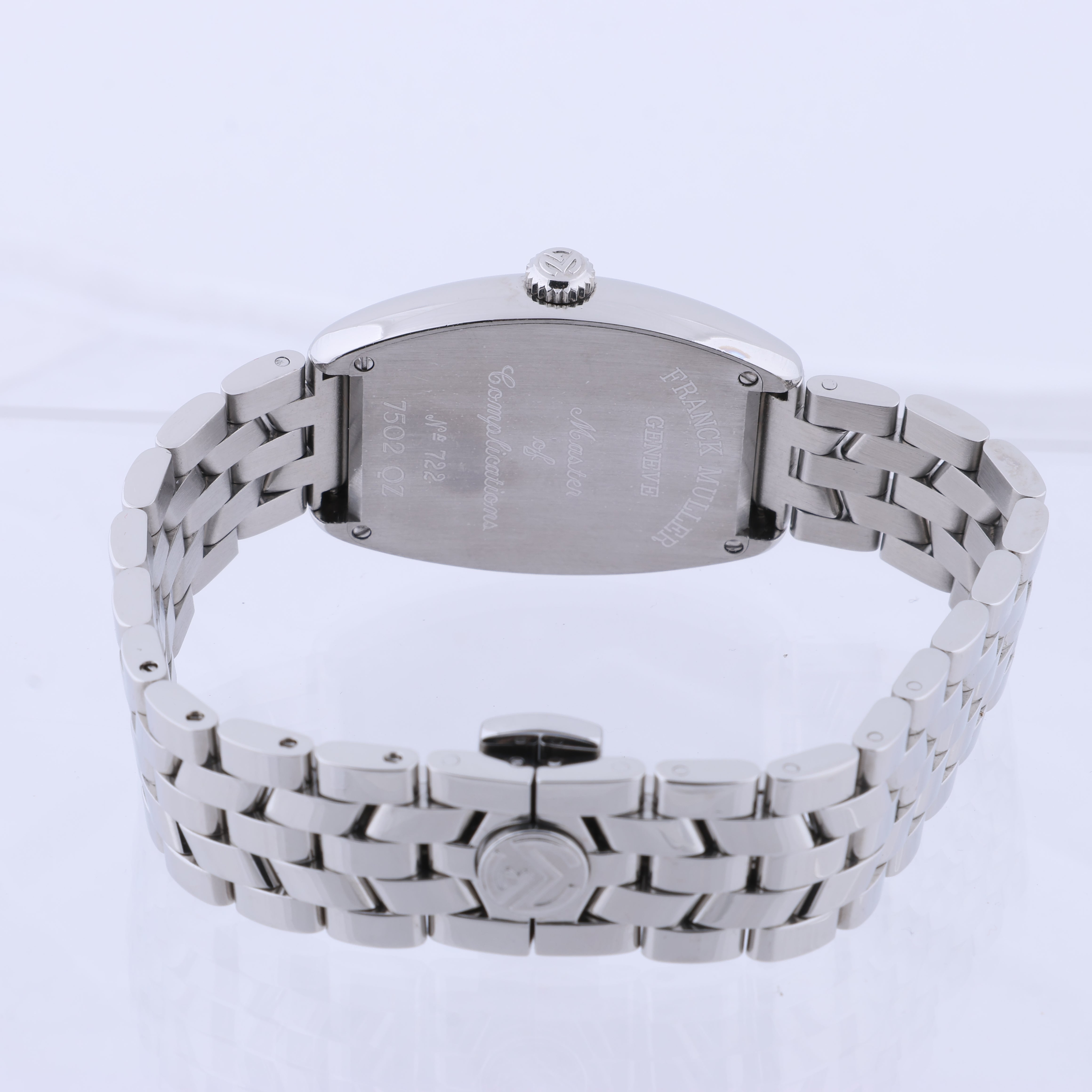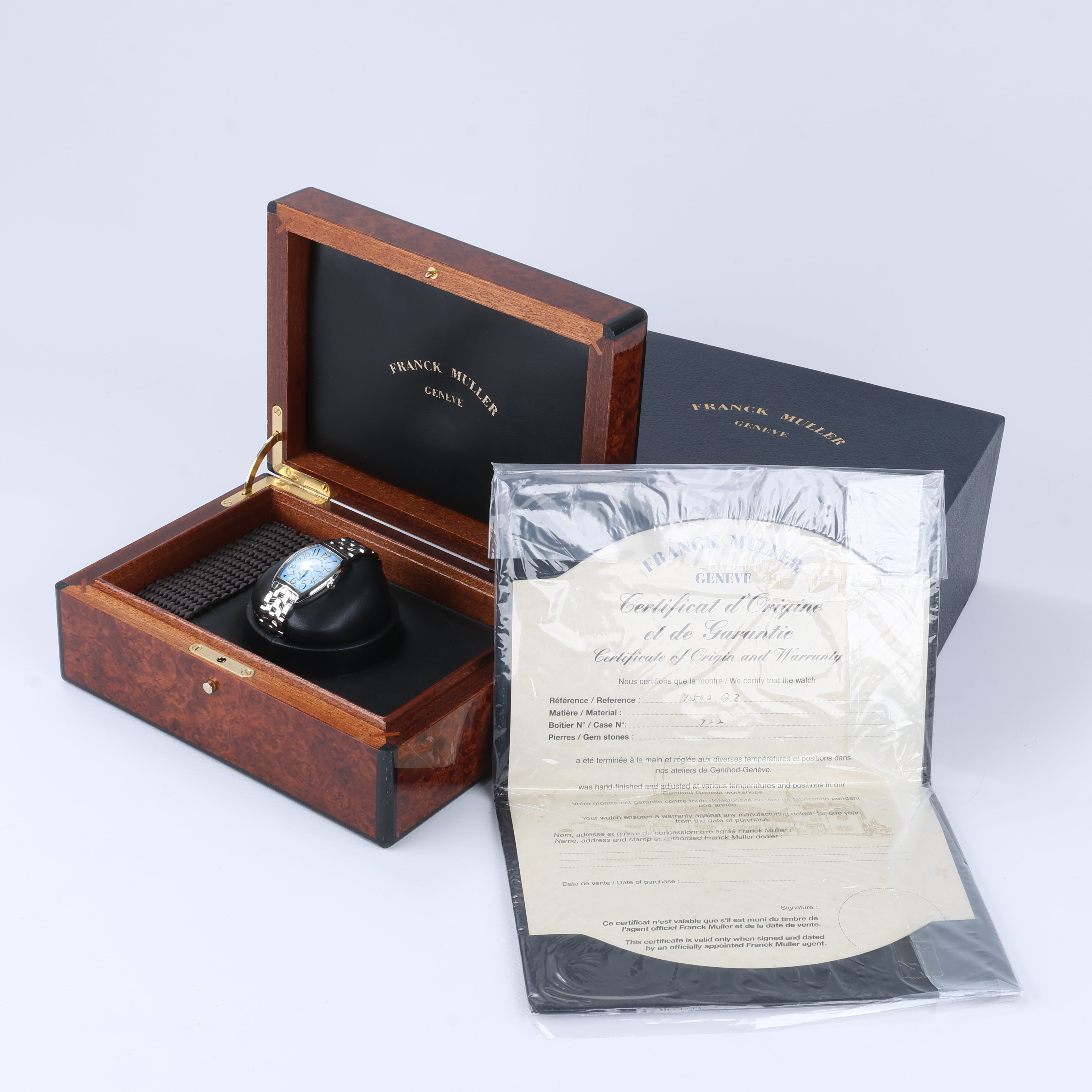 Brand: Franck MullerModel: Tonneau CurvexReference: 7502QZCondition: Excellent Condition Details: In great condition with minor signs of wear as light hairline scratches on stainless steel, see photos for reference. Watch has just been serviced and checked. Dial Colour: BlueCase Material: Stainless steel Starp Colour: Silver Strap material: Stainless steelMovement: QuartzClosure: Fold claspFace Diameter: 29 mm Approx. circumference: 202.5 mmComes With: Original Box, Document