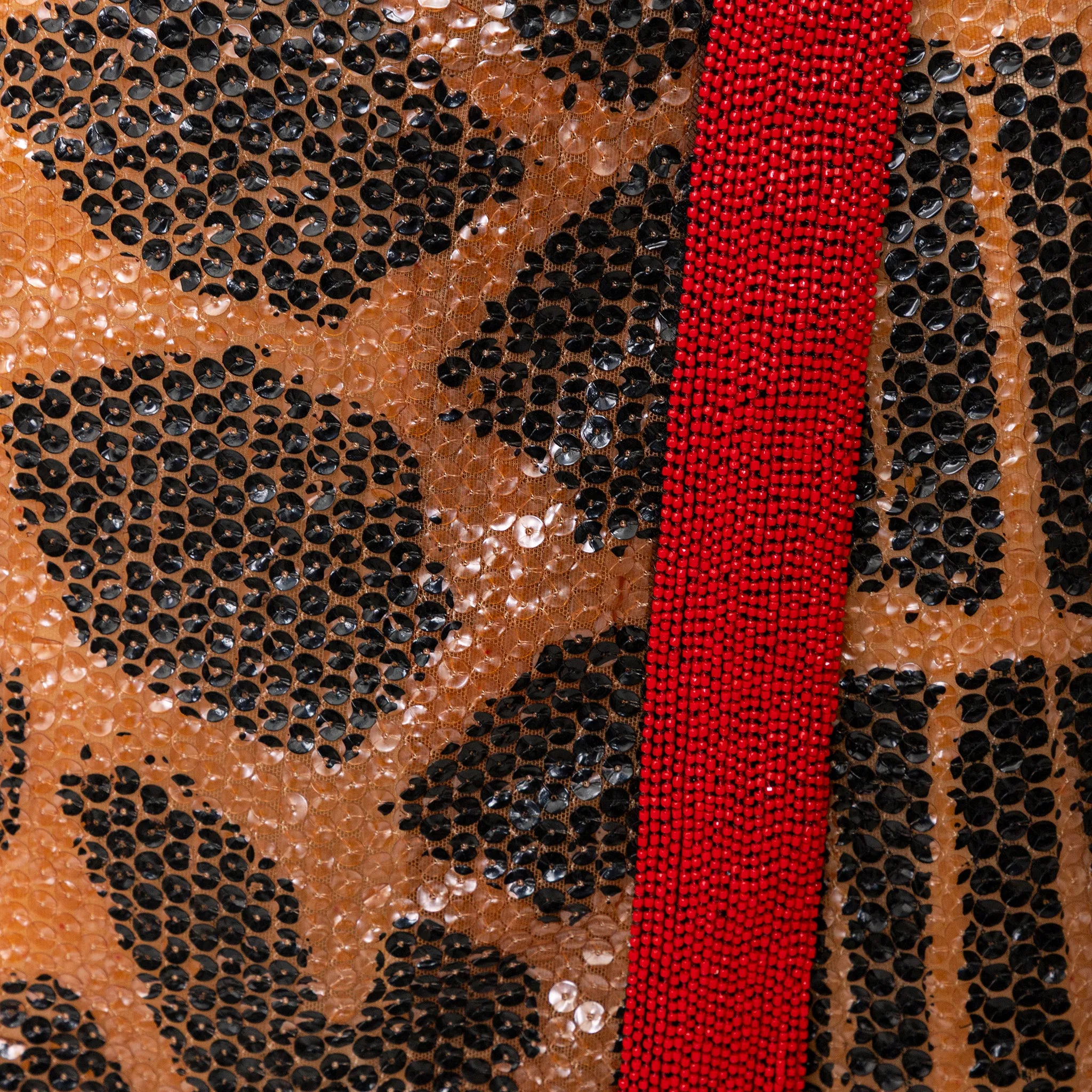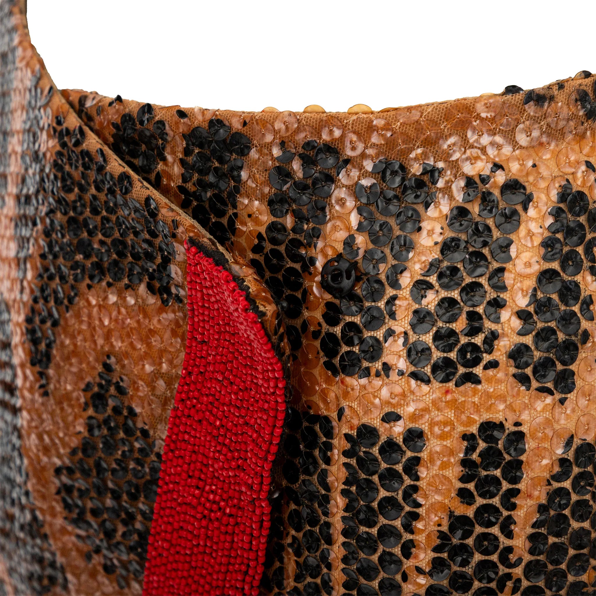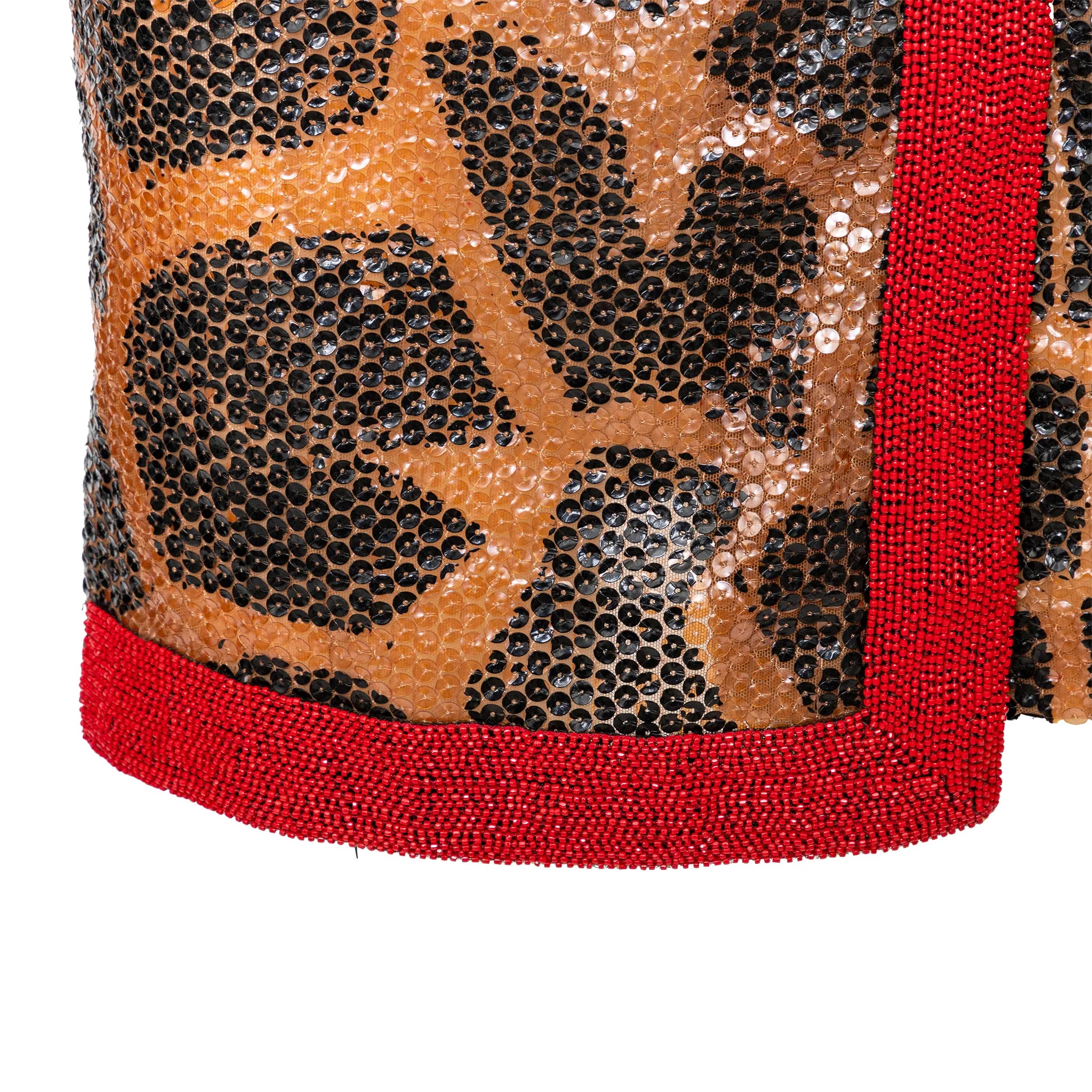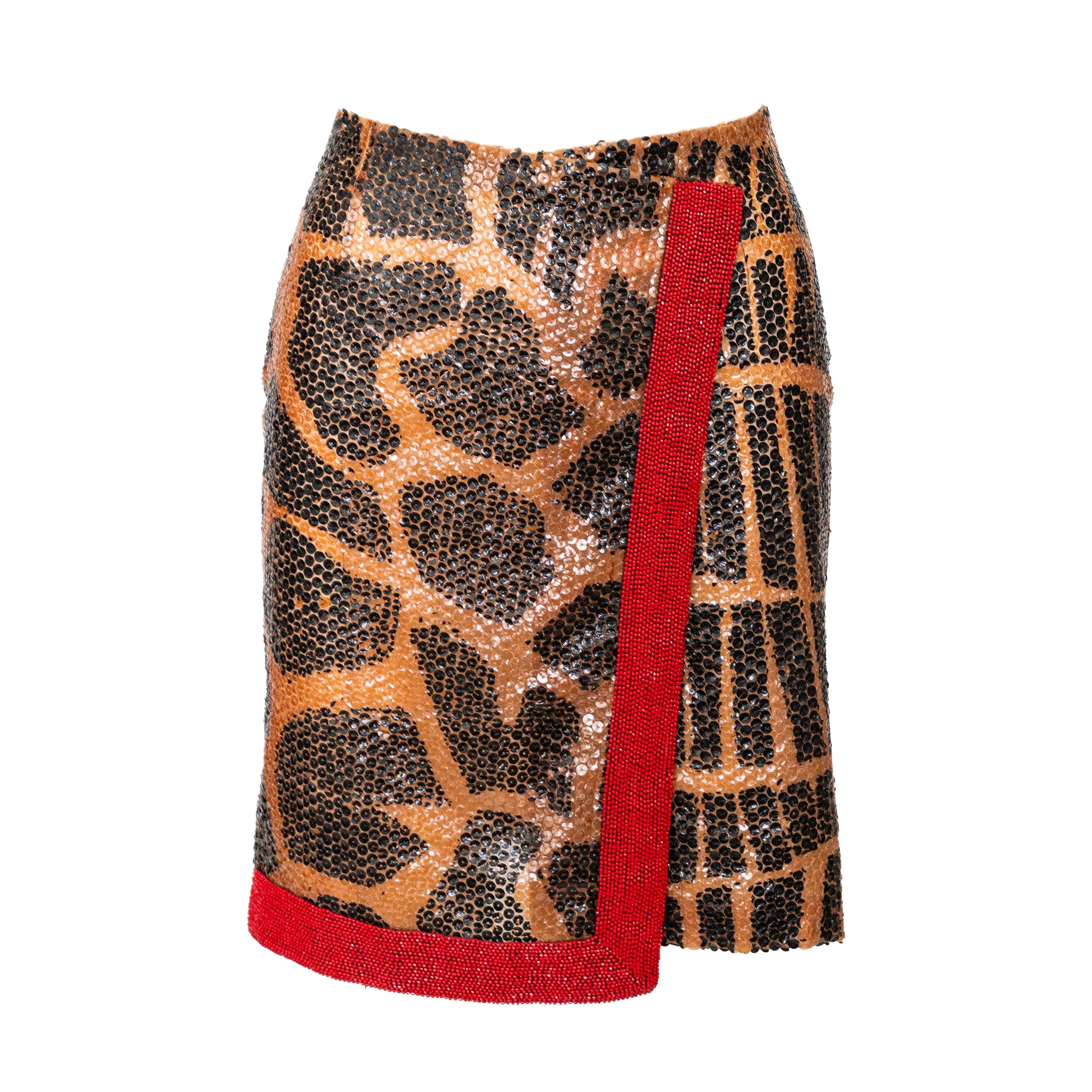 Gianfranco Ferré sequin-embellished wrap style skirt with bold animal print and striking red beaded trim — a statement piece for glamorous evening wear. With a silk lining and snap button closure.
