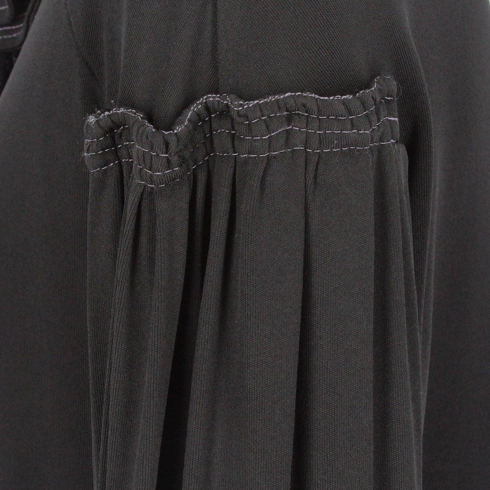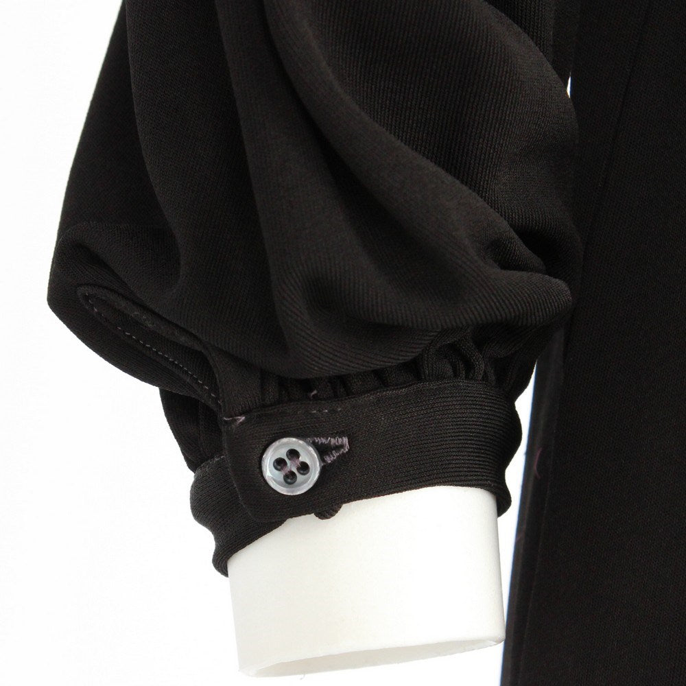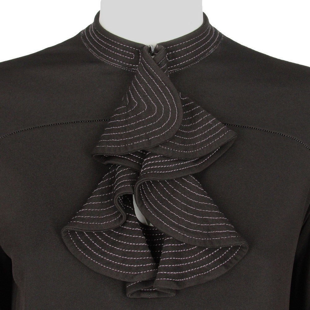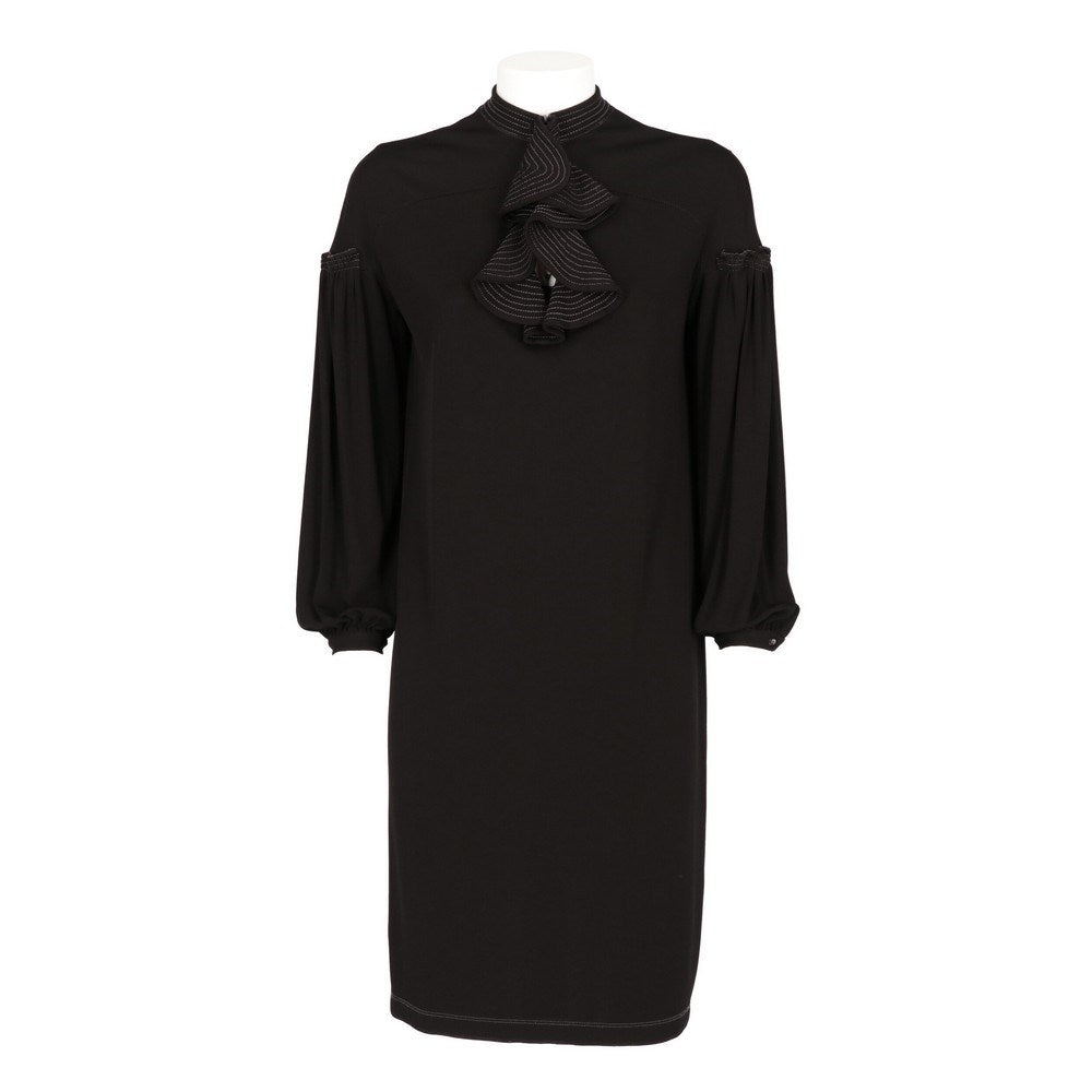 Gianfranco Ferré black dress with decorative frontal ruches. Crew-neck, long sleeves with curly details and buttoned cuffs. The item has a button ruined, as shown in the pictures.