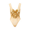 Vintage 90s Gianfranco Ferré bodysuit in beige mesh with golden sequin embellishment in a signature Ferré motif.