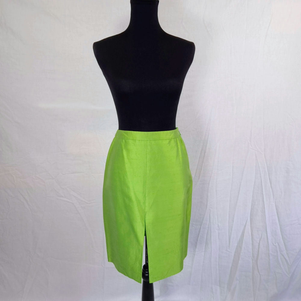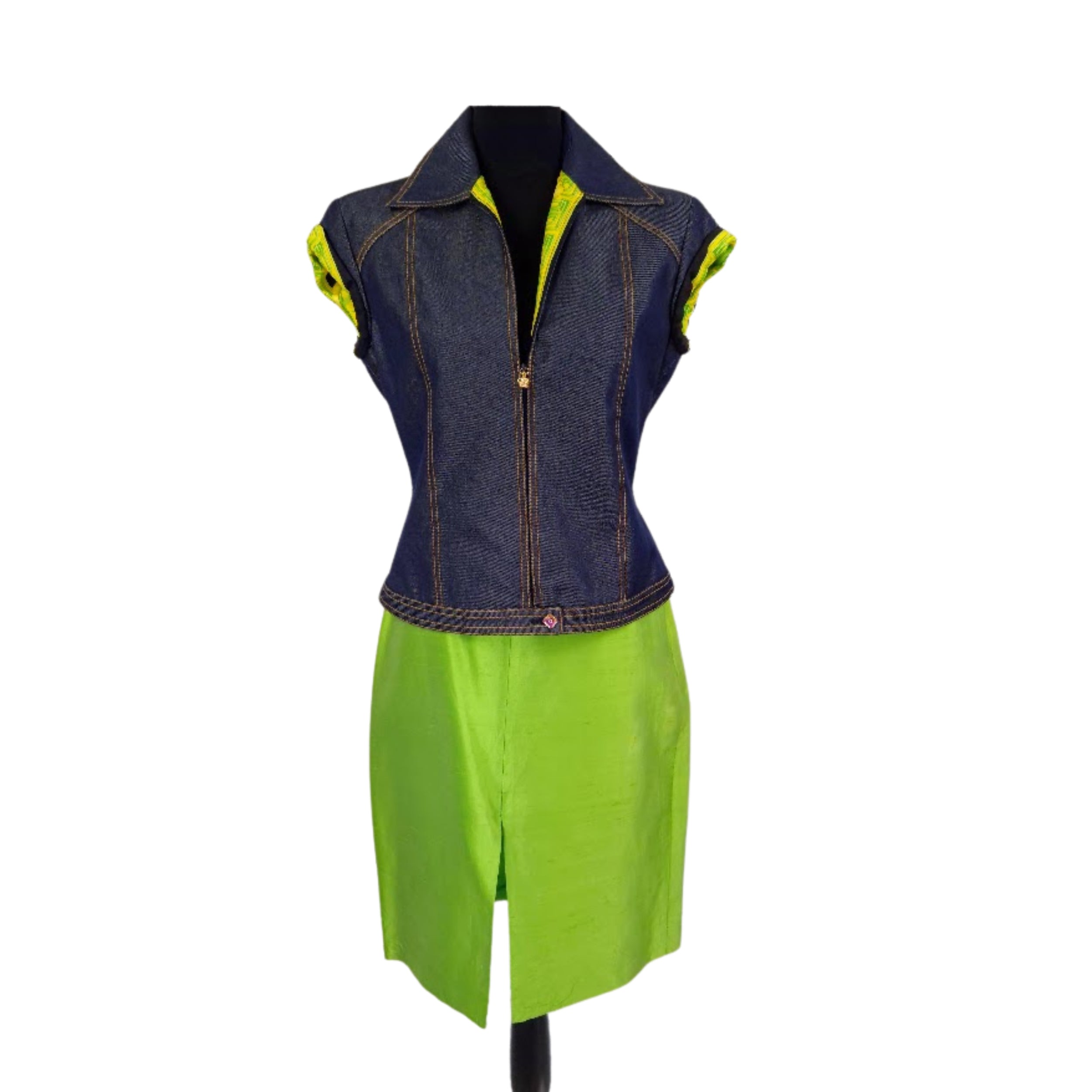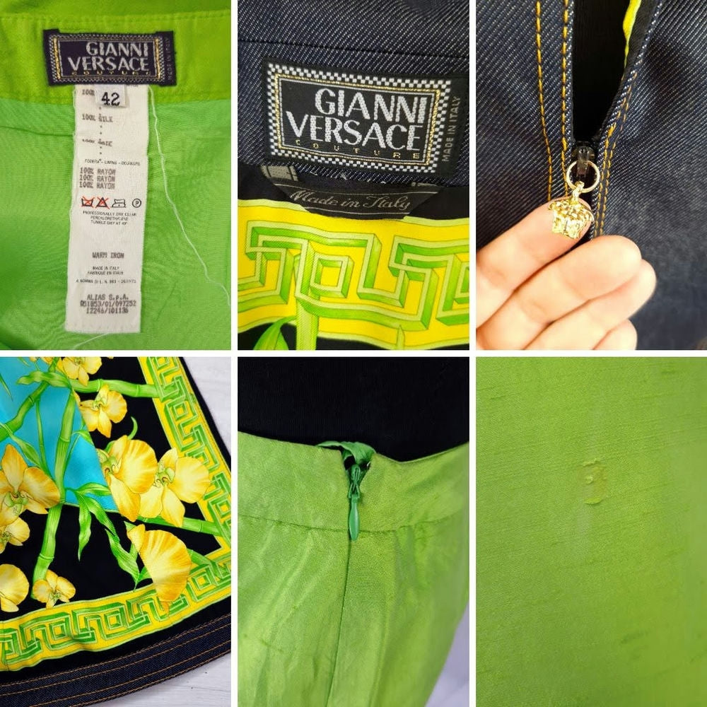 Versace silk suit, top with Medusa zipper and green skirt. Inside jacket with bamboo and orchid print. Donatella Versace, iconic SS 2000 collection. Made in Italy