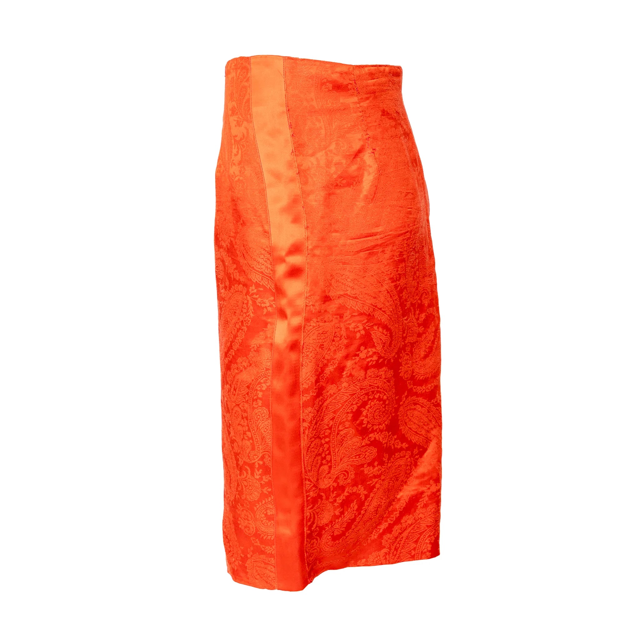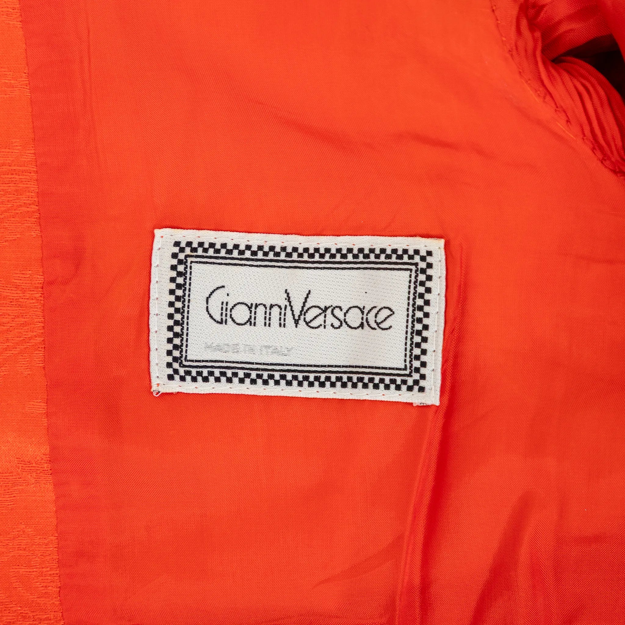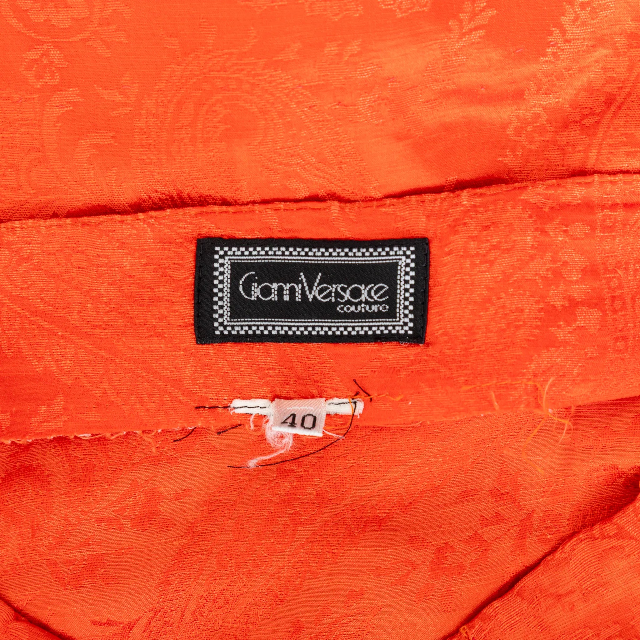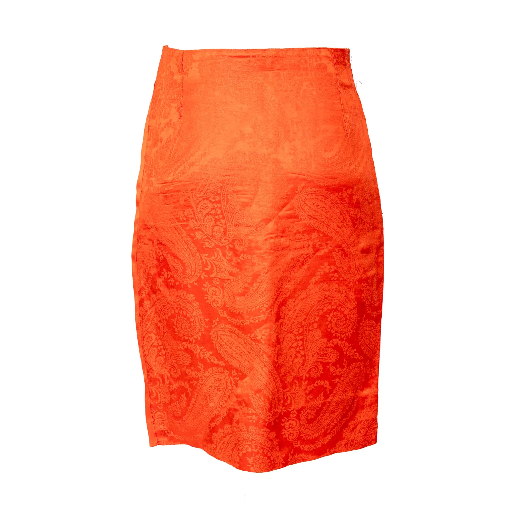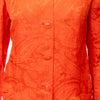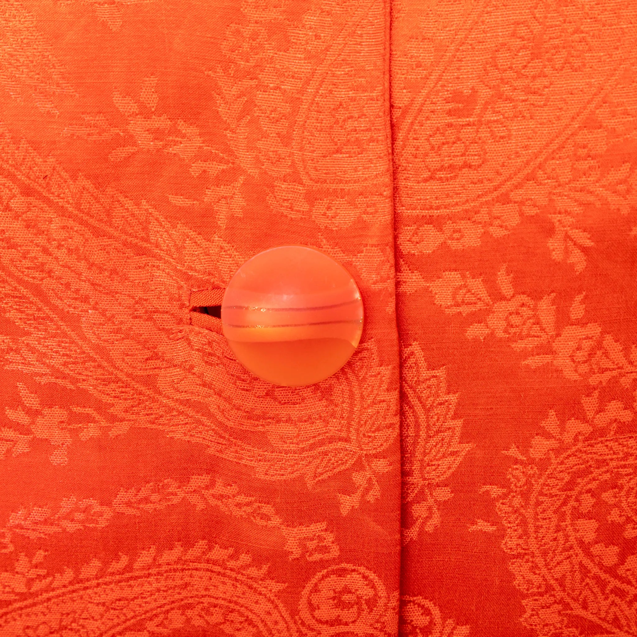 Bright orange paisley print on silk Gianni Versace blazer with flap pockets, crew neck, and orange buttons. Matching skirt features silk side panel and back button closure.