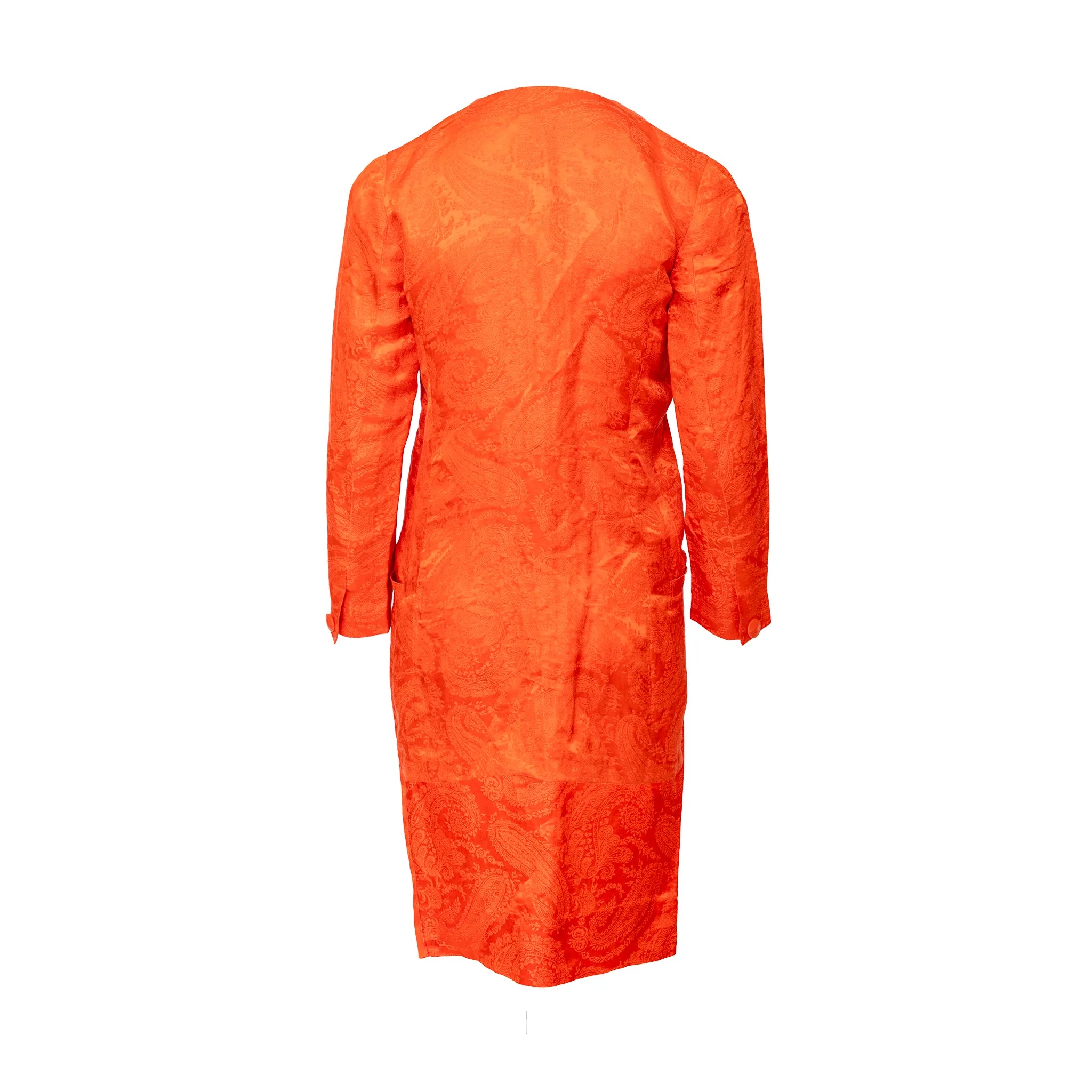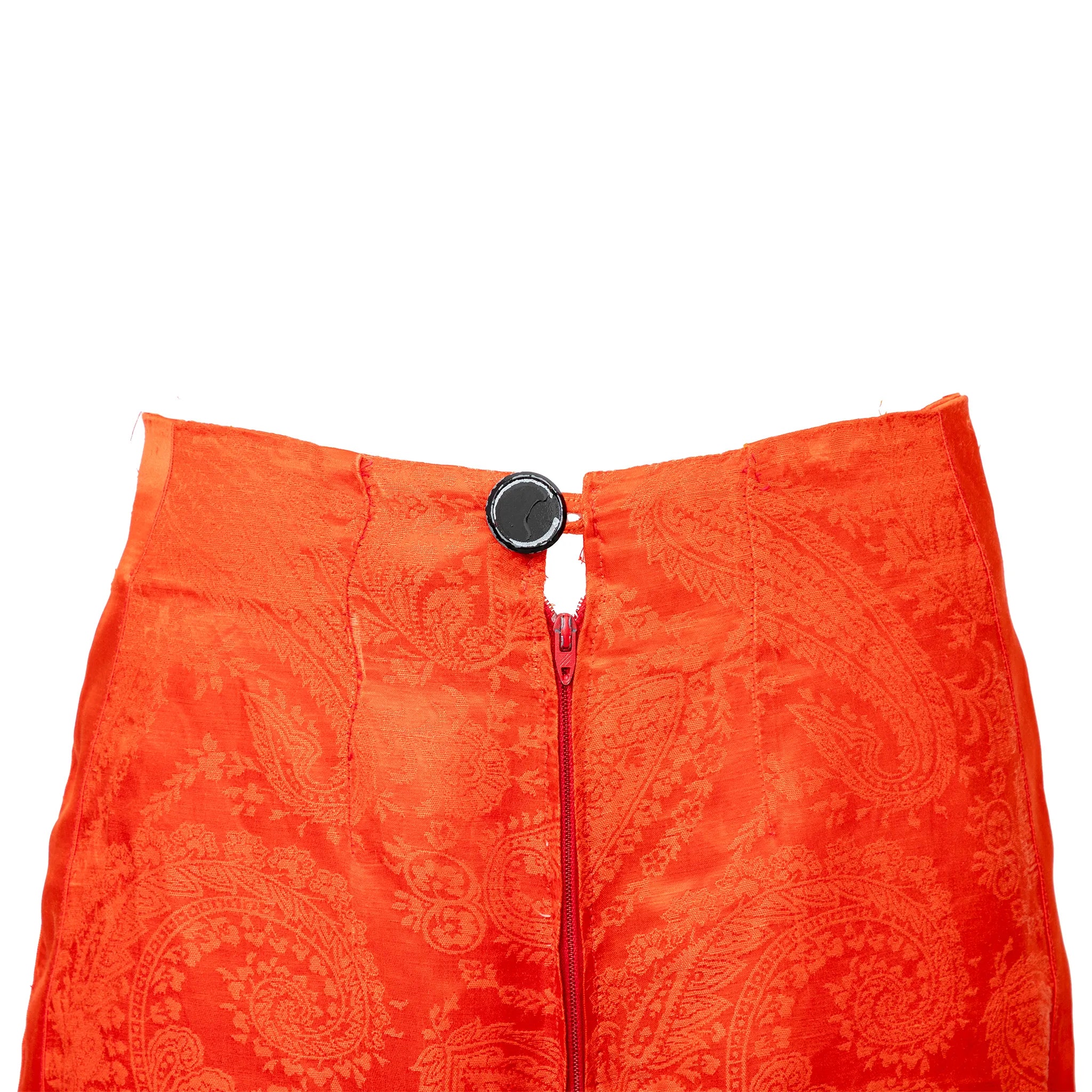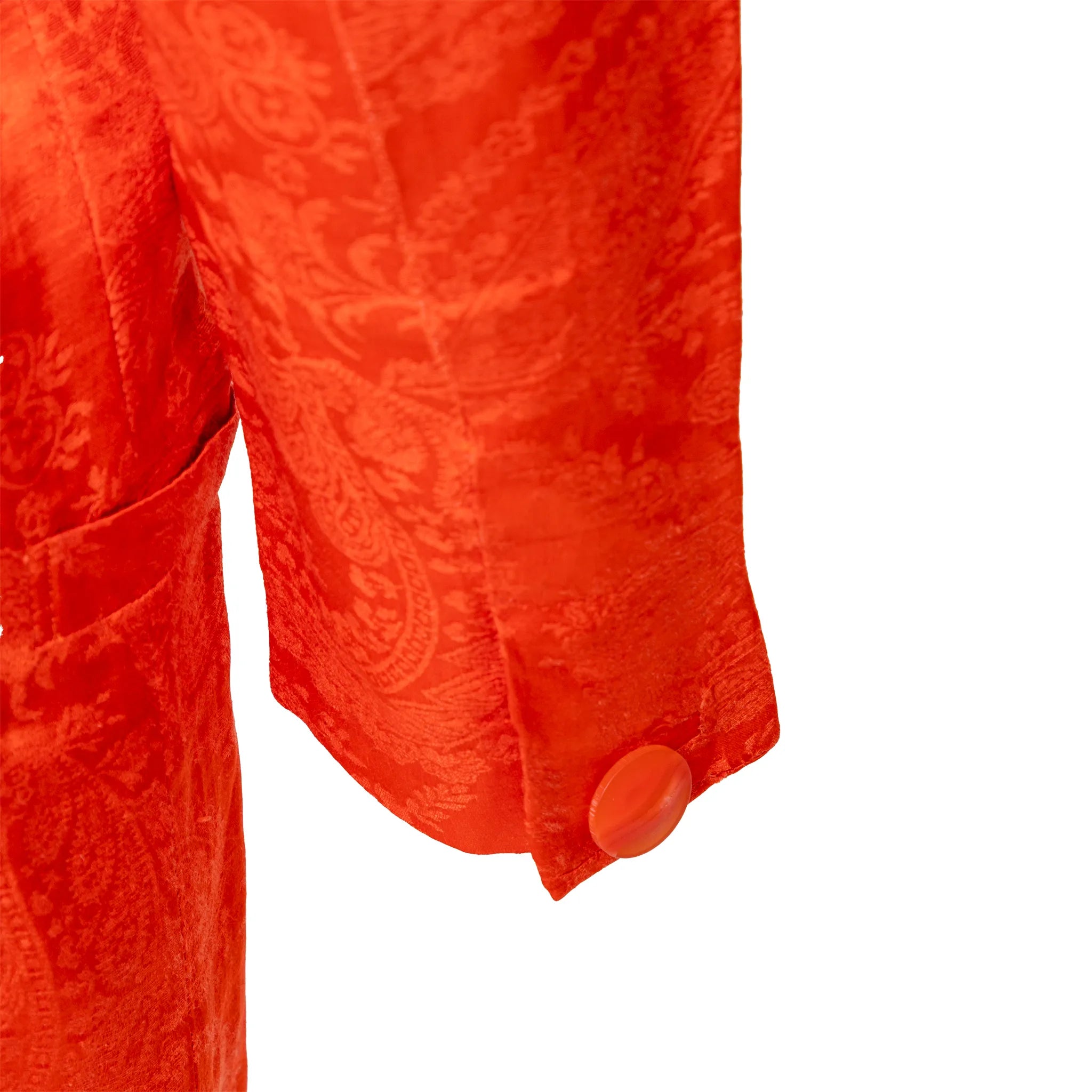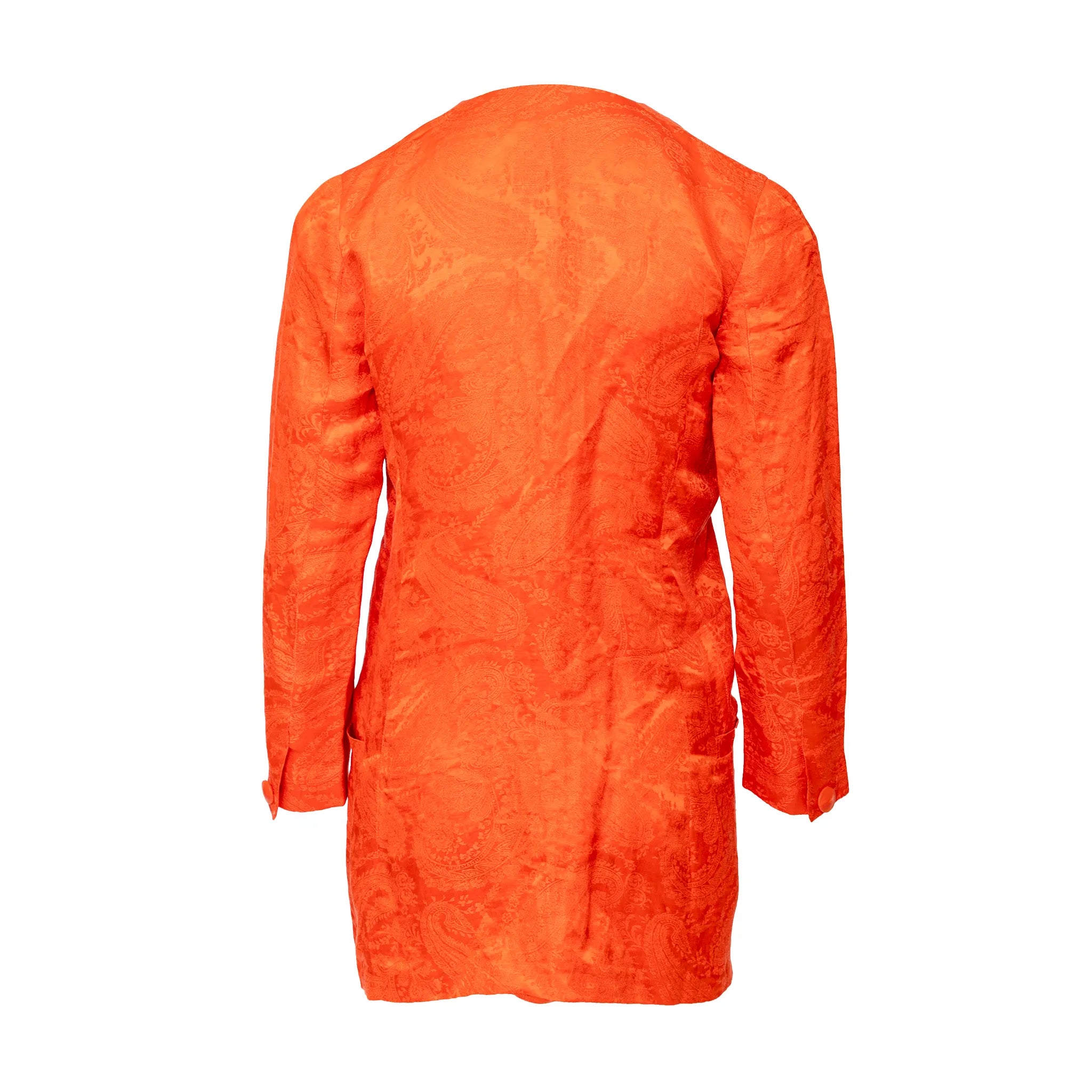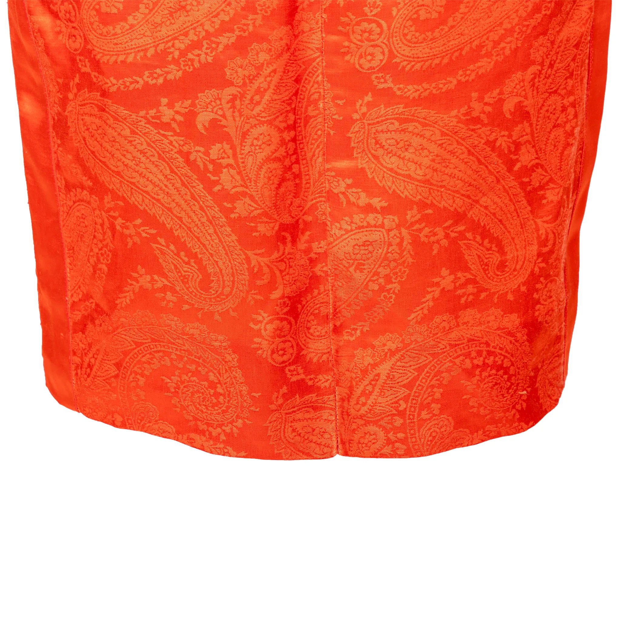 Bright orange paisley print on silk Gianni Versace blazer with flap pockets, crew neck, and orange buttons. Matching skirt features silk side panel and back button closure.