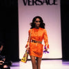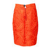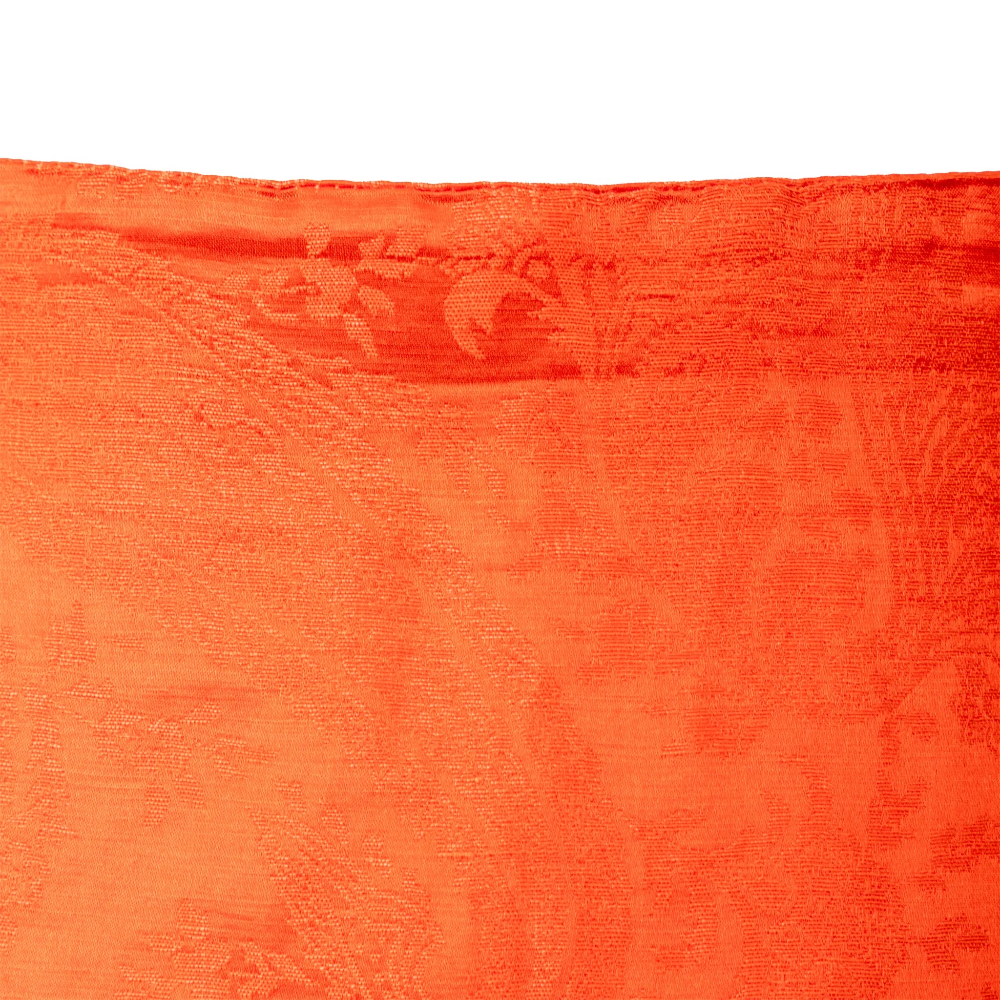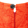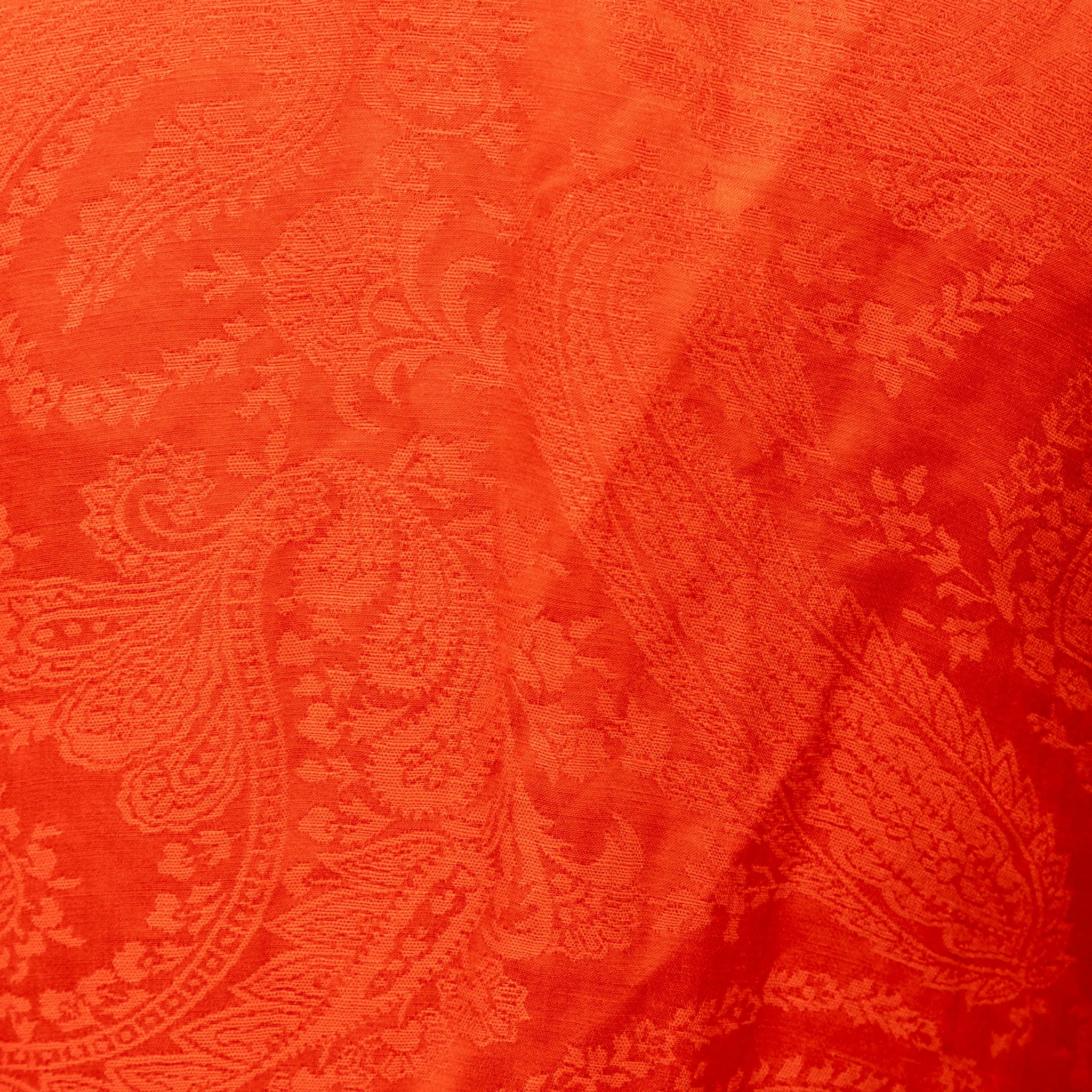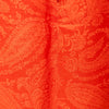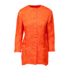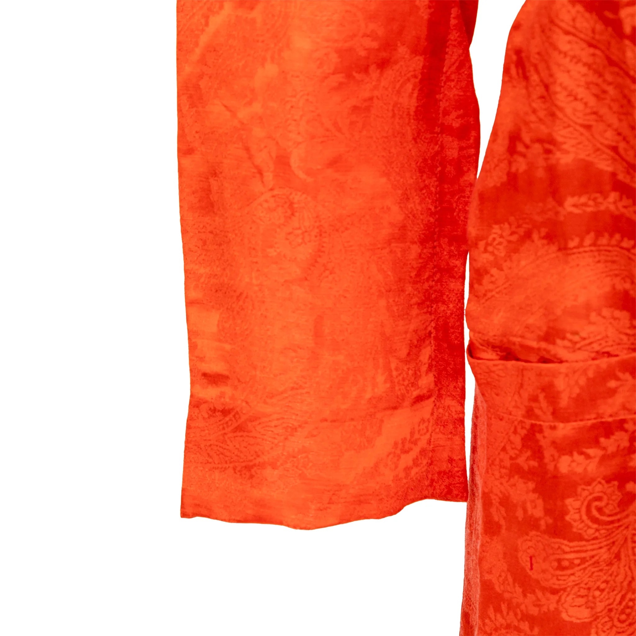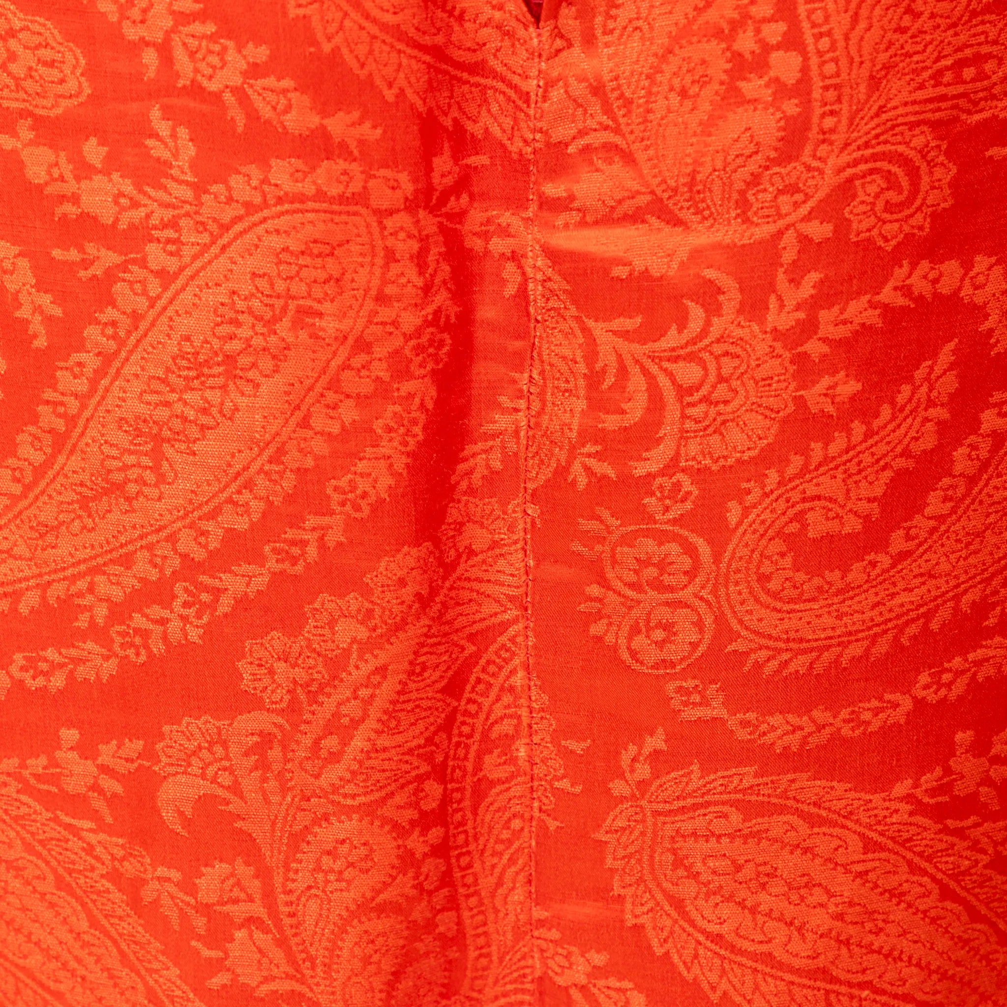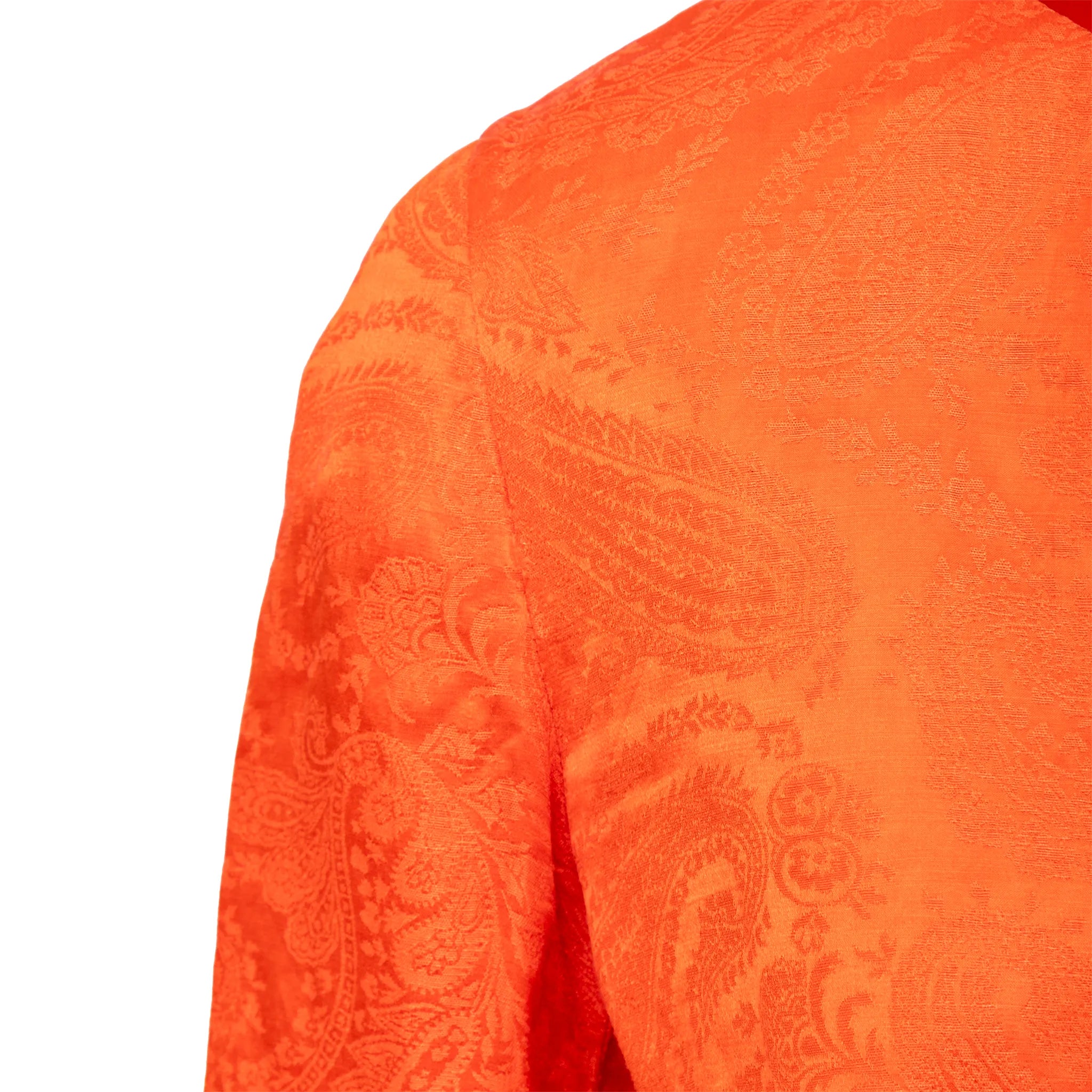 Bright orange paisley print on silk Gianni Versace blazer with flap pockets, crew neck, and orange buttons. Matching skirt features silk side panel and back button closure.