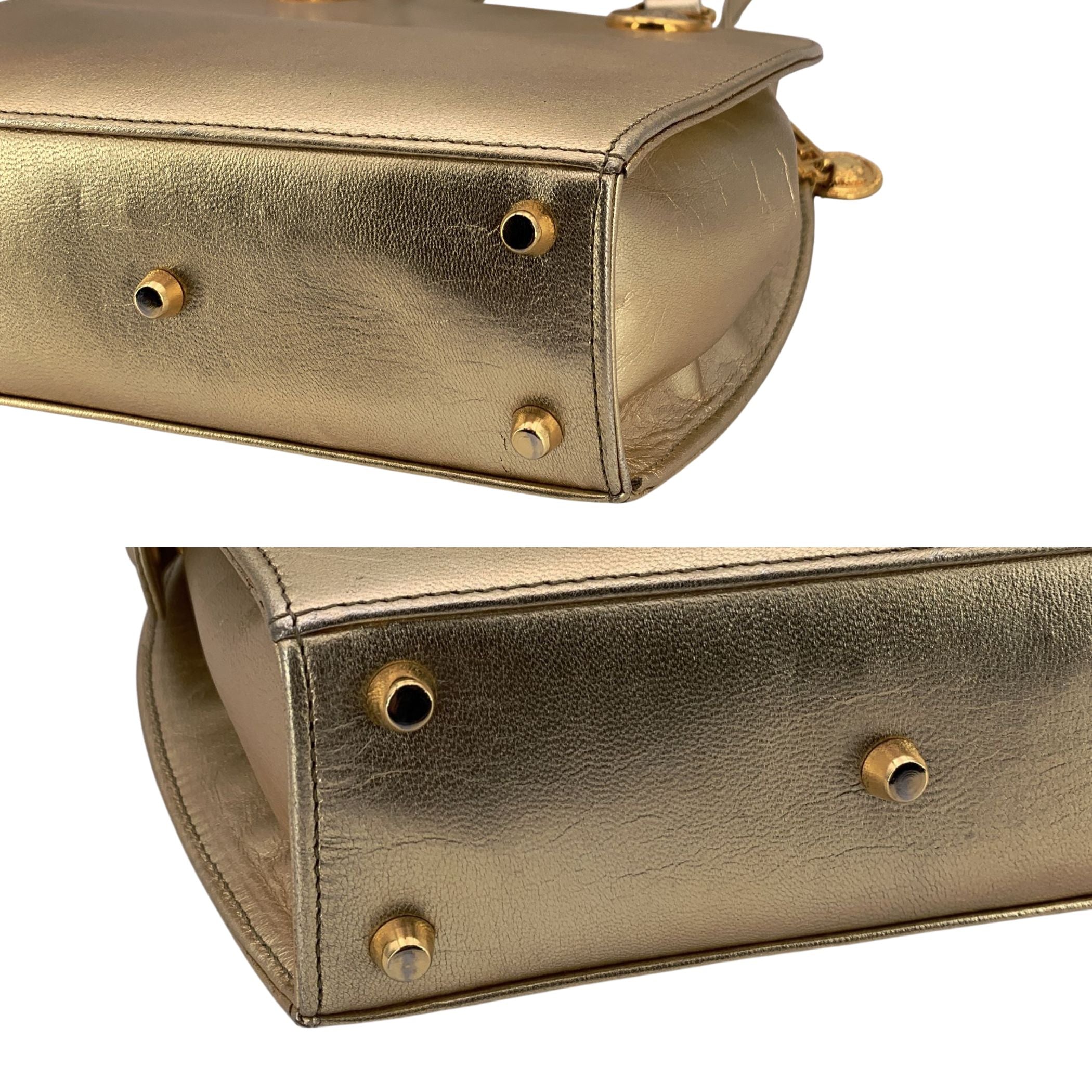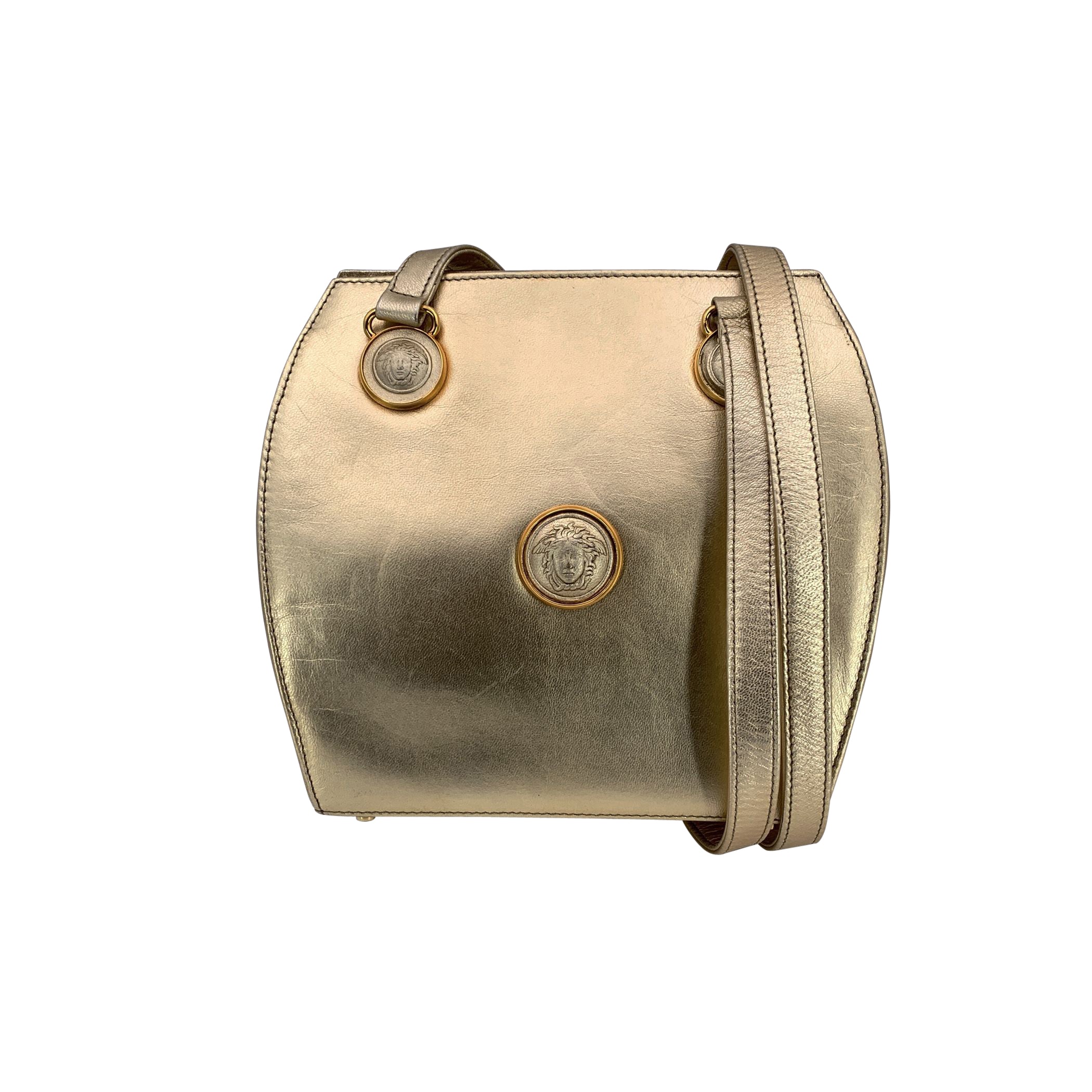 A True Gianni Versace Gem, This Gianni Versace Gold Leather Long Double Straps Shoulder Bag Feels Like a Snapshot Of Italian Glamour At Its Most Confident. Made In Italy Between 1990 And The 1999, It Belongs To That Iconic Era When Versace Leaned Fully Into Gold, Bold Branding, And Sculptural Elegance. Crafted In Solid Gold Leather, The Bag Has a Rich, Luminous Finish That's Beautifully Contrasted By Its Gold Metal Hardware-a Mix Of Glossy And Matte Tones, With Logo Detailing That Catches The Light Without Overwhelming The Design. The Long Double Straps Give It An Elegant Drape On The Shoulder, Very Much In Line With The Sensual, Powerful Versace Woman Of The Time. On The Front, The Raised Emblem Is Indeed The Versace Medusa, Unmistakable And Proudly Displayed-yes, It Is Medusa. Inside, You'll Find a Lined Interior With An Internal Pocket And The "Gianni Versace" Logo, Reinforcing Its Authenticity And Luxury Heritage. The Bag Closes With a Zip, Keeping The Silhouette Clean And Practical. Medium In Size And Unapologetically Glamorous, This Shoulder Bag Is a Perfect Vintage Statement Piece: Bold, Feminine, And Deeply Rooted In Versace's Iconic Visual Language. A Must For Collectors And Lovers Of Early-2000s Designer Fashion.