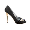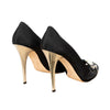 Giuseppe Zanotti peep toe pumps in black satin, featuring crystal embellishment on the upper and a striking golden heel.