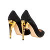 Crafted in Italy, these black suede pumps feature a bold bolt-shaped heel, pointed toes, and gold-tone hardware, making a striking statement with every step.