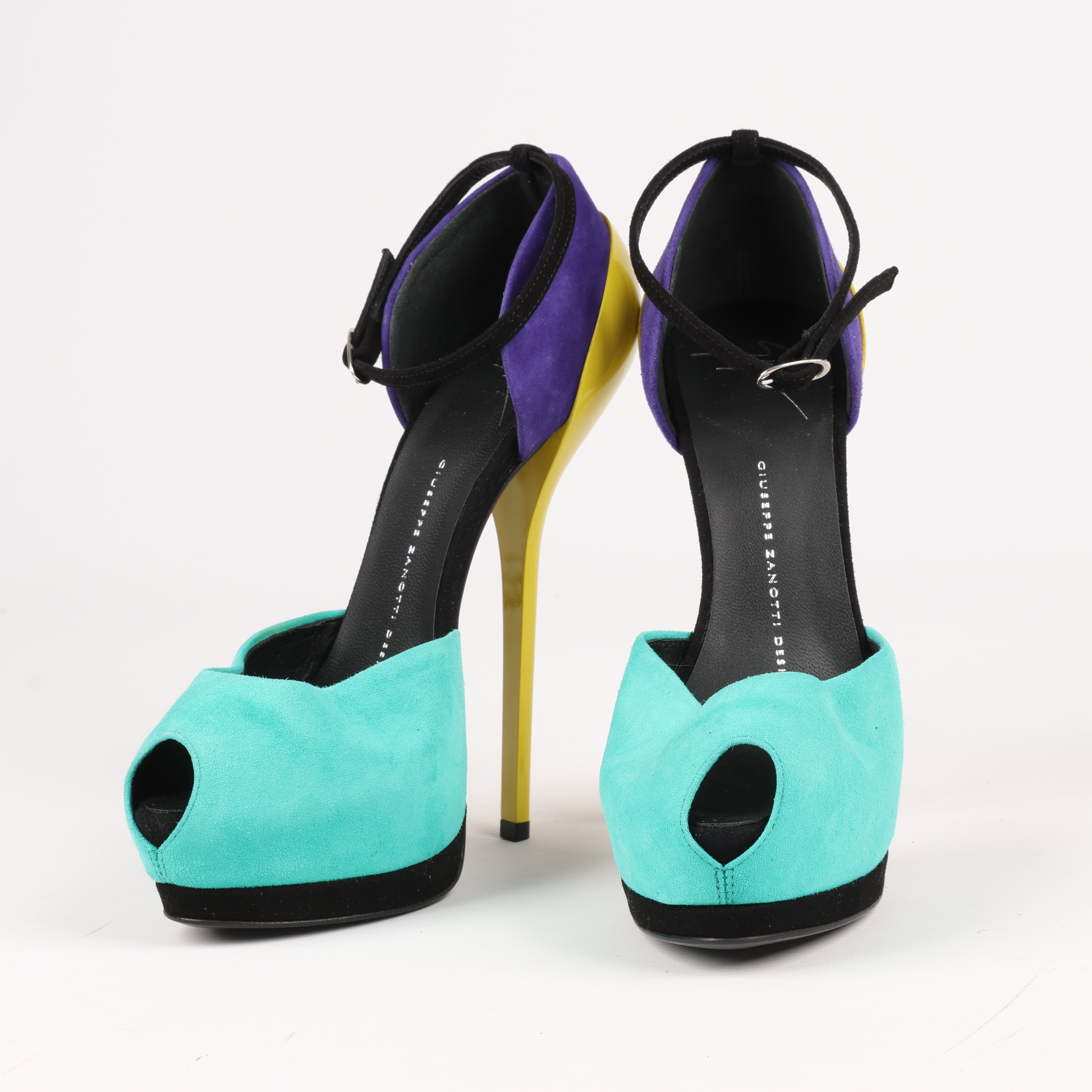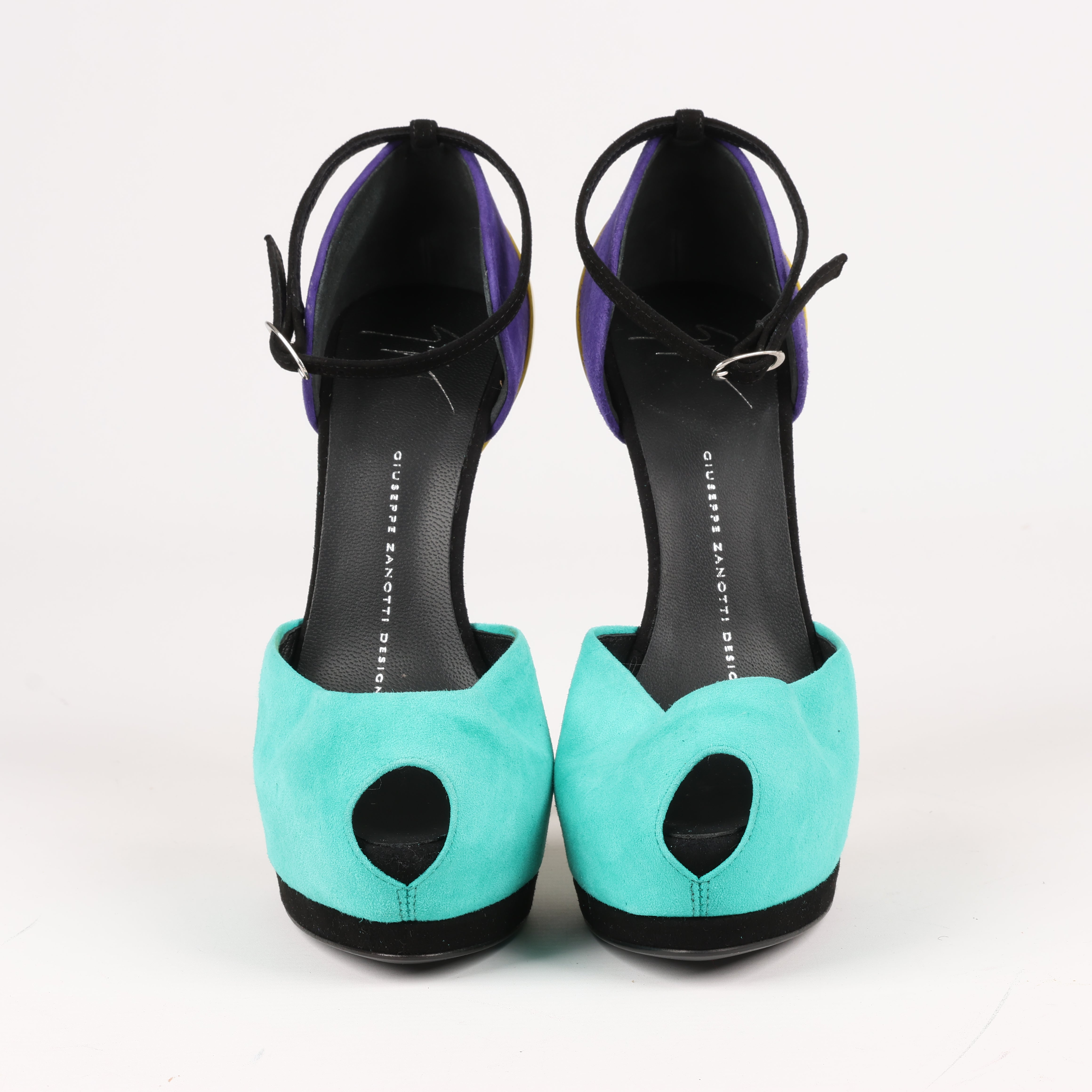 Giuseppe Zanotti suede colorblock D'Orsay pumps featuring bold turquoise, purple, and yellow hues with a striking stiletto heel and peep toe. A playful yet sophisticated statement for vibrant, high-fashion looks.Brand: Giuseppe ZanottiGender: WomenSize: 37 EUHeel Height: 12 cm Platform: 4 cmCondition: Very goodCondition Details: Pre-Owned. Lovingly worn with a lot of life left in them.Main Colour: MulticolorColours: Yellow, Turquoise, Purple, BlackMain material: SuedeMaterials: LeatherProduct Code: -Manufactured In: ItalyComes With: Dustbags