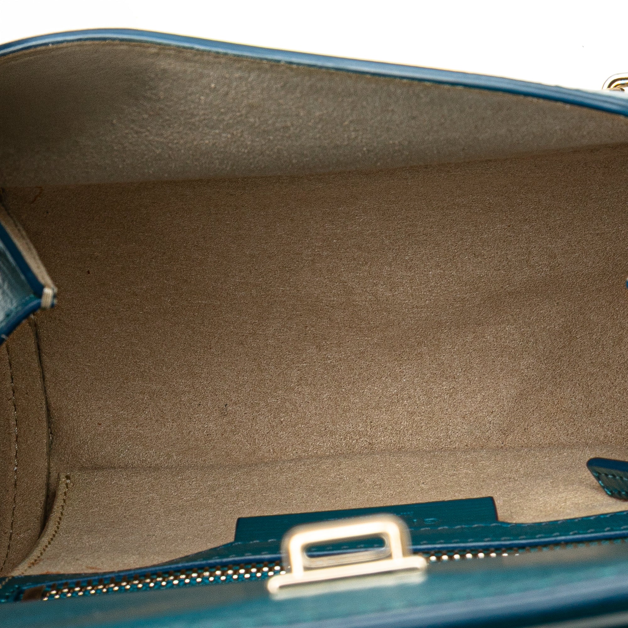 The Pandora Box crossbody features a leather body, an adjustable flat leather strap, a front flap with push lock closure, an exterior zip pocket, and an interior zip pocket. Retail Price: 1950.00