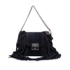 The GV3 features a suede leather body, a silver-tone chain strap, a detachable flat leather strap, a front flap with a metal lock closure, and interior slip compartments. Inclusion: Dust bag. Retail Price: 890.00