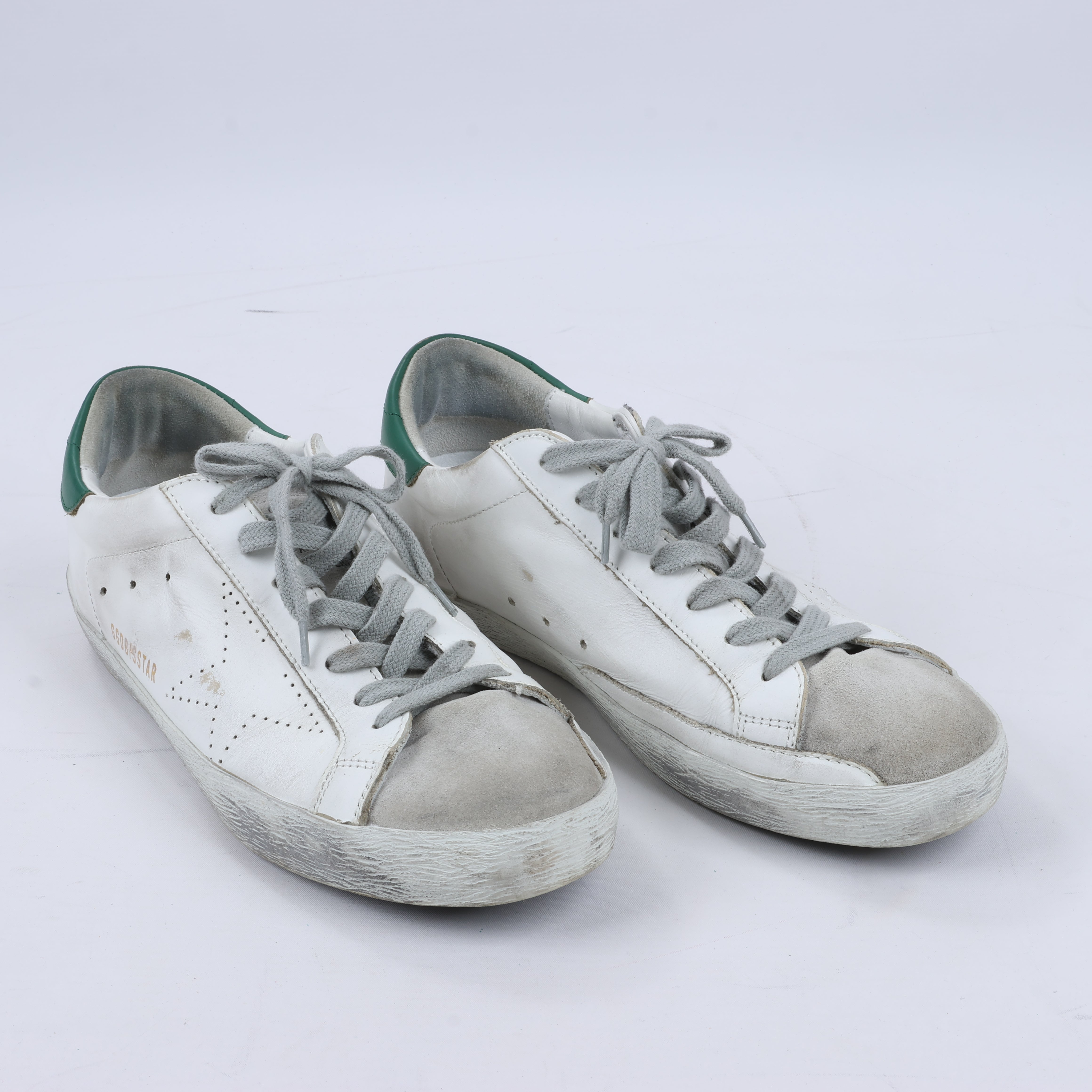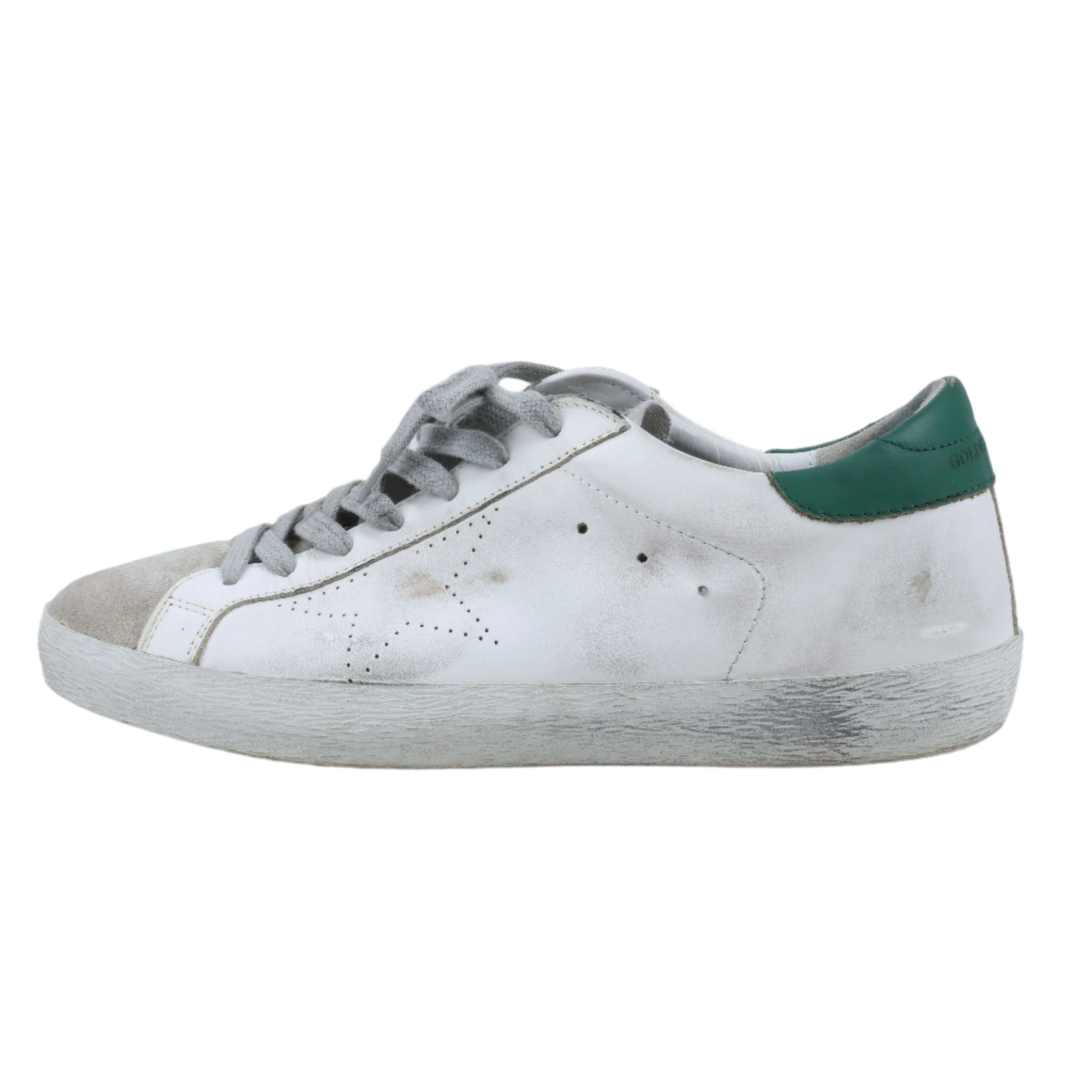 Stylish Golden Goose Superstar sneakers in size 40 EU, crafted in white leather with signature distressed details. Accented by a green heel tab and grey suede toe cap for a casual yet refined look. Perfect for adding a touch of effortless cool to everyday outfits!