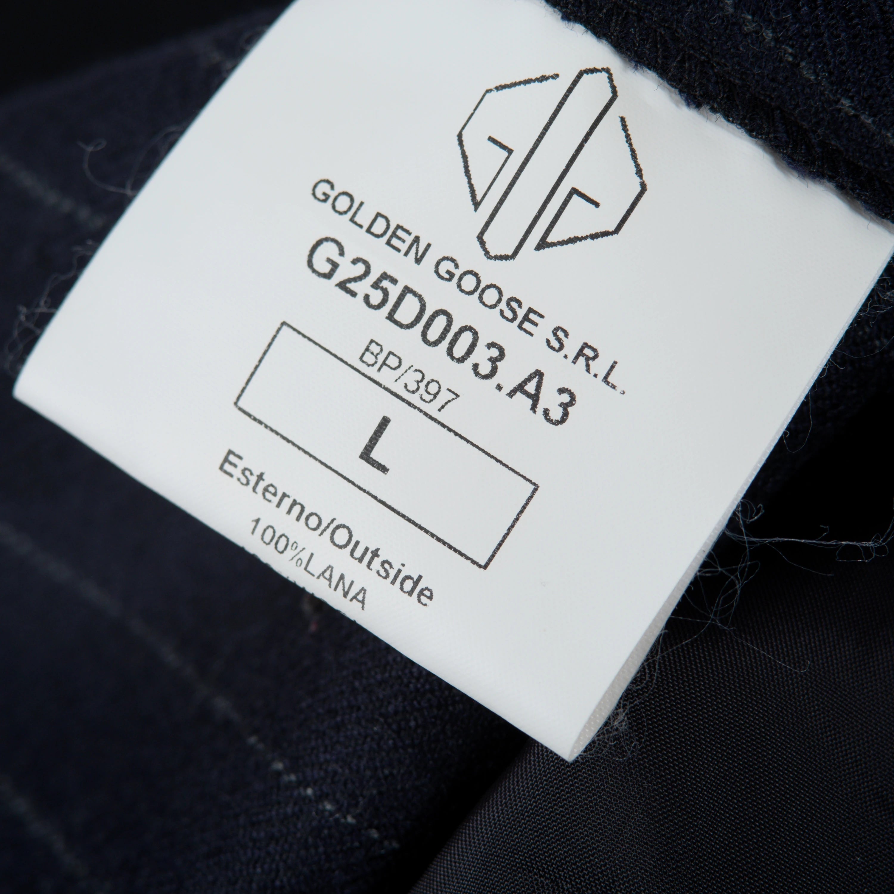 Upgrade your wardrobe with Golden Goose’s refined pinstripe tailored trousers. The deep navy tone and straight, structured fit offer a polished, modern silhouette. Crafted in Italy from pure wool, these elegant cigarette-style pants deliver comfort, versatility, and timeless sophistication for both work and elevated everyday looks.
